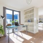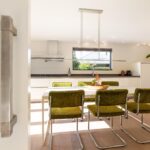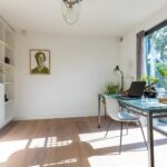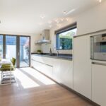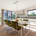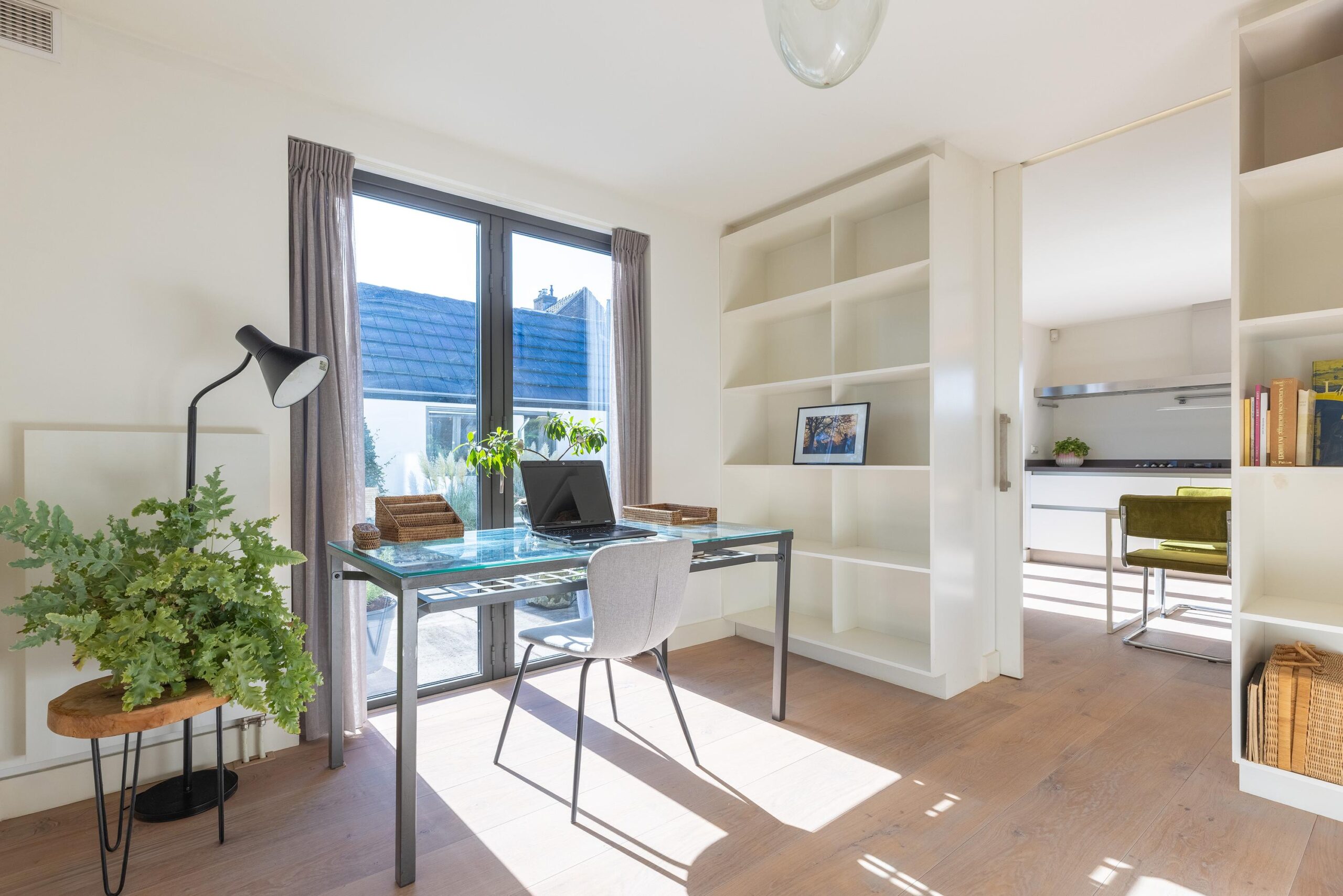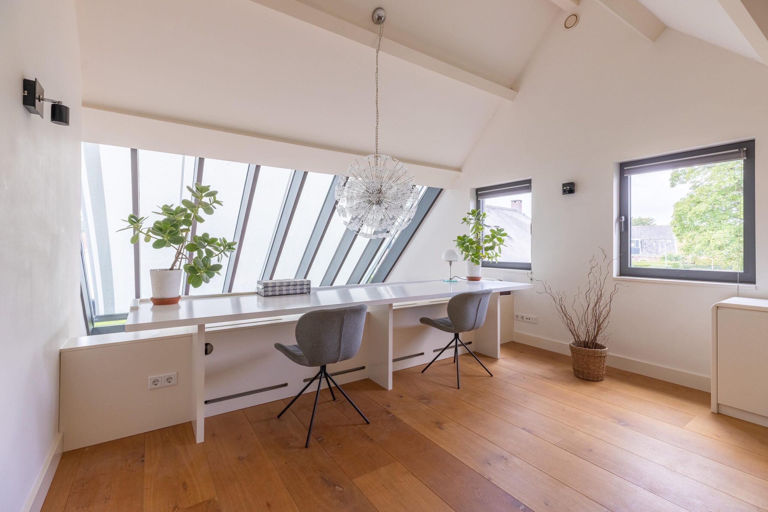 De keuken is ruim opgezet met diverse apparatuur en heeft een vouw-/schuifpui naar het zijterras. Tevens is hier de entree naar de werkkamer/slaapkamer.