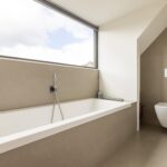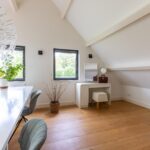 Overloop, één grote slaapkamer met inloopkast en inpandige badkamer voorzien van ligbad, toilet, dubbele wastafel en inloopdouche.