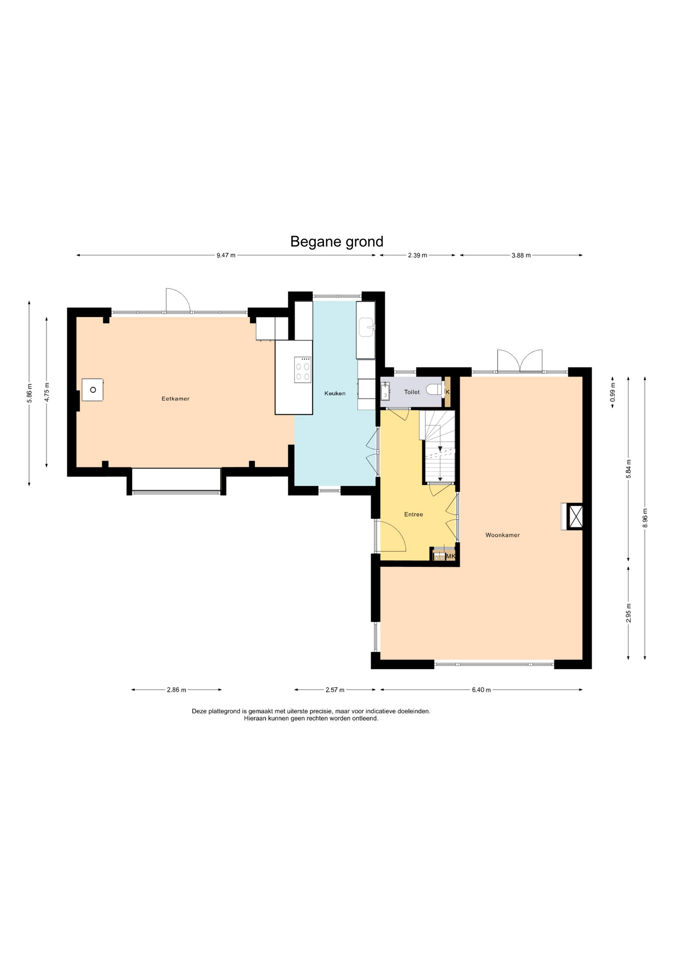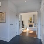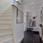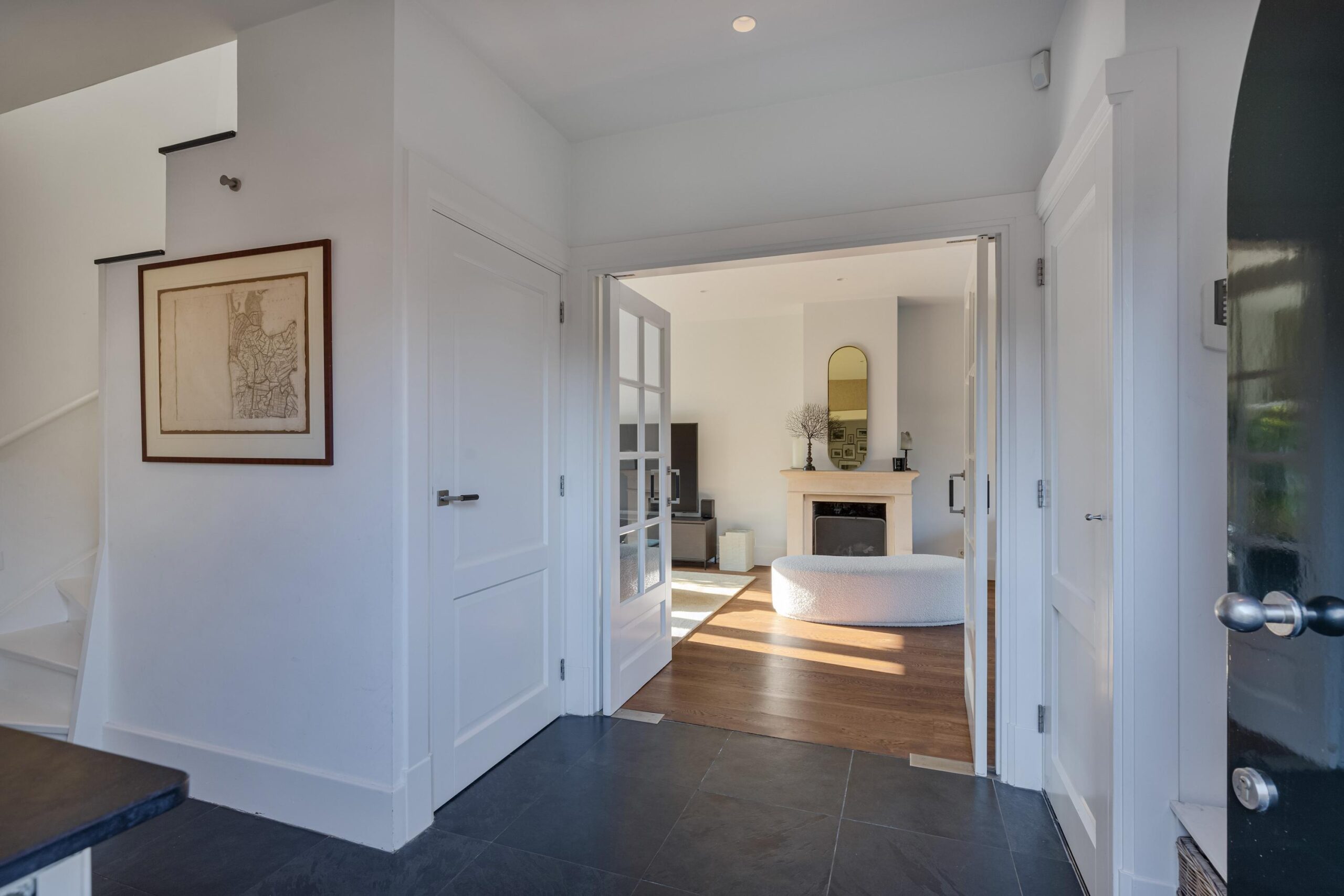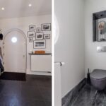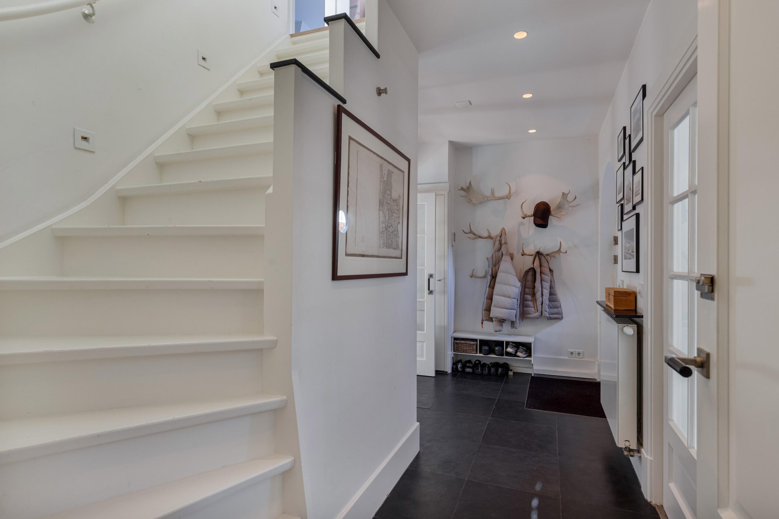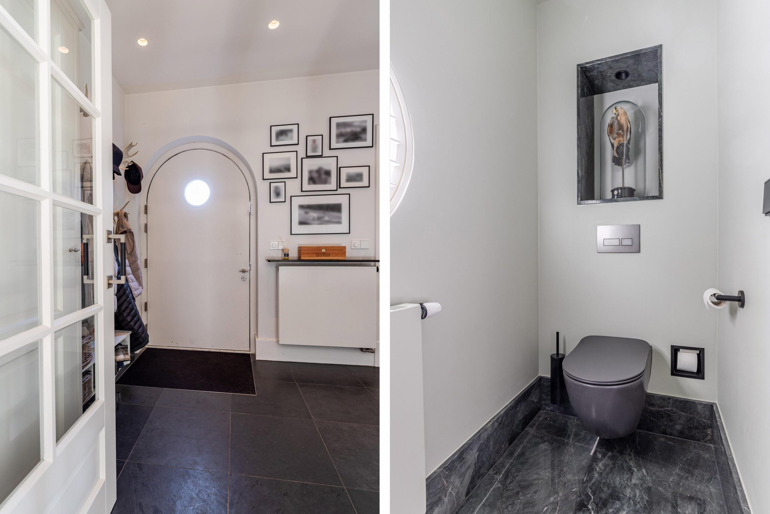 Entree, Hal, trap naar de kelder, modern toilet met fontein, openslaande deuren naar de woonkamer.