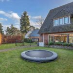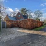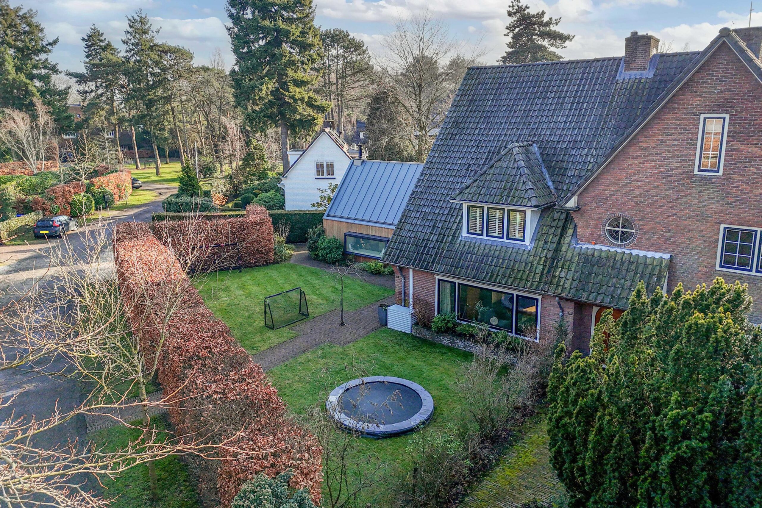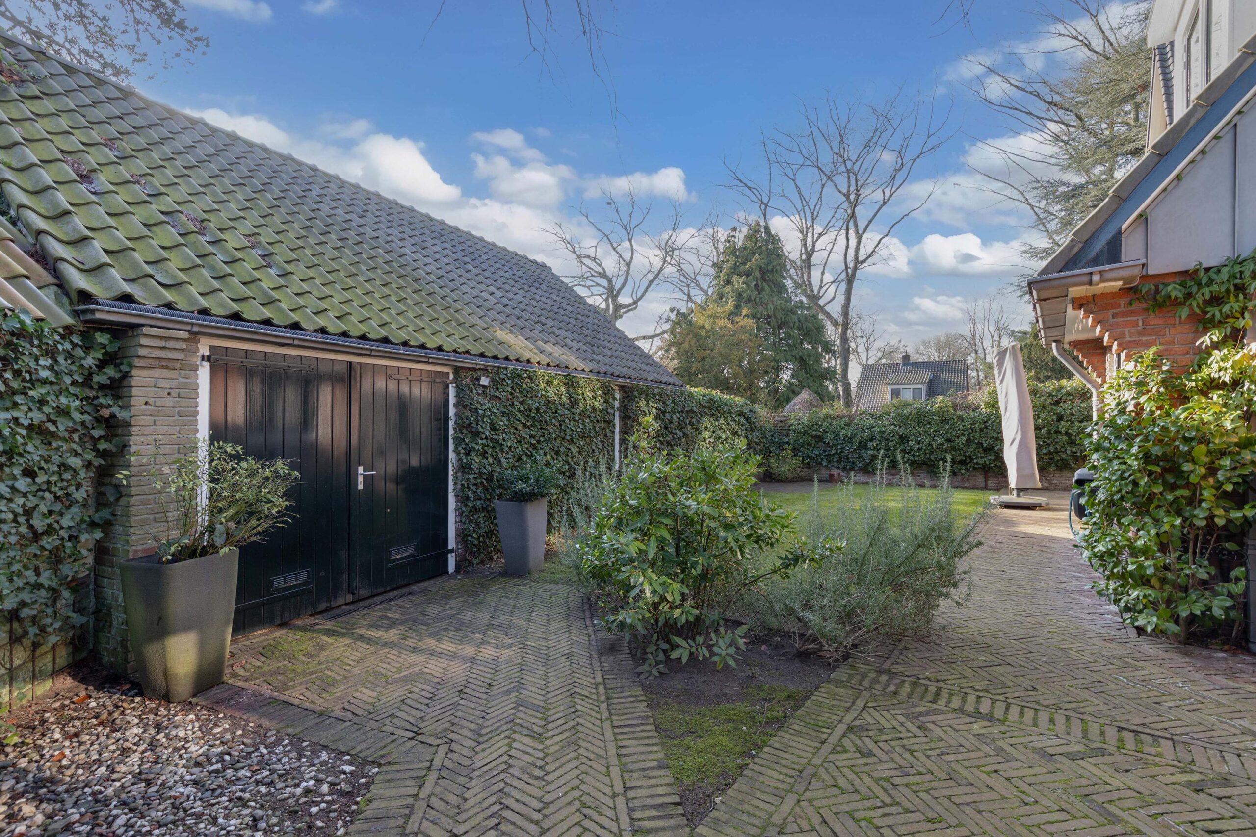 De voortuin beschikt over twee parkeerplaatsen op eigen terrein die zijn afgescheiden door een volle beukhaag van de fraai aangelegde tuin. De voortuin heeft een grasveld met ingebouwde trampoline. De besloten achtertuin met groene haag is bereikbaar via een poort en beschikt over een ruime berging en veel privacy.