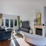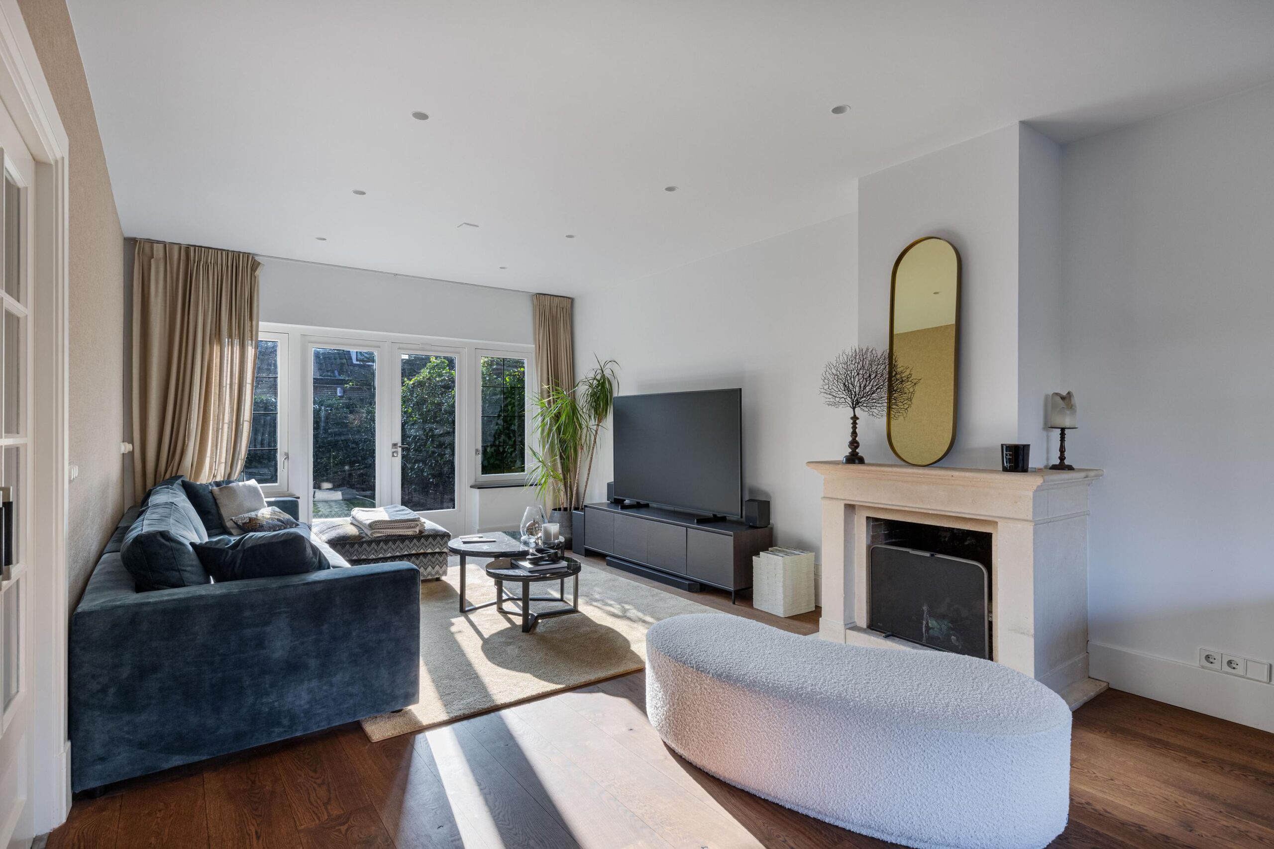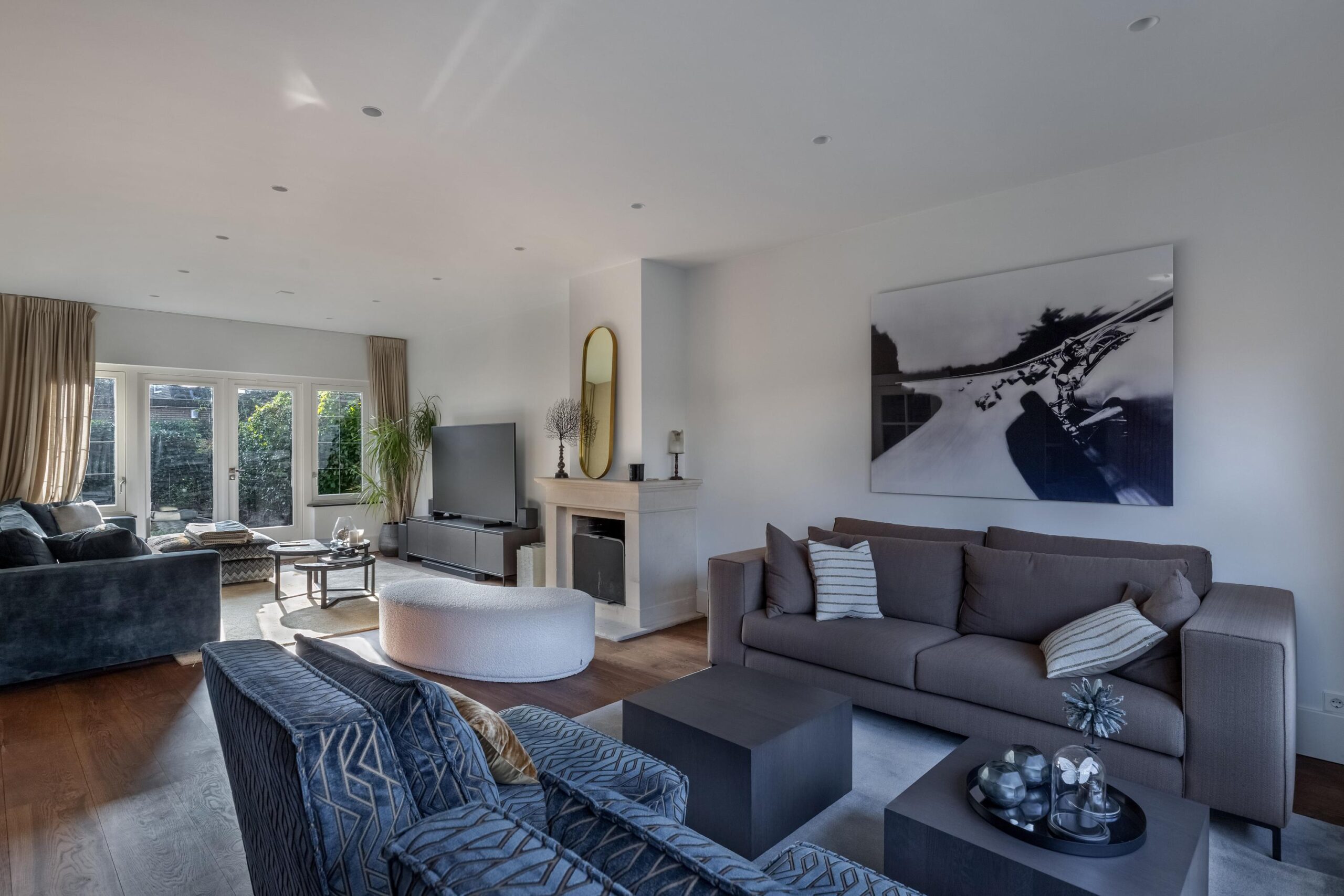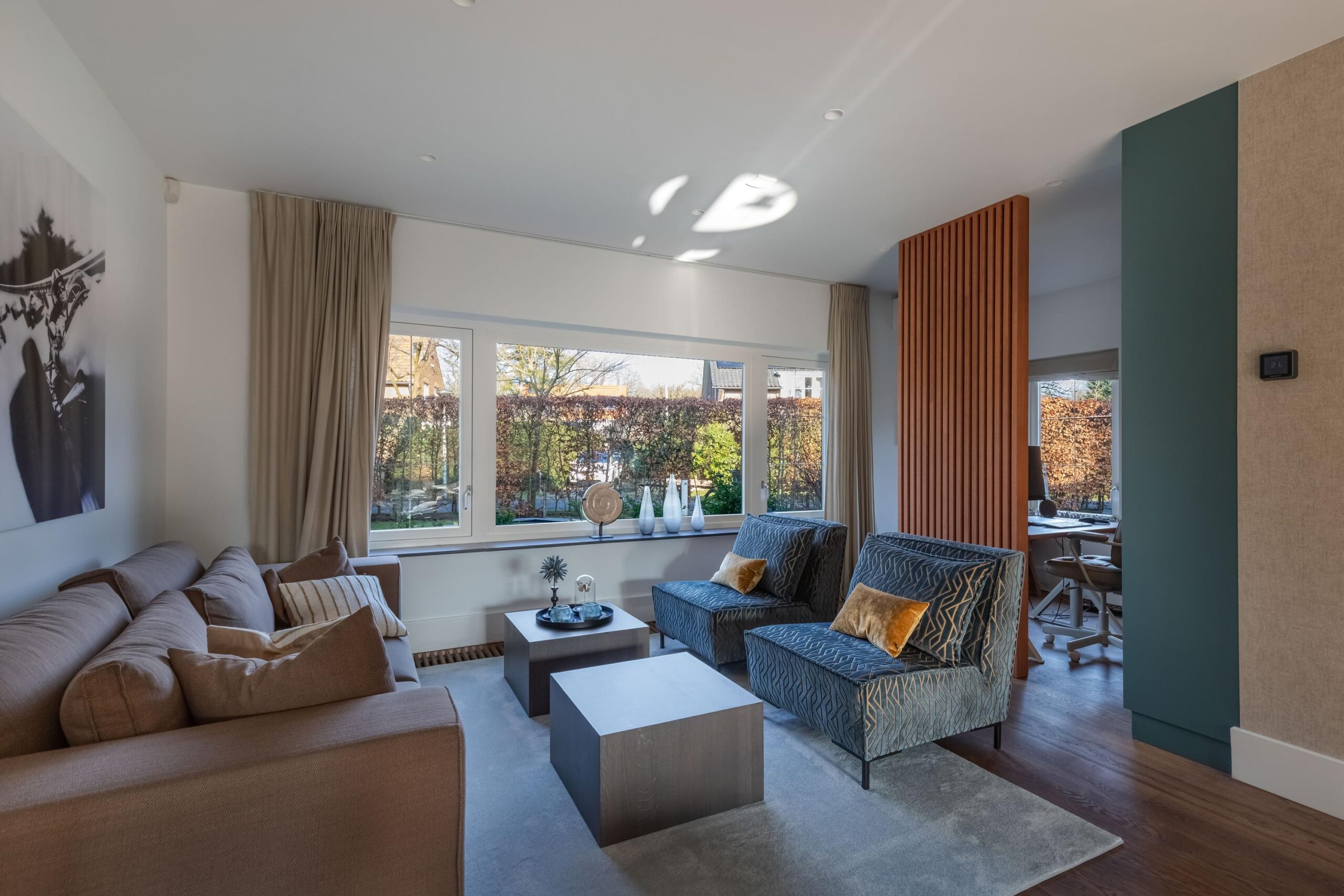 Woonkamer beschikt over een open haard, twee zithoeken, een half open werkkamer met uitzicht op de ruime voortuin en openslaande deuren naar de achtertuin.