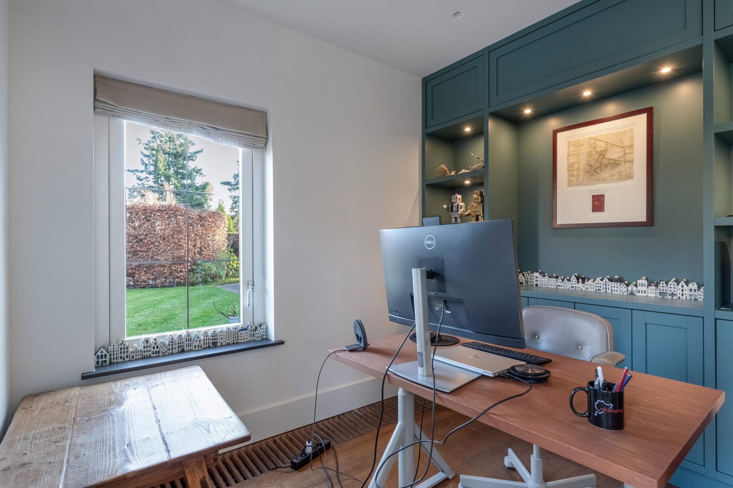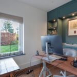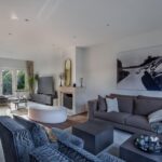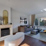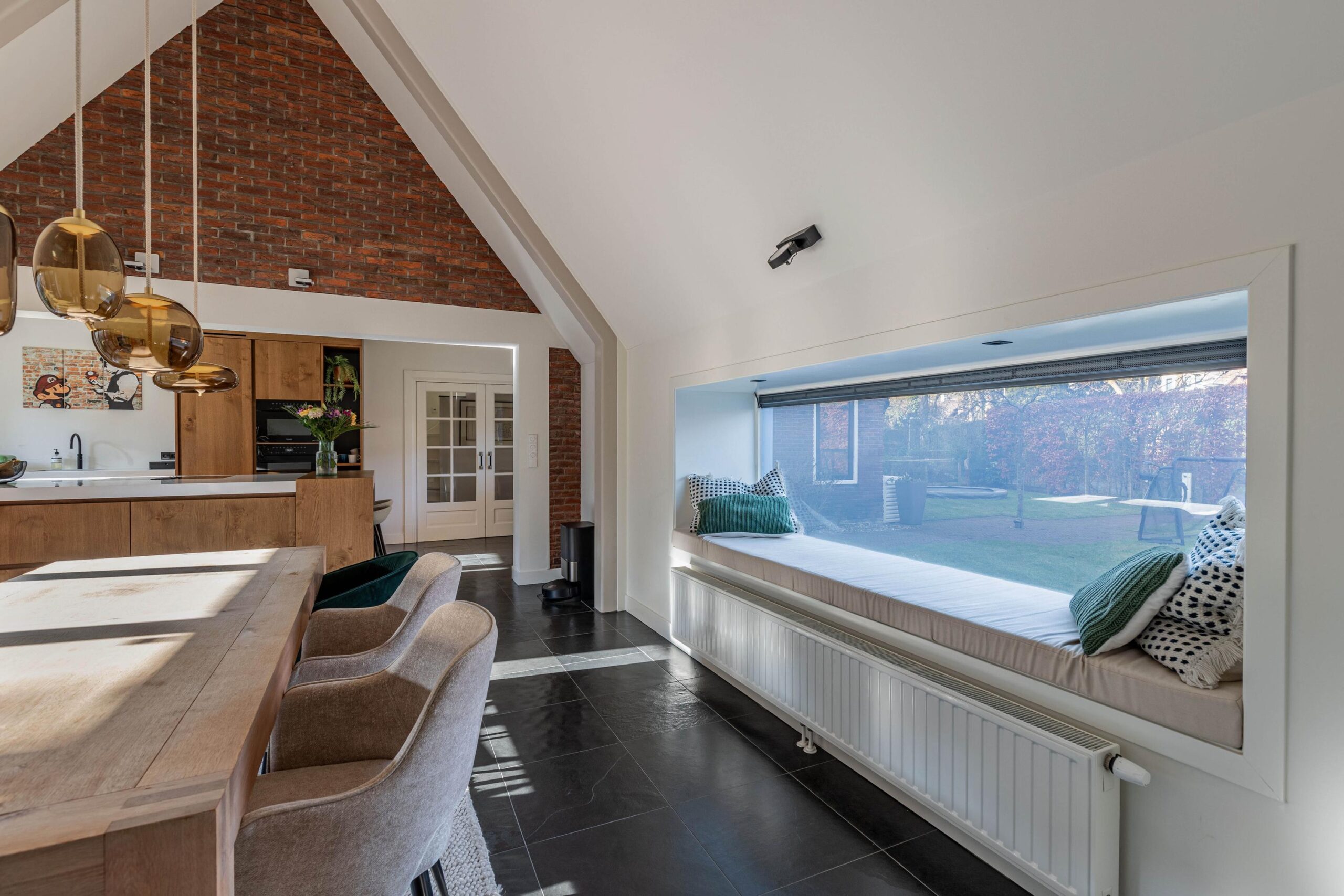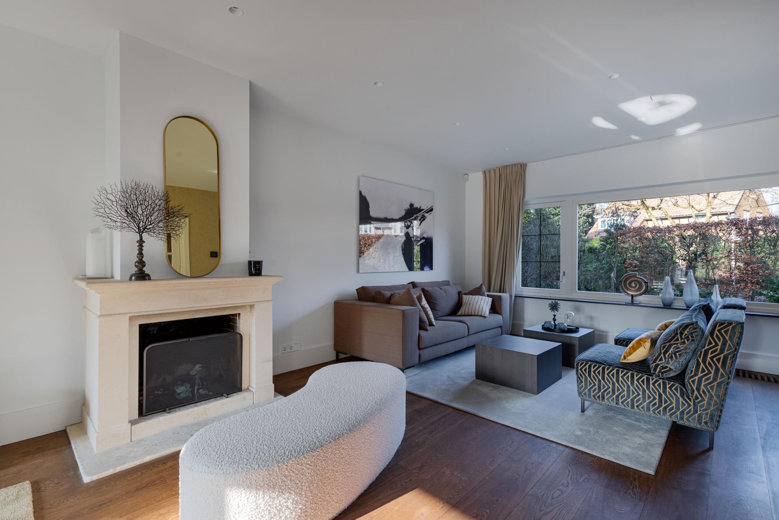 Woonkamer beschikt over een open haard, twee zithoeken, een half open werkkamer met uitzicht op de ruime voortuin en openslaande deuren naar de achtertuin.
