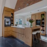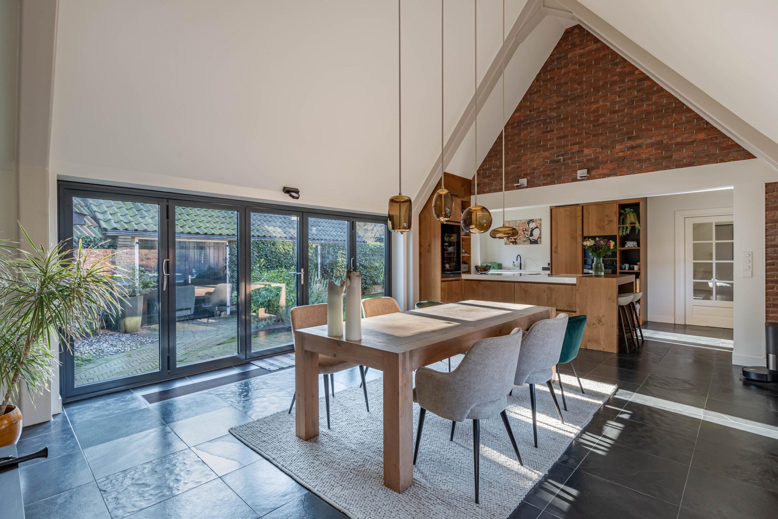 Vanuit de hal is de in 2019 aangebouwde ruime keuken te betreden. Deze keuken heeft een prachtige uitstraling, hoog plafond, warme houtkachel en een schuifpui over de gehele lengte aan de tuinzijde. Door gebruik van moderne techniek beschikt het raam naar de voortuin over elektrisch geblindeerd glas.