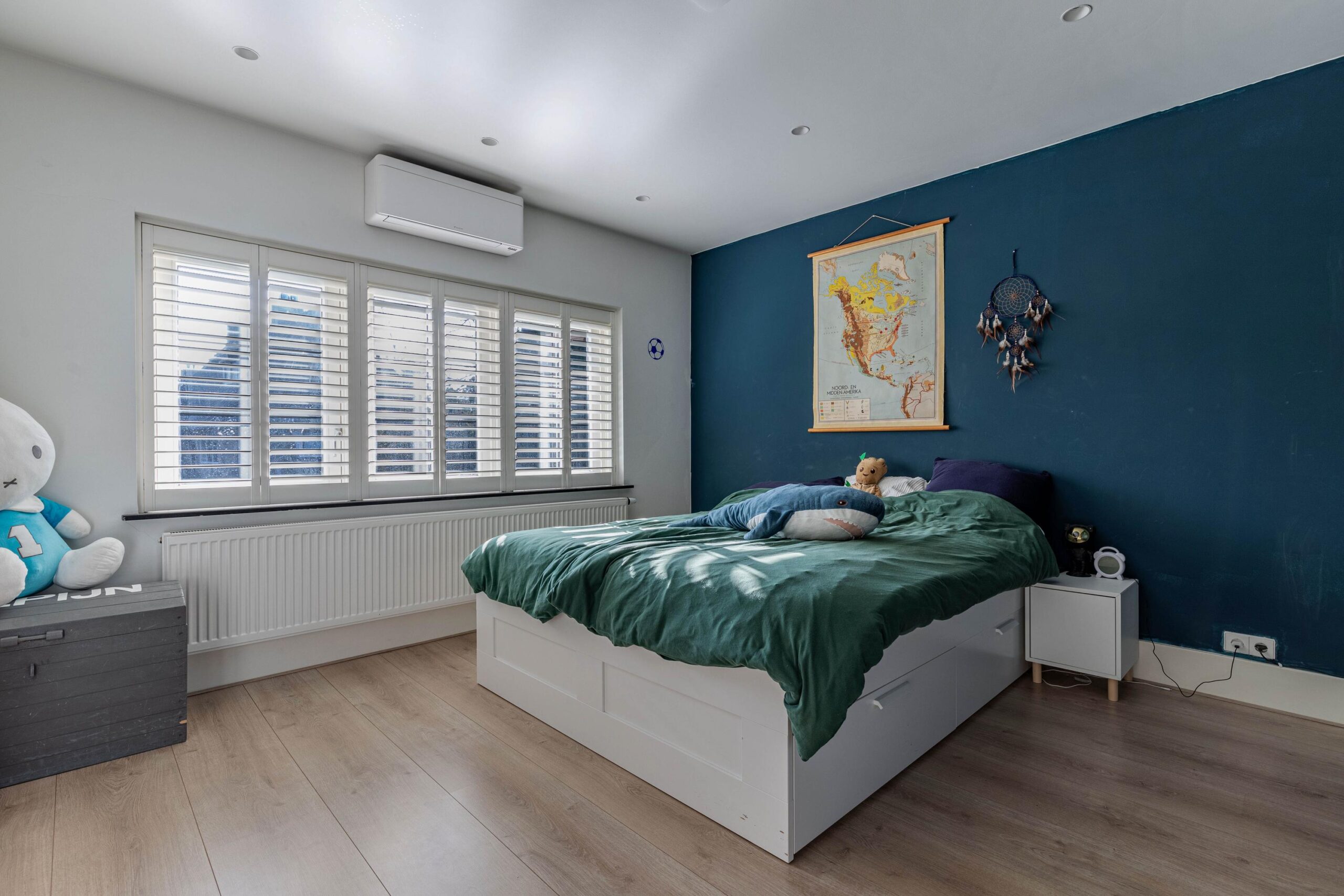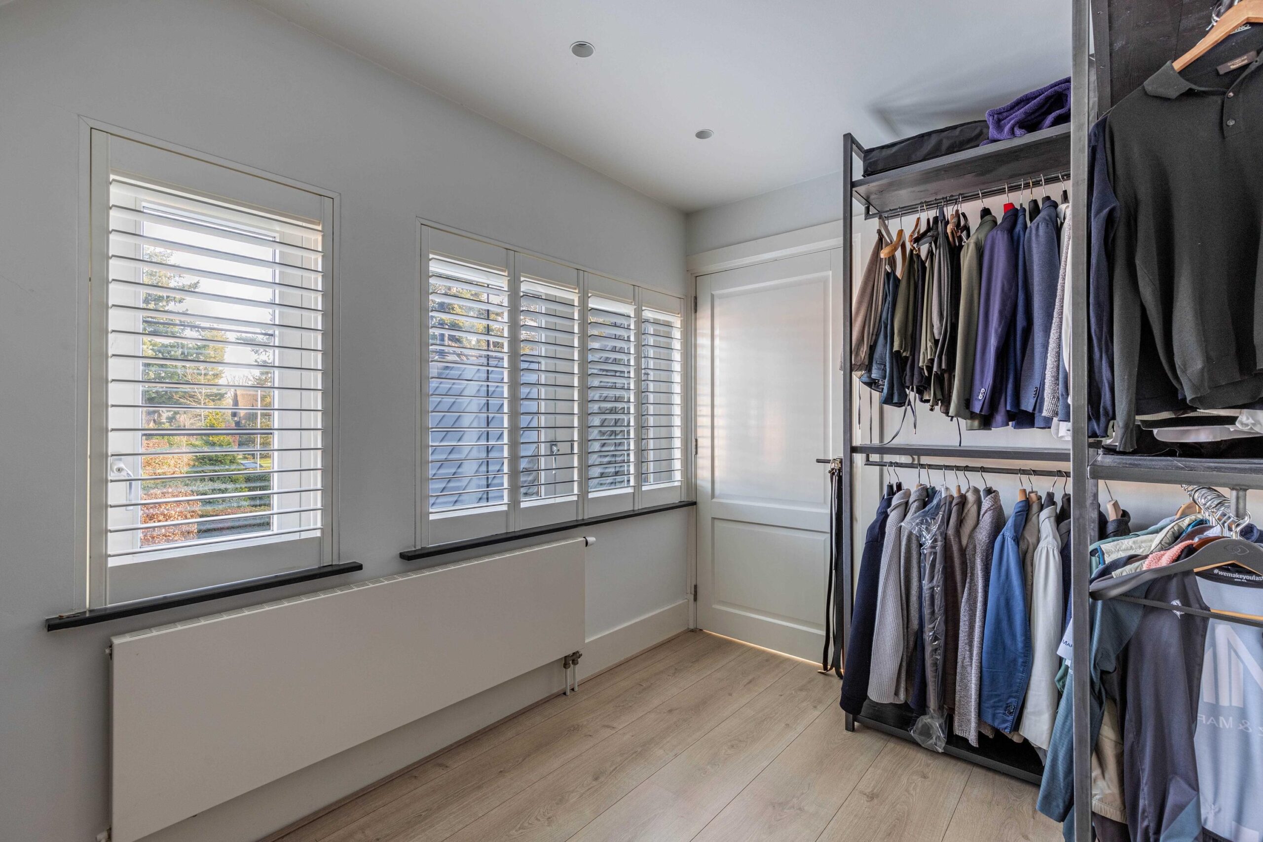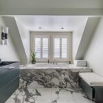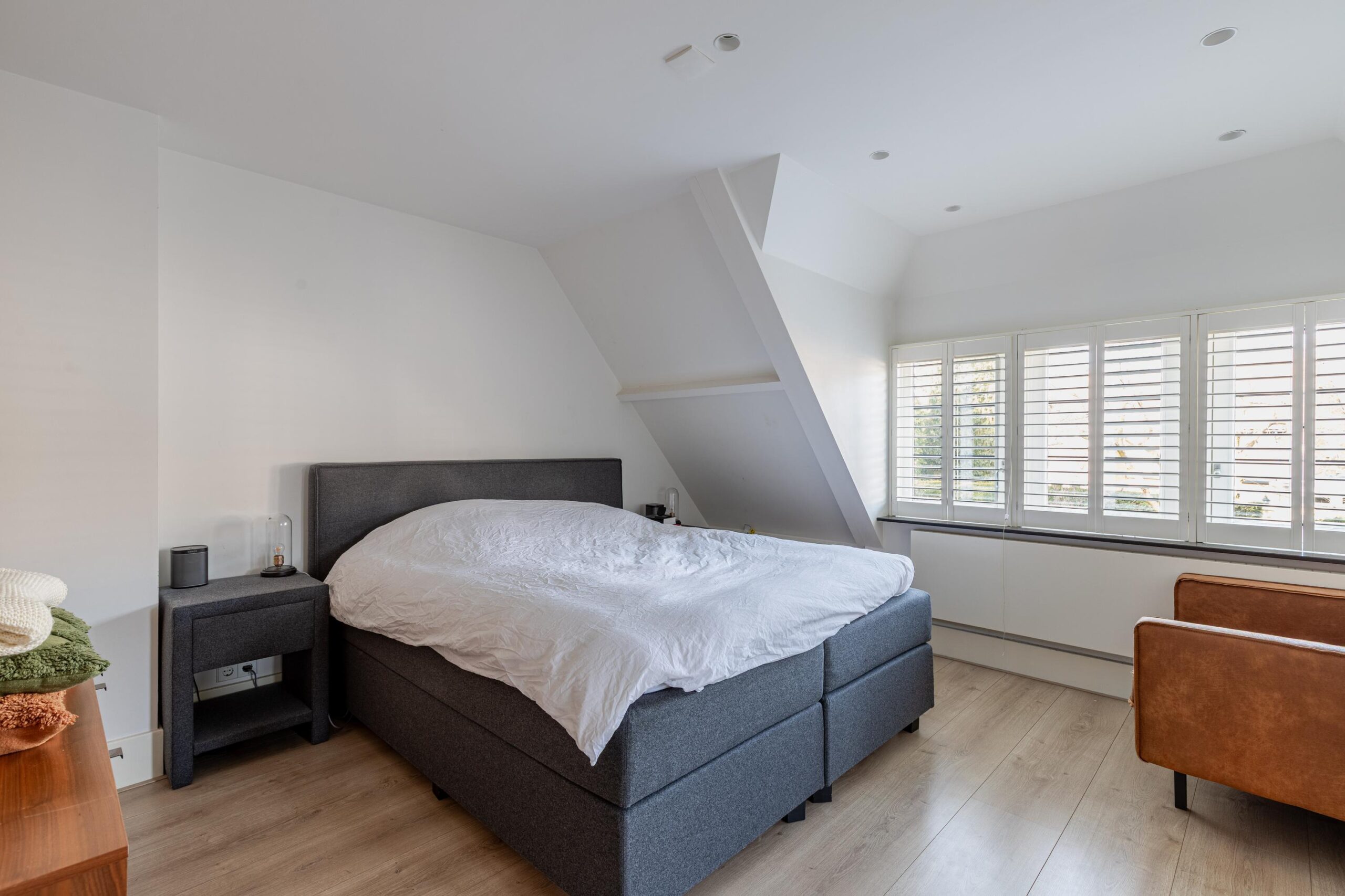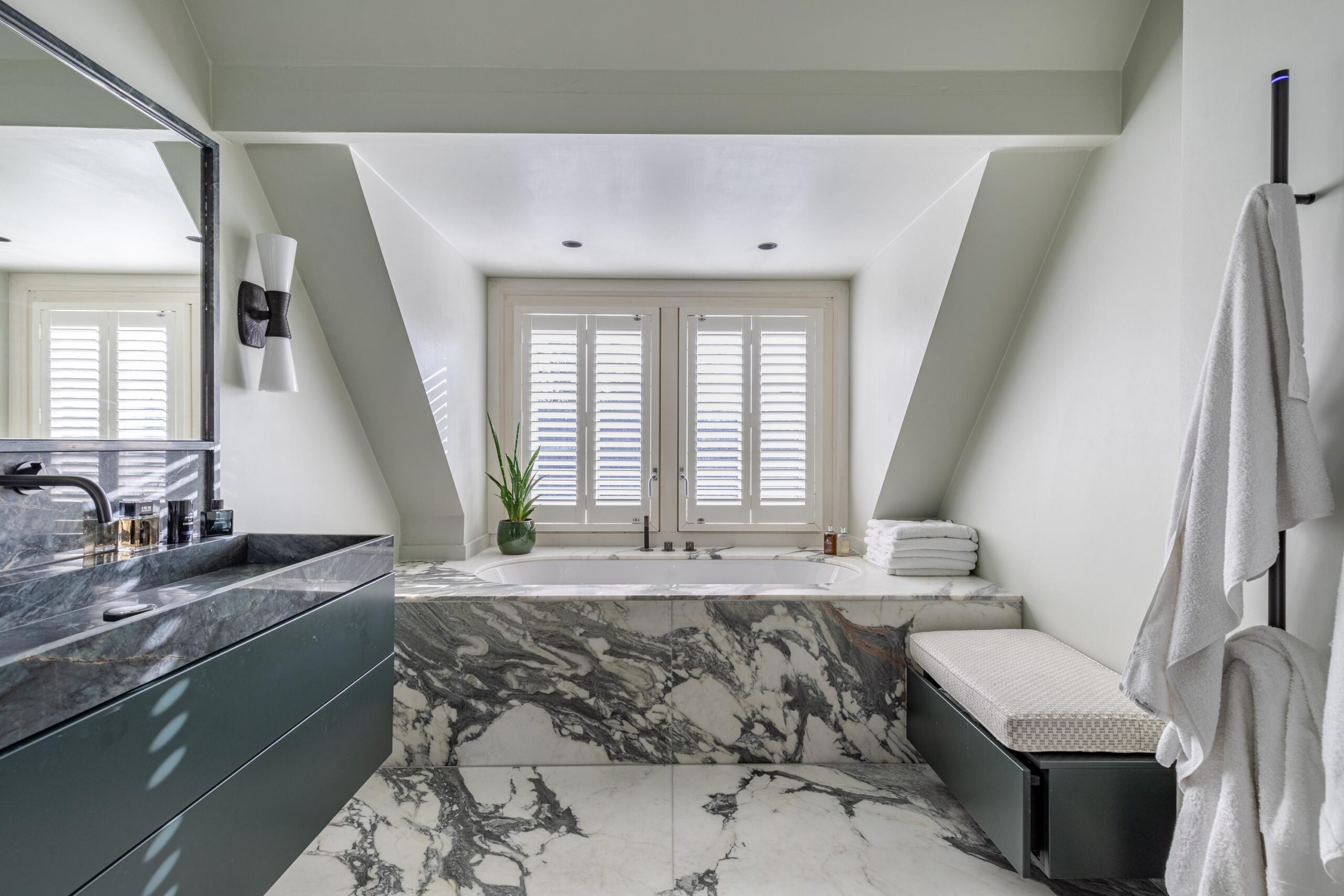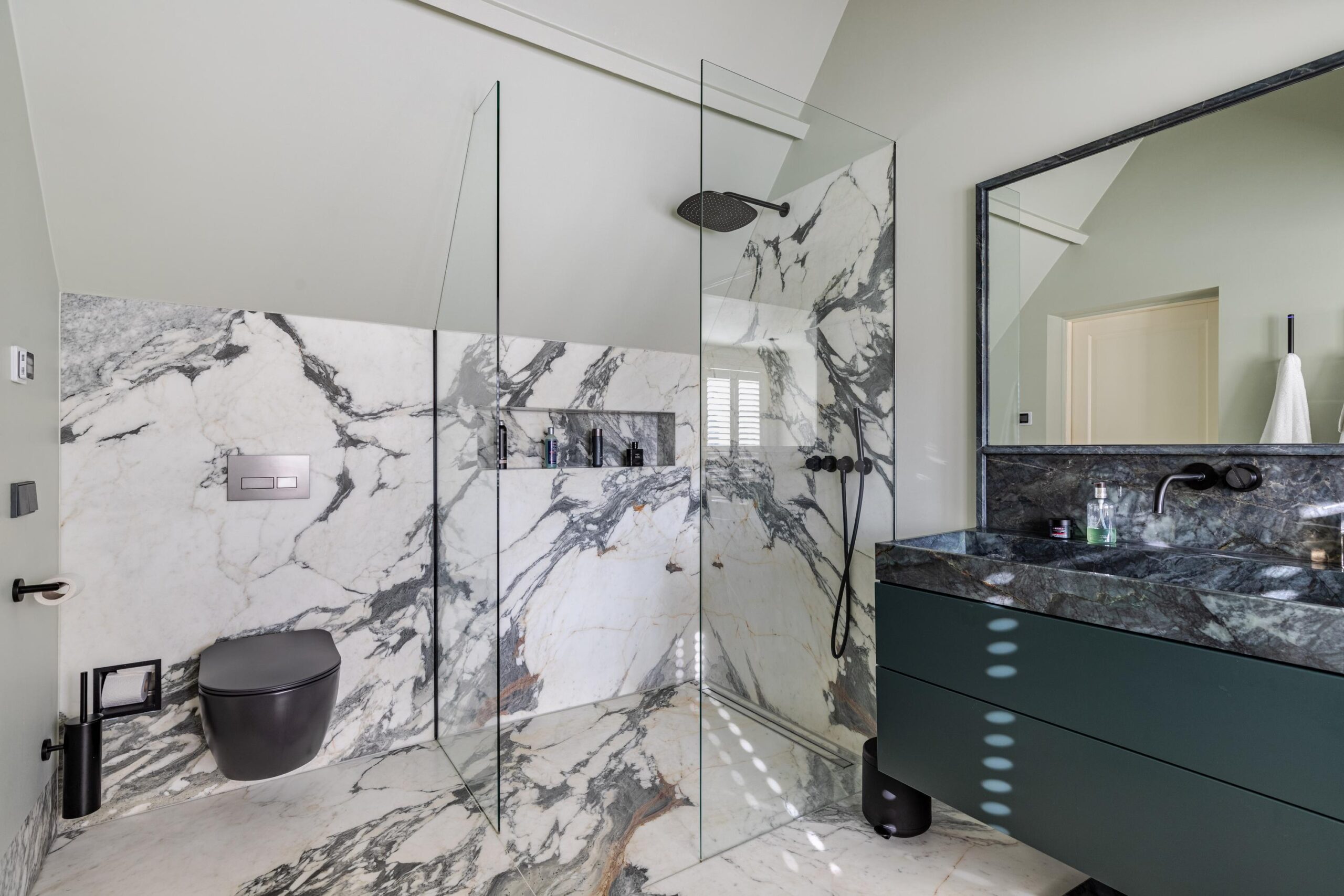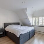 Overloop, ruime slaapkamer aan de achterzijde met airco en inbouwkast, ruime slaapkamer met doorloop naar een inloopkast, voorheen een slaapkamer. Gemoderniseerde badkamer uit 2022 met vloerverwarming, een heerlijk ligbad, wastafelmeubel, inloopdouche, toilet en handdoekradiator. De vloer en wanden zijn in Arabescato Verde marmer en quartz uitgevoerd.