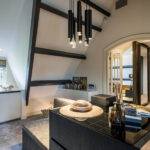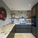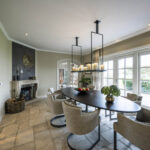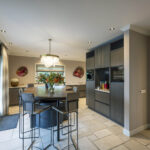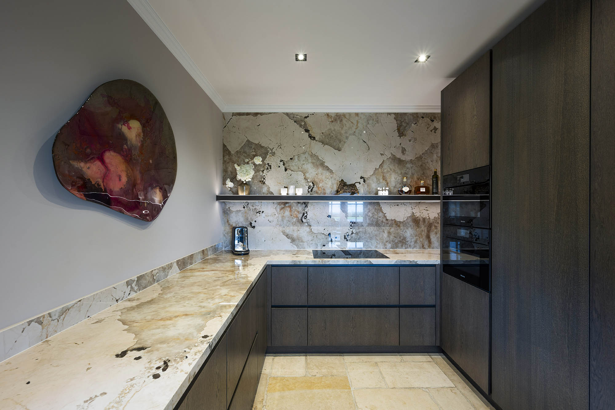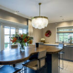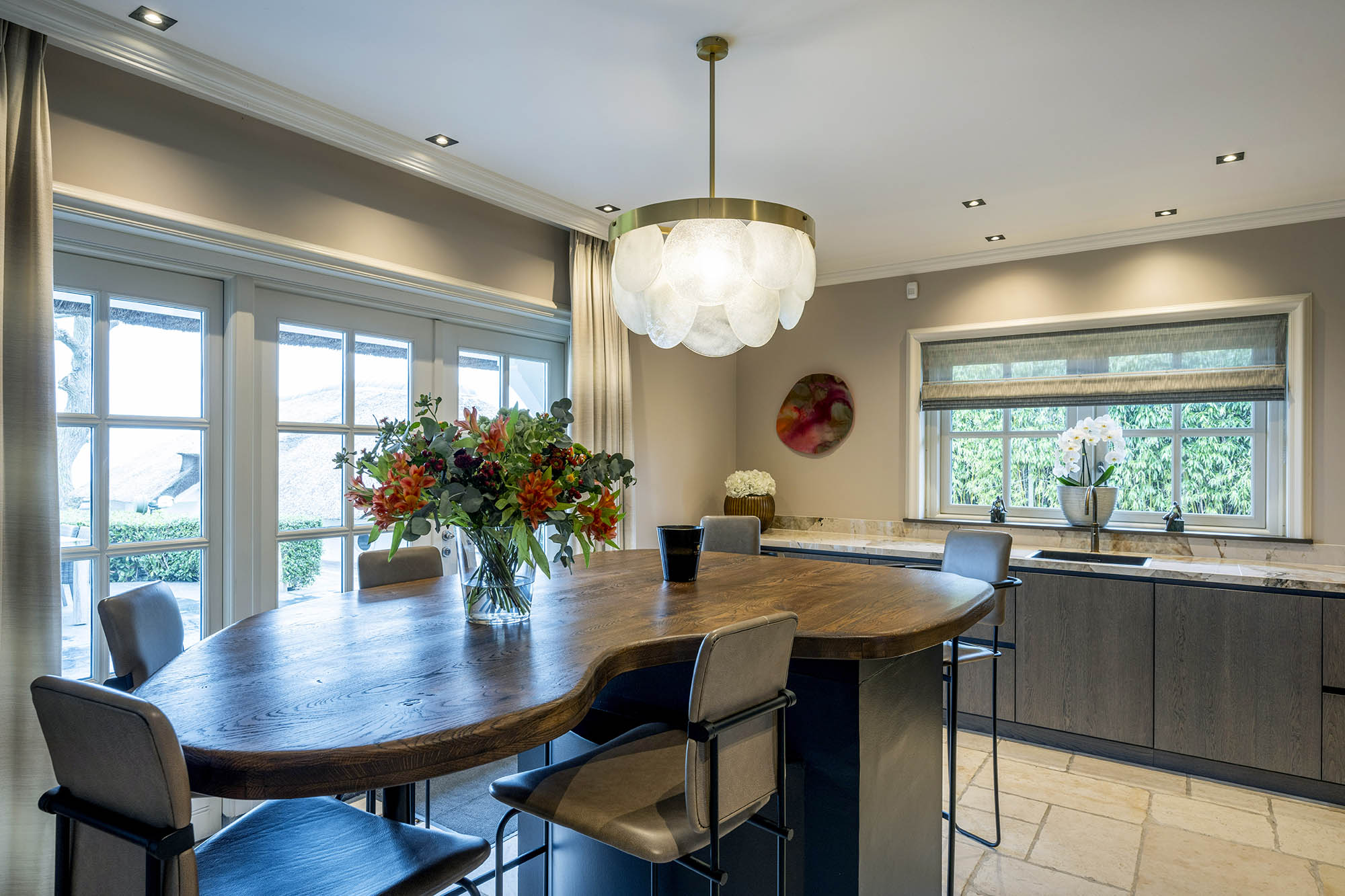 De leefkeuken met meer dan voldoende werkruimte is een echte eyecatcher en voorzien van alle denkbare inbouwapparatuur. In het midden staat een grote bar die het hart vormt van deze gezellige ruimte – ideaal voor dagelijks gebruik, of om aan te schuiven tijdens het koken. Direct grenzend aan de keuken bevindt zich de eetkamer, die dankzij de open haard een warme, uitnodigende sfeer heeft. Een plek waar lange diners, familieontbijten en knusse avonden vanzelfsprekend worden. Grenzend aan de keuken bevindt zich nog een ruime bijkeuken.