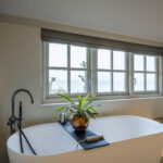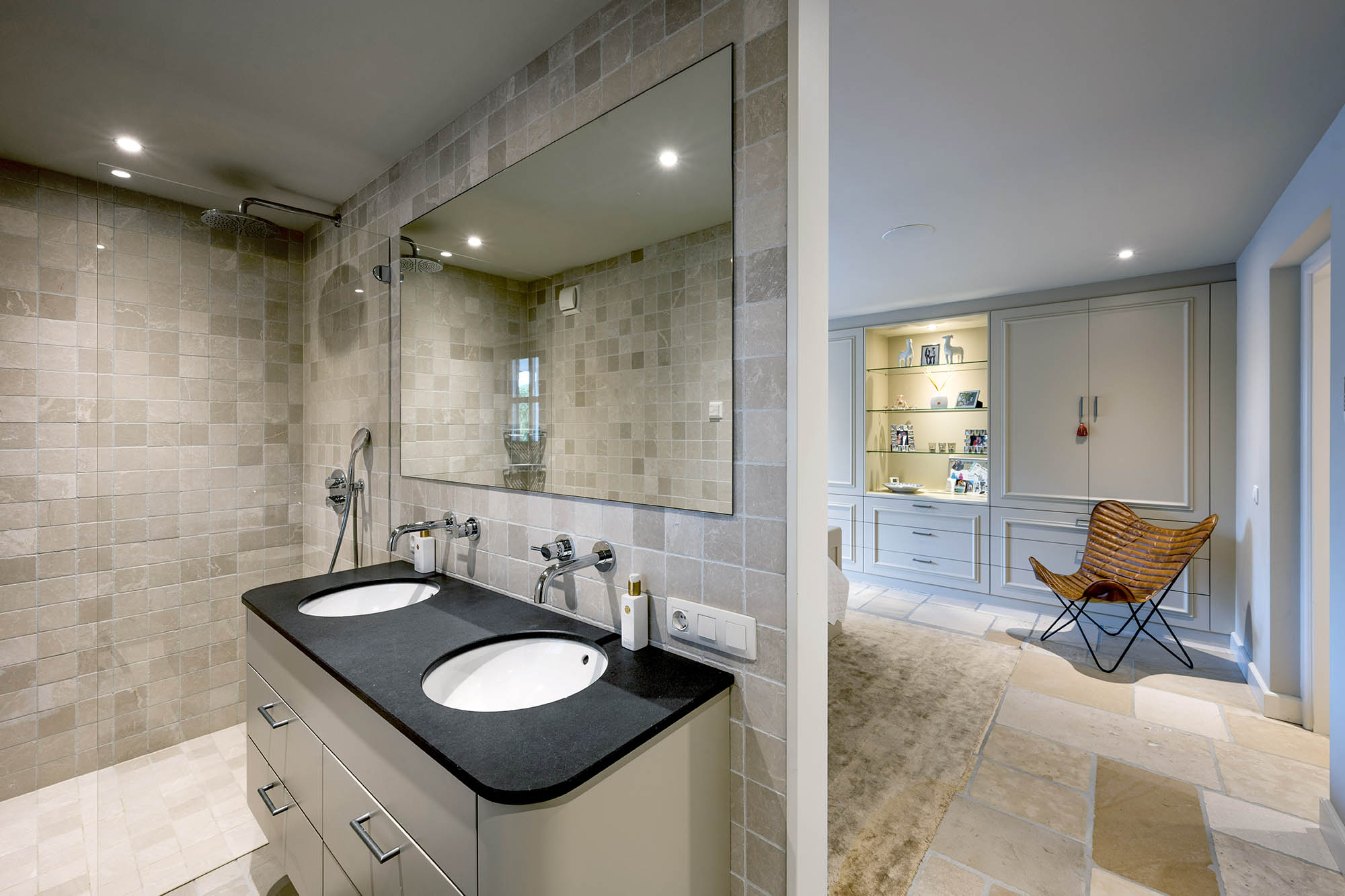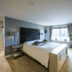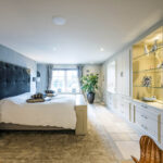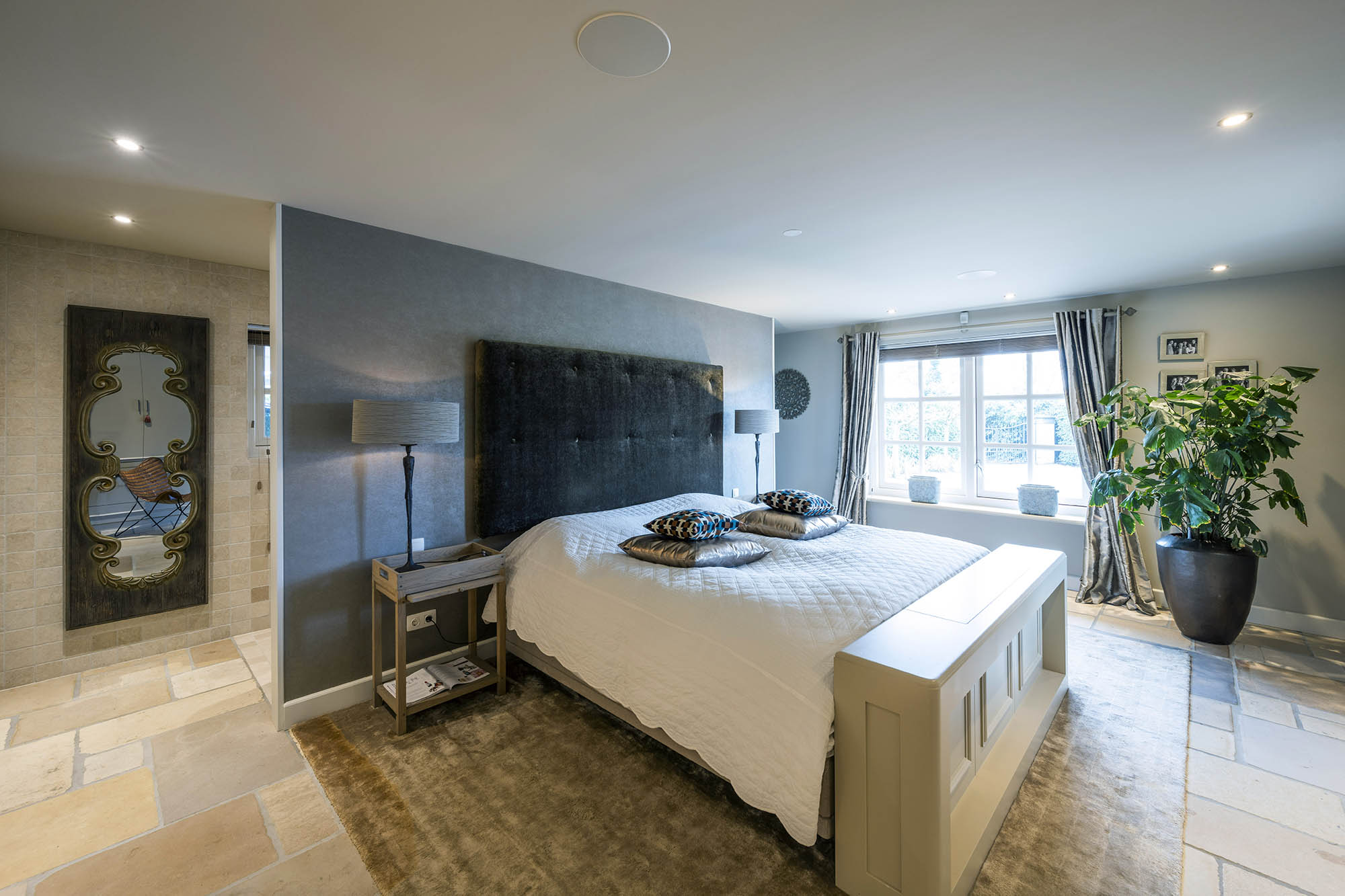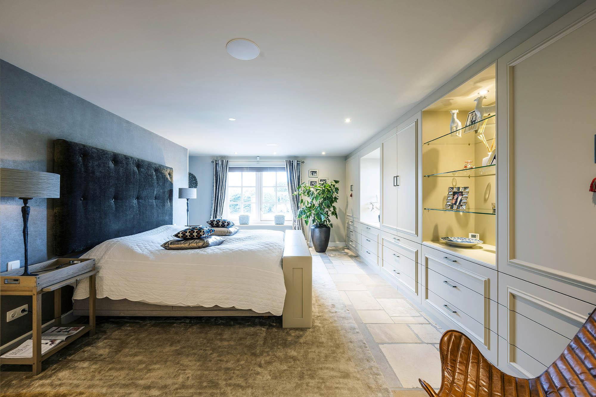Aan de voorzijde van de woning bevindt zich een volwaardige slaapkamer met aangrenzende luxe badkamer. Deze master bedroom is compleet uitgerust met ligbad, inloopdouche, dubbele wastafel, een apart toilet en meerdere vaste kasten. Een volwaardig slaapvertrek op de begane grond maakt deze woning ook levensloopbestendig.