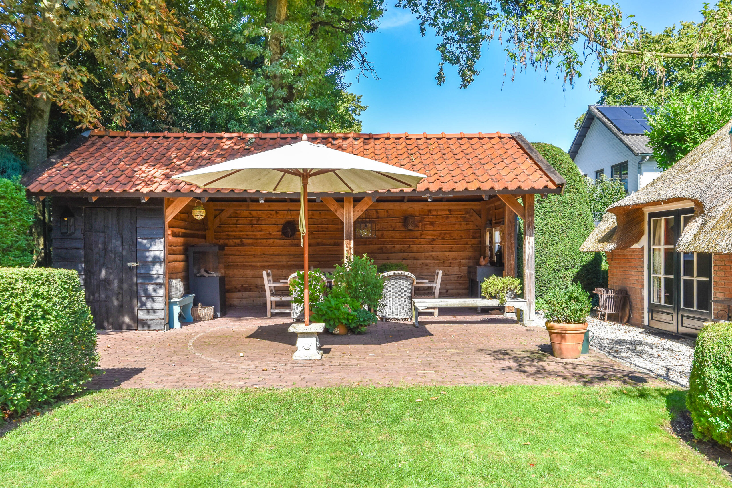 De villa wordt omringd door een groene oase. De fraai aangelegde tuin biedt elk seizoen een nieuwe beleving. Onder de sfeervolle houten overkapping geniet u van lange zomeravonden met familie en vrienden. Een tweede, verscholen overkapping biedt volop ruimte voor fietsen en tuinspullen. Dit is buitenleven op z’n mooist.
