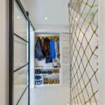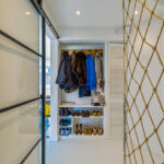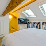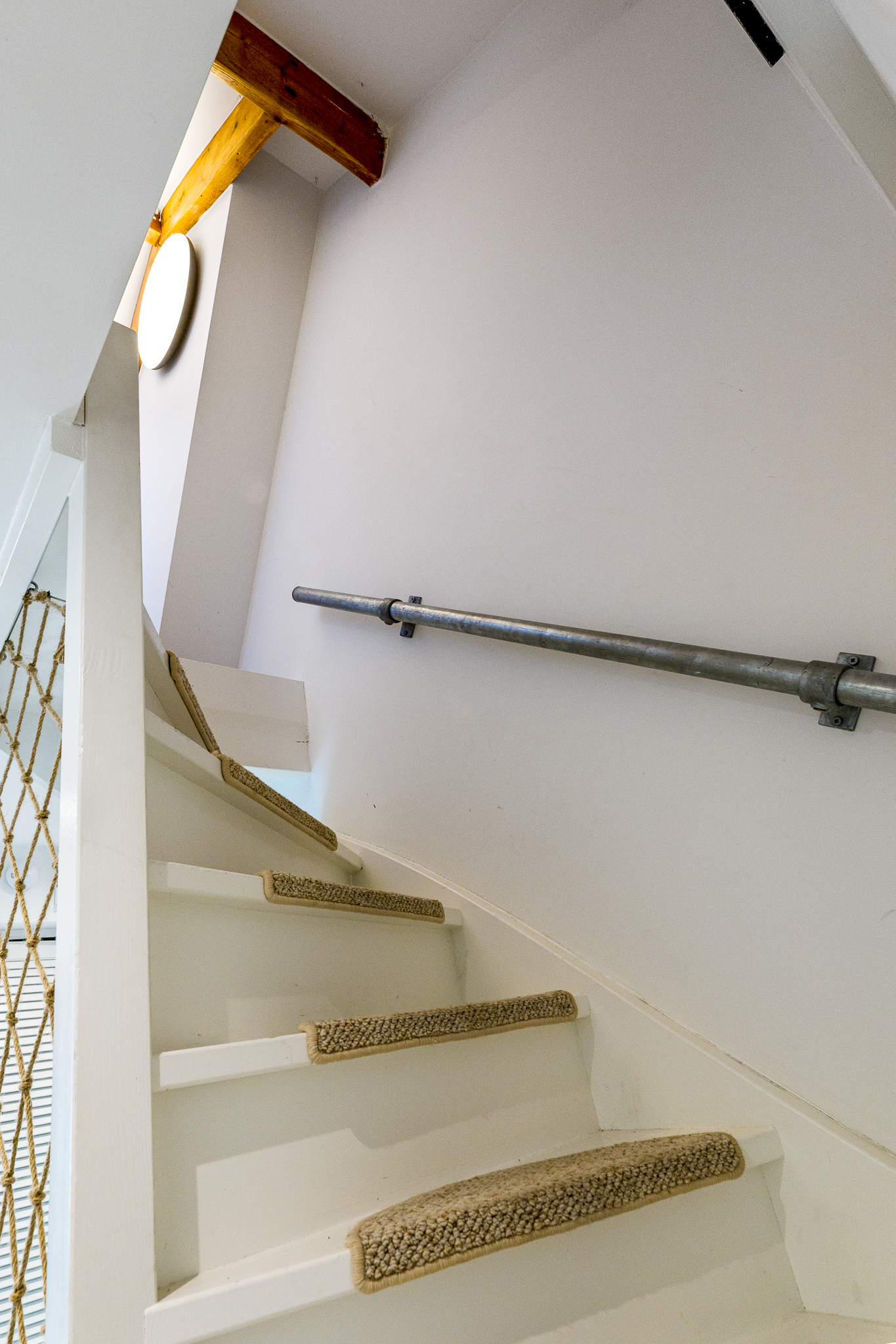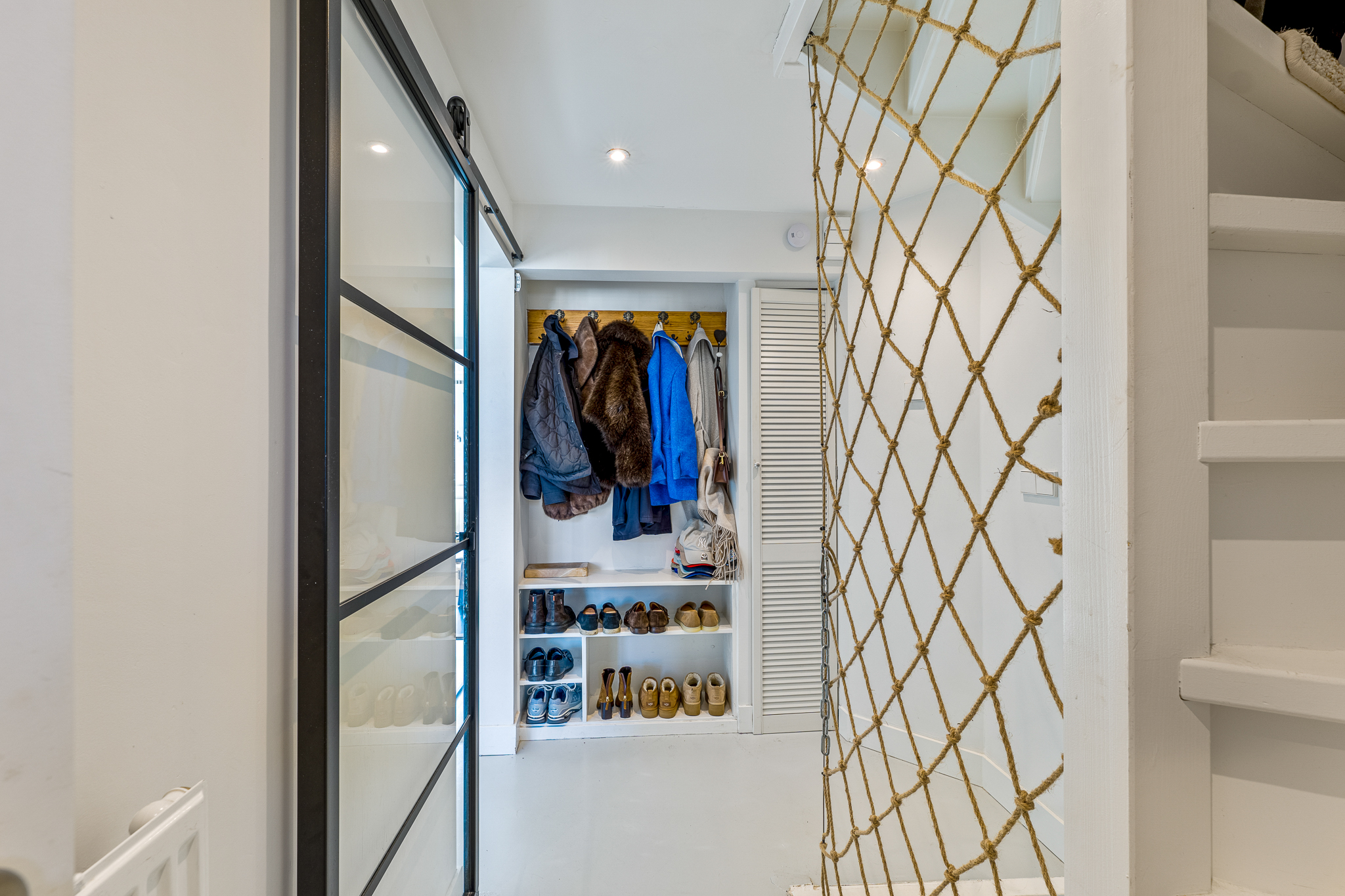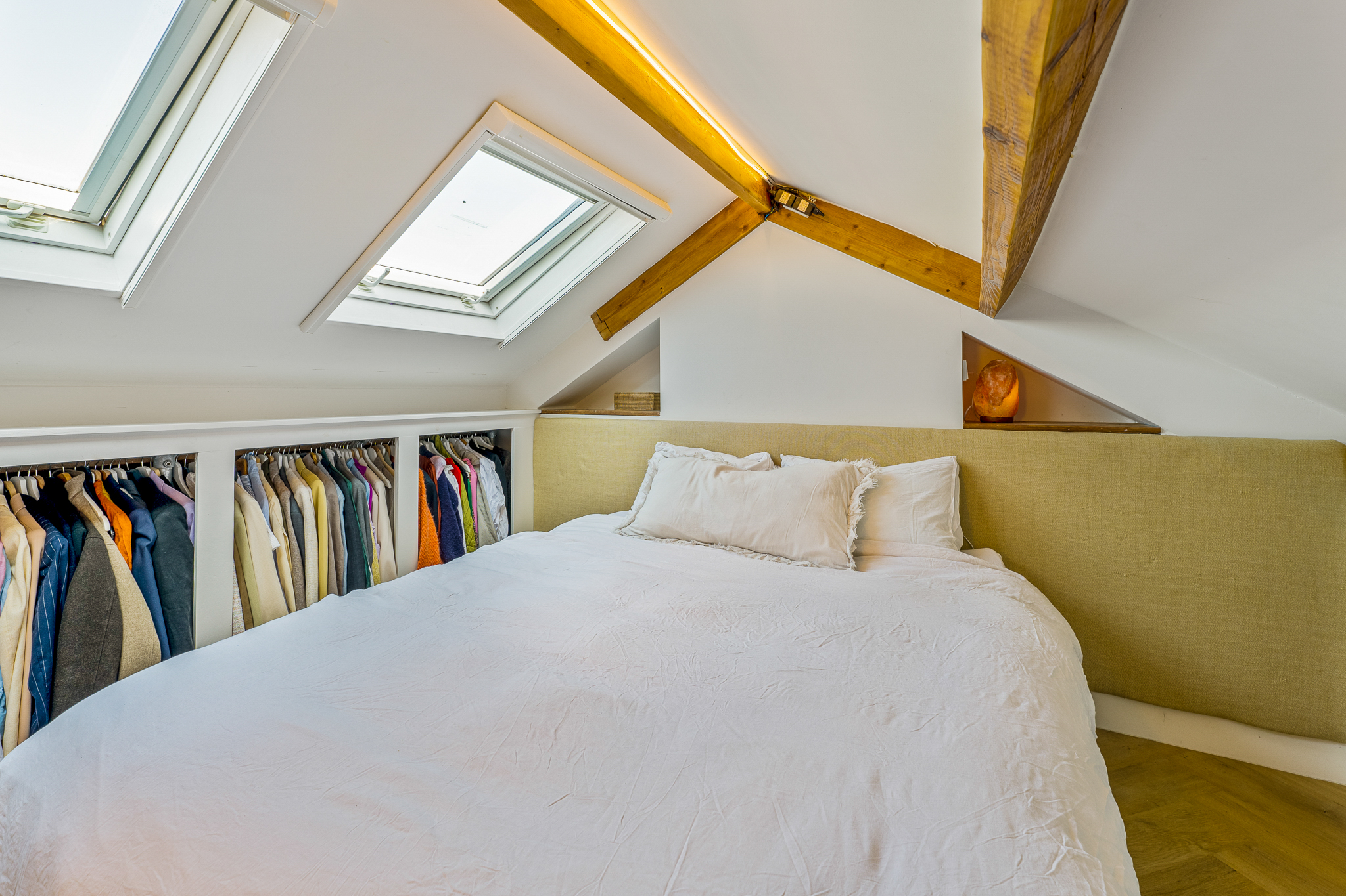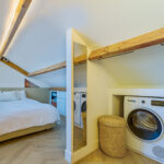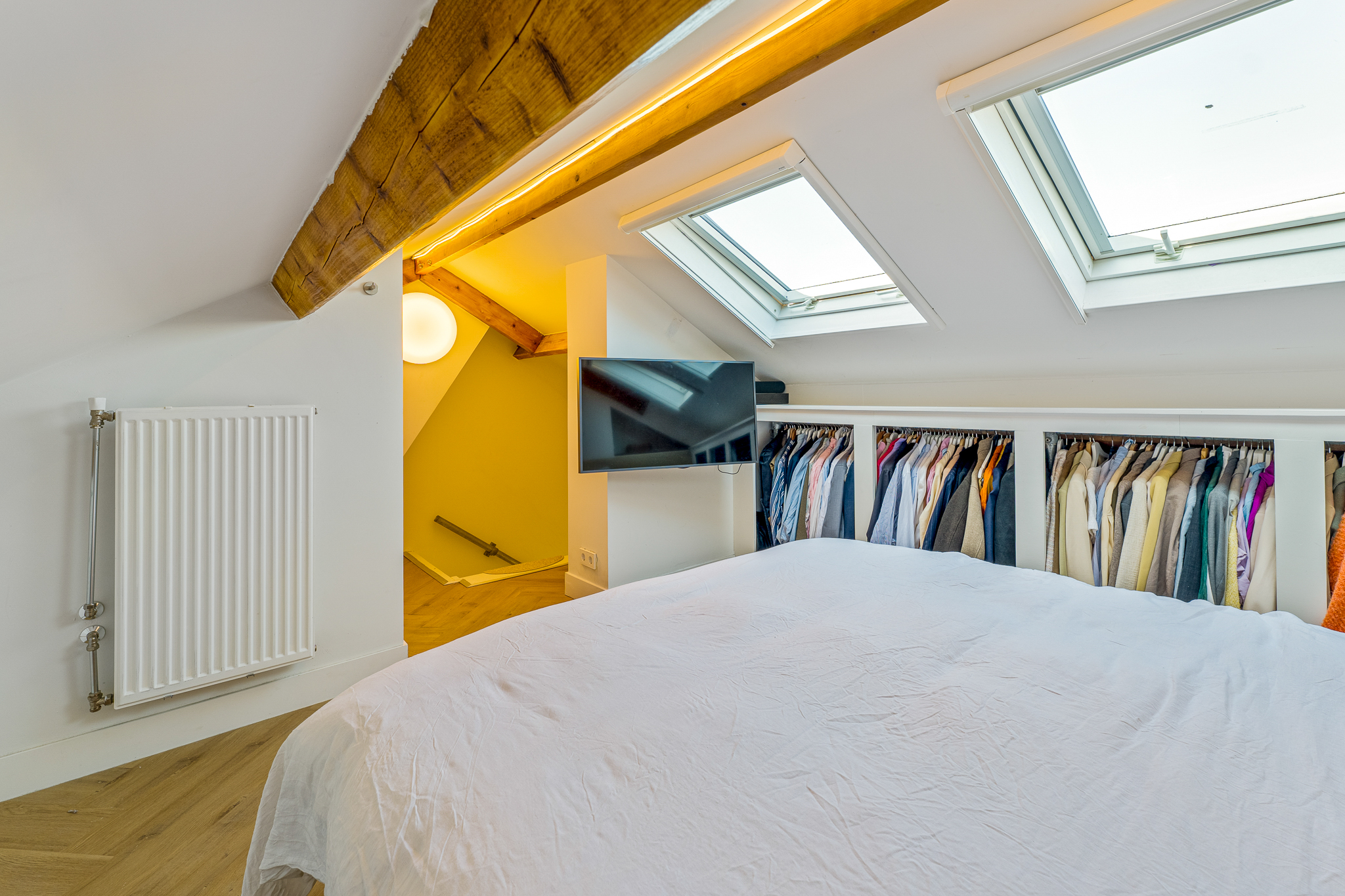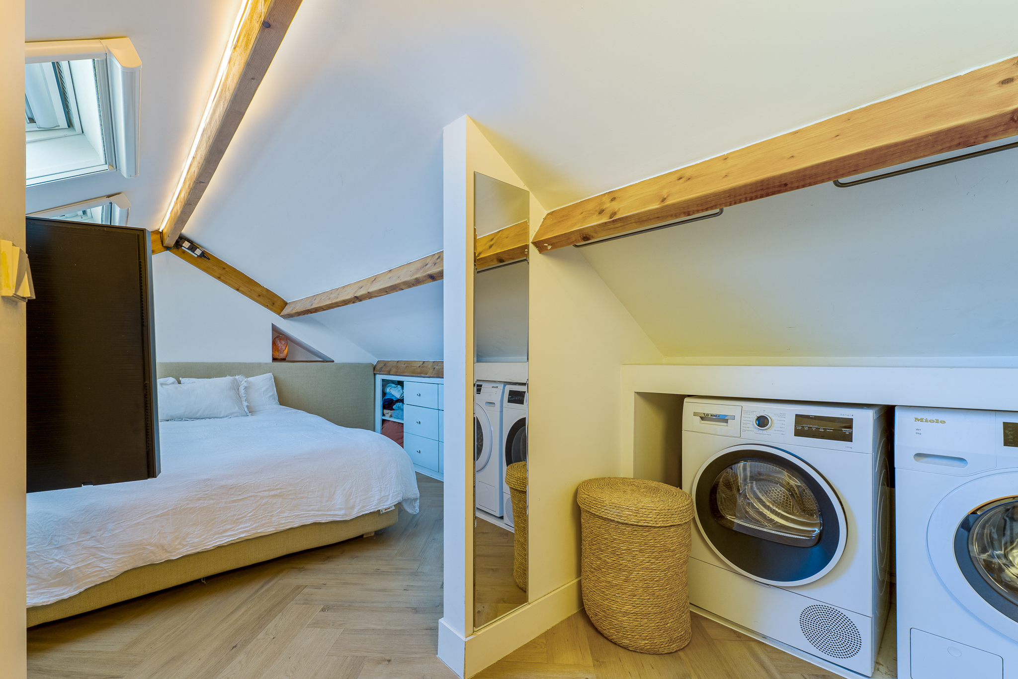 Via een halfslagtrap bereik je de verrassend ruime zolderverdieping, die functioneert als slaapkamer en wasruimte. Er zijn hier veel maatwerkmeubelen die zorgen voor veel bergruimte en een luxe uitstraling. Op de overloop is ruimte voor een wasmachine en droger in een speciale kast. De cv bevindt zich in een aparte ruimte waar nog ruime bergingsmogelijkheden zijn. De slaapkamer aan de achterzijde heeft een fijne en luxe uitstraling door de oude balken die zichtbaar zijn en de vissengraat-pvc-vloer. Het is een lichte kamer door de twee grote dakramen. Hier zijn veel inbouwmeubelen t, zoals nachtkastjes, ruimte voor hangkleding en twaalf diepe ladekasten in het dakbeschot. Het is een rustige en comfortabele slaapomgeving met volop opbergruimte.