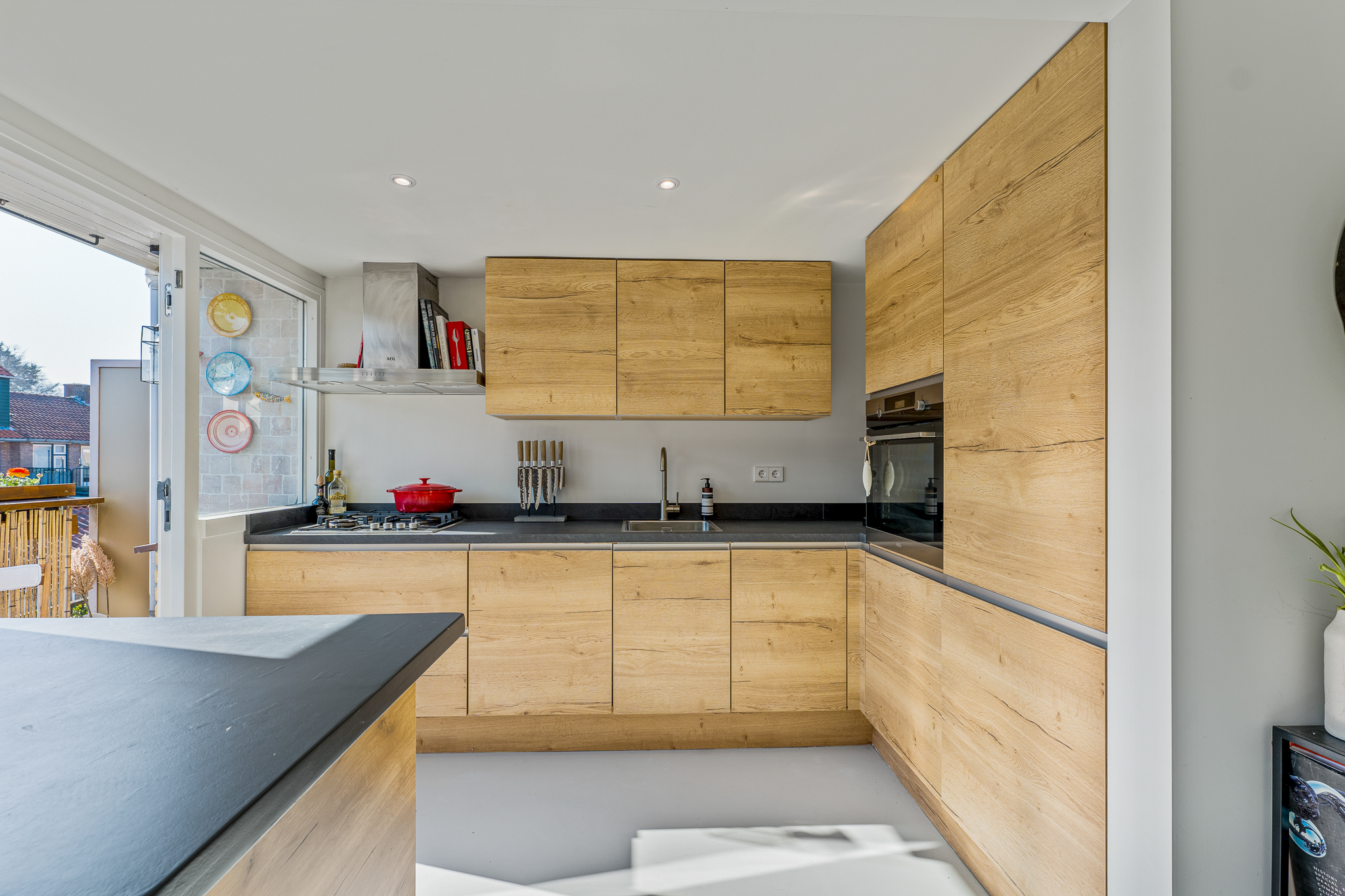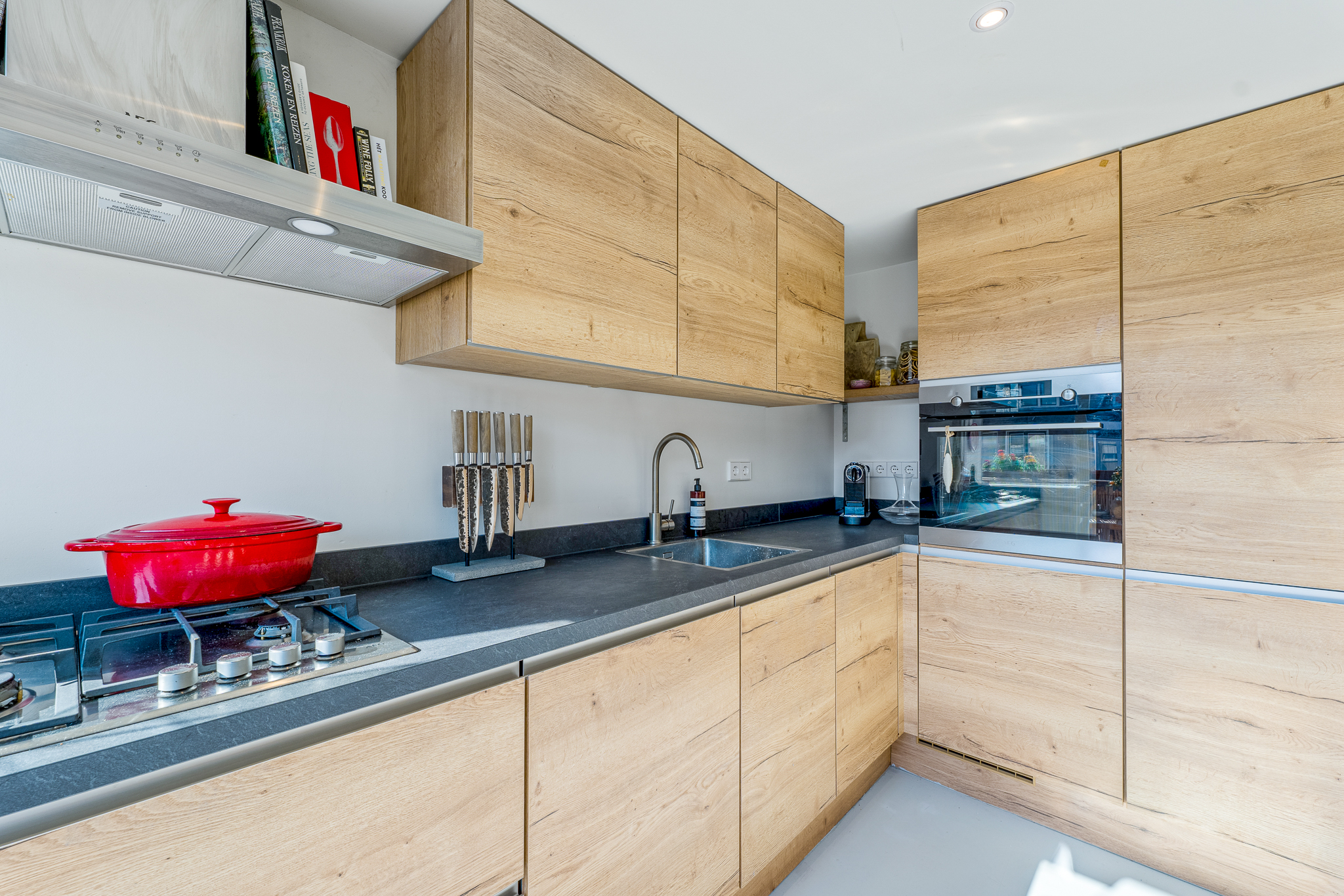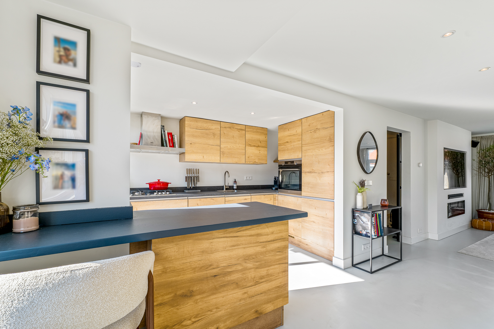 De open keuken (2023) is uitgevoerd in eiken Sierra met betonlookblad en RVS-accenten en is voorzien van AEG-inbouwapparatuur, waaronder een inbouwoven, koel-vriescombinatie, vaatwasser, 4-pits gasfornuis en afzuigkap.