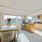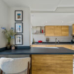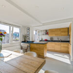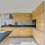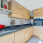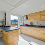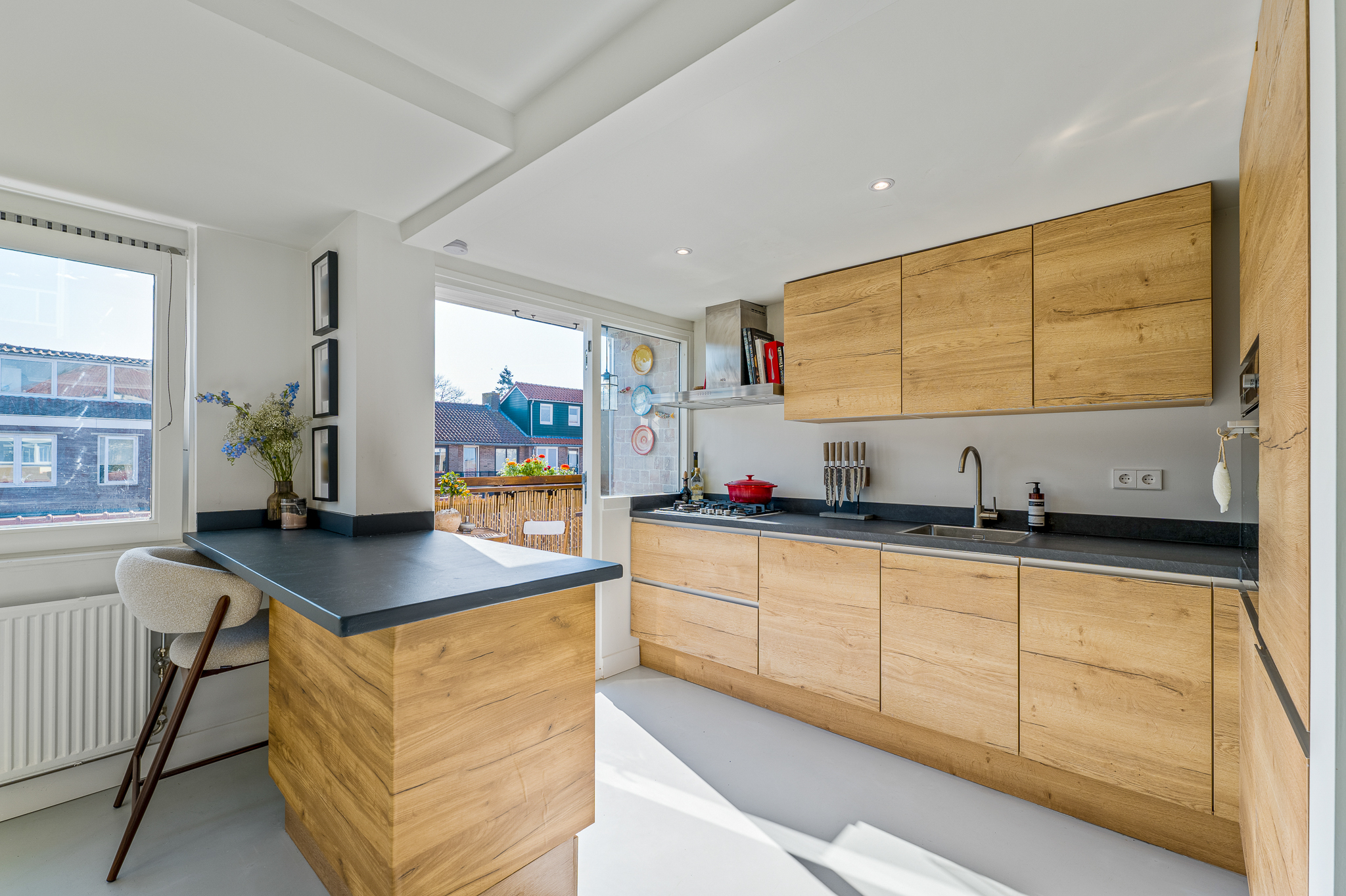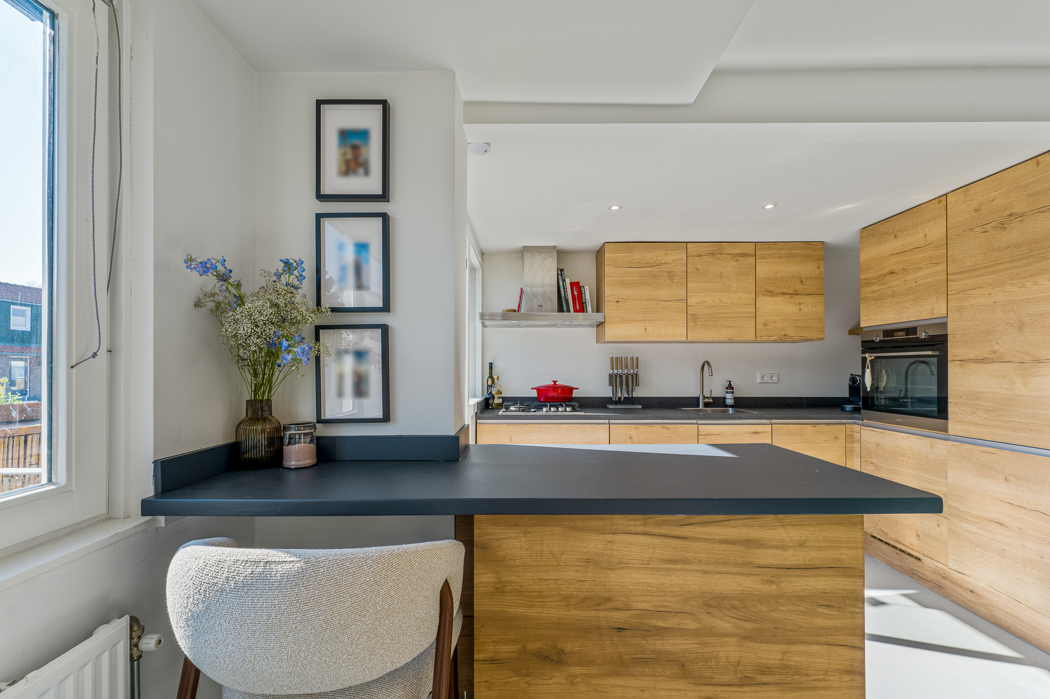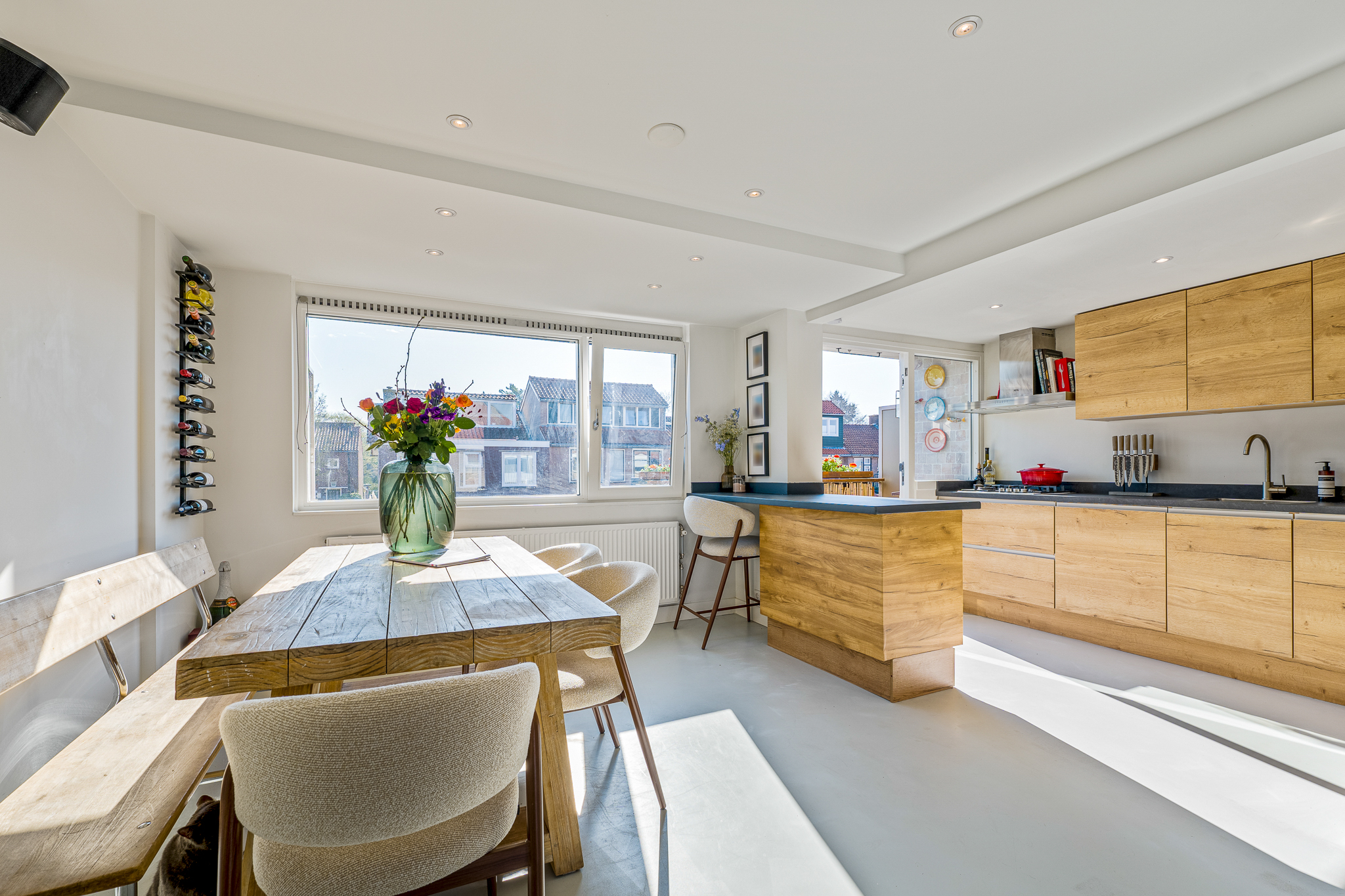 De open keuken (2023) is uitgevoerd in eiken Sierra met betonlookblad en RVS-accenten en is voorzien van AEG-inbouwapparatuur, waaronder een inbouwoven, koel-vriescombinatie, vaatwasser, 4-pits gasfornuis en afzuigkap.