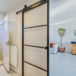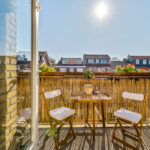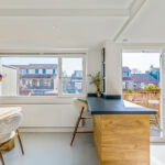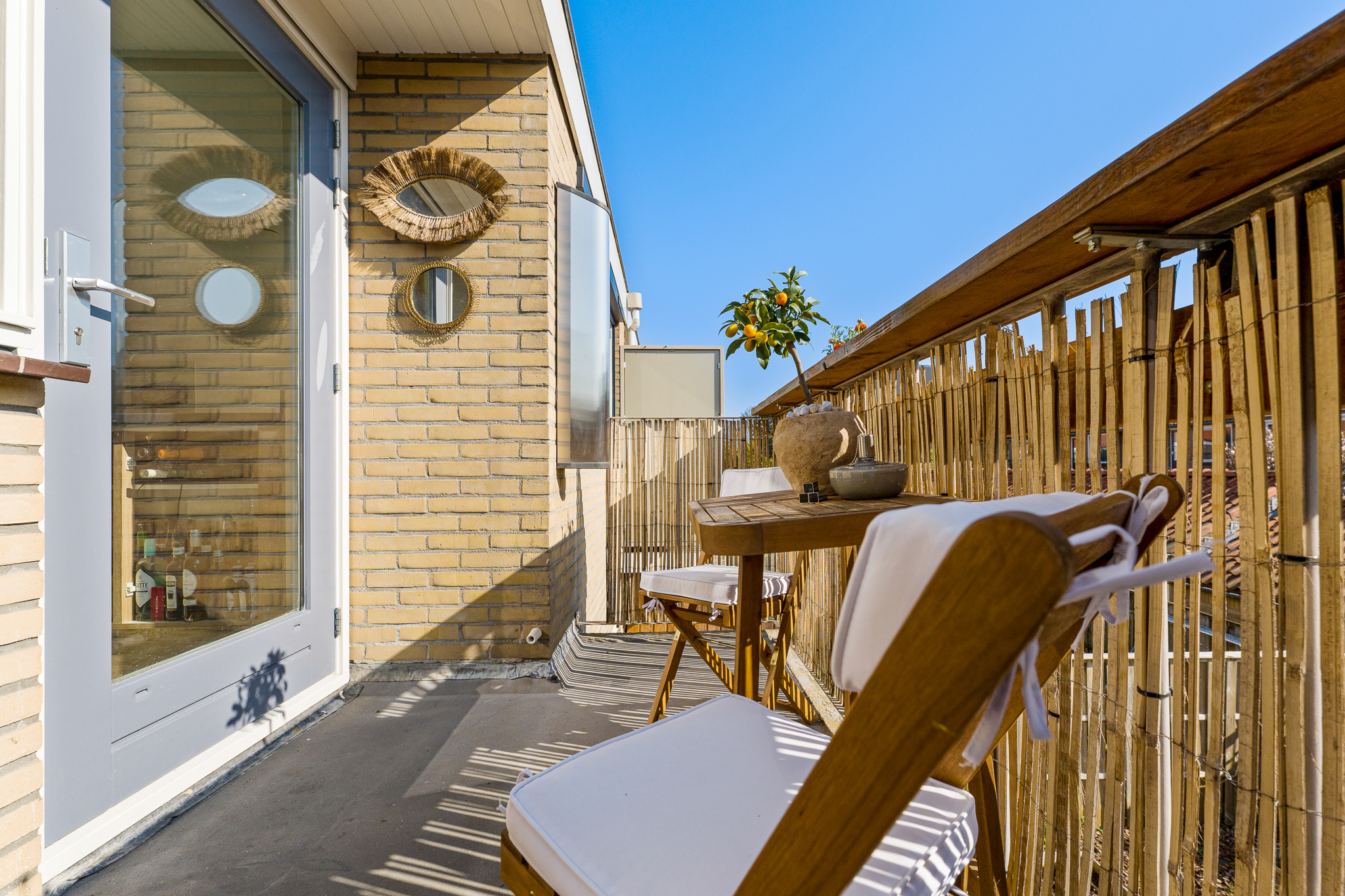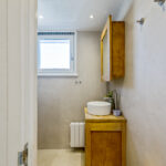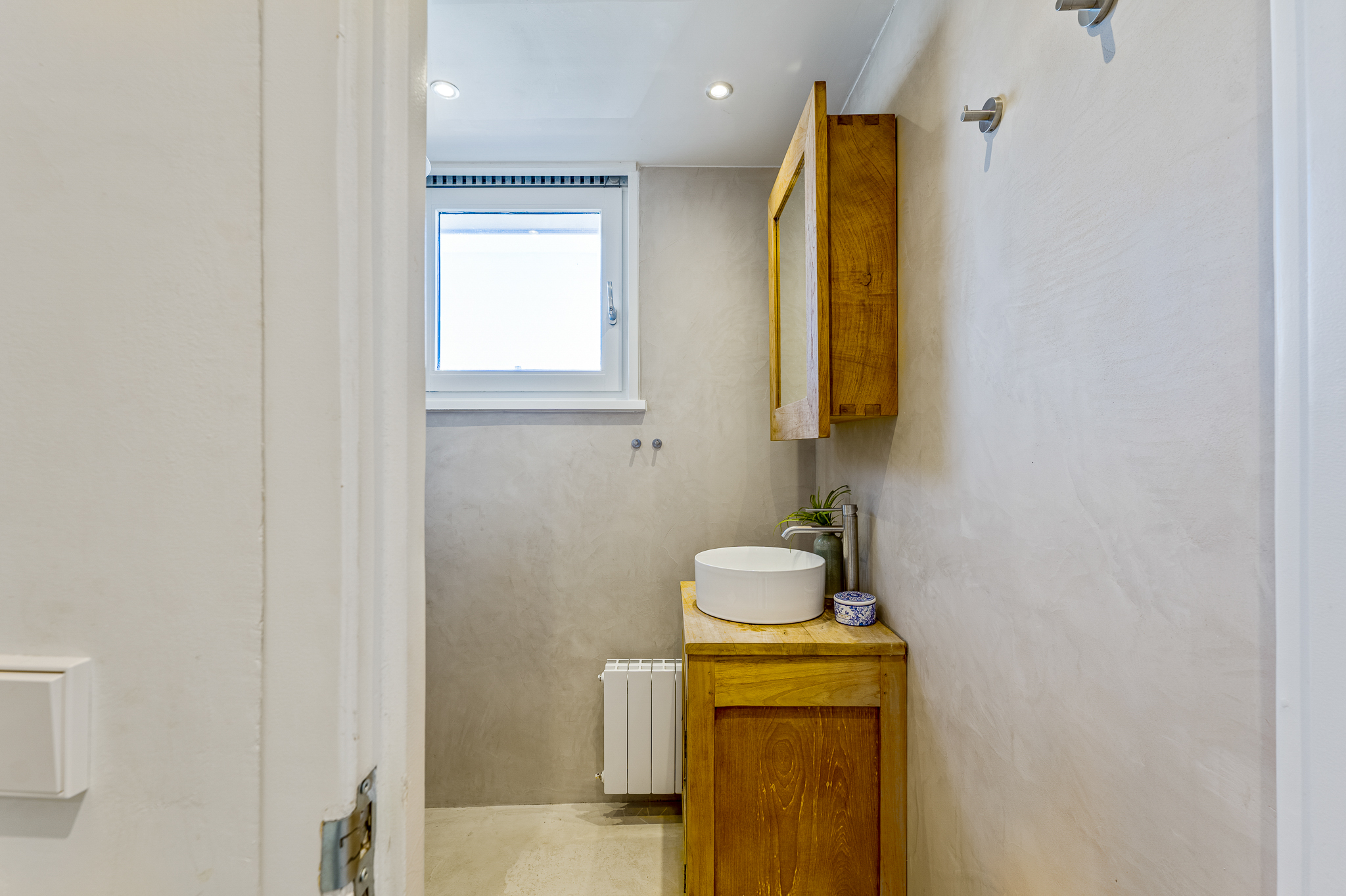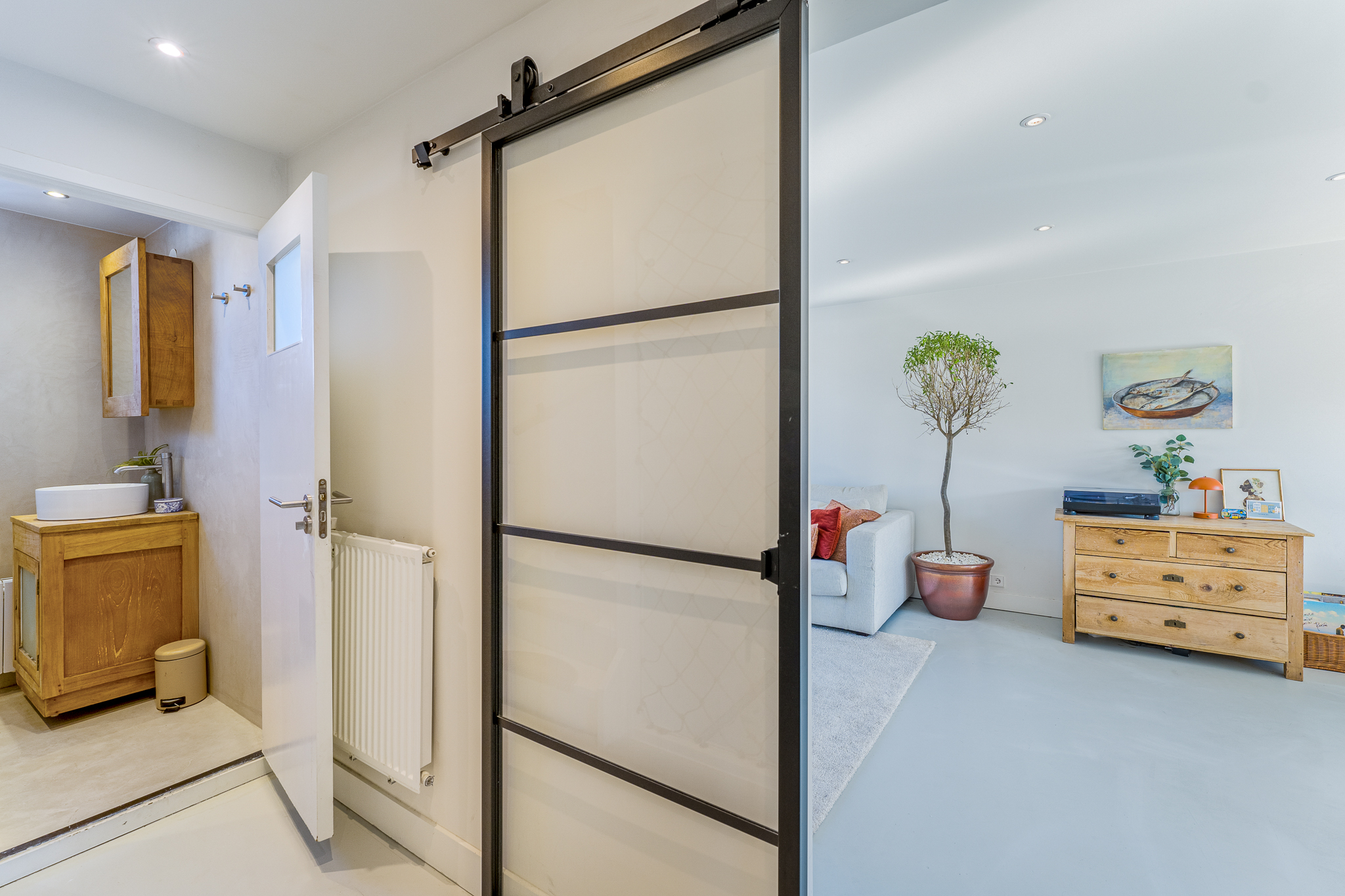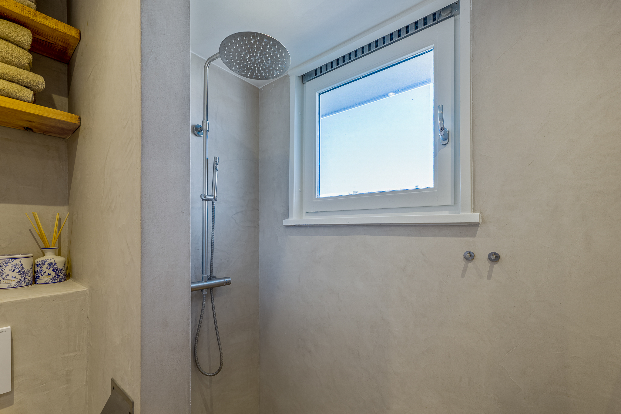 De moderne badkamer is een echte eyecatcher door de strakke beton cire-afwerking in de kleur satijn. Het teakhouten meubel, het vele RVS, de inloopdouche en het toilet zorgen voor een luxe en frisse sfeer. Vanuit de keuken is het balkon bereikbaar, waar je heerlijk kunt genieten van de avondzon.