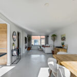 Op de overloop bevindt zich de meterkast (10 groepen). Daarnaast vind je een praktisch ingebouwd meubel voor schoenen en een garderoberek. Via een schuifdeur bereik je de woonkamer. De gehele verdieping is afgewerkt met een strakke PU-vloer in verkeersgrijs met hoge witte plinten, slim geplaatste stopcontacten (voor draadloos hifi-systeem), cinema-wall met ruimte voor 65” tv, soundbar en elektrische haard. Het achterraam, dat is gelegen op het zuiden, is voorzien van een elektrische buitenscreens.
