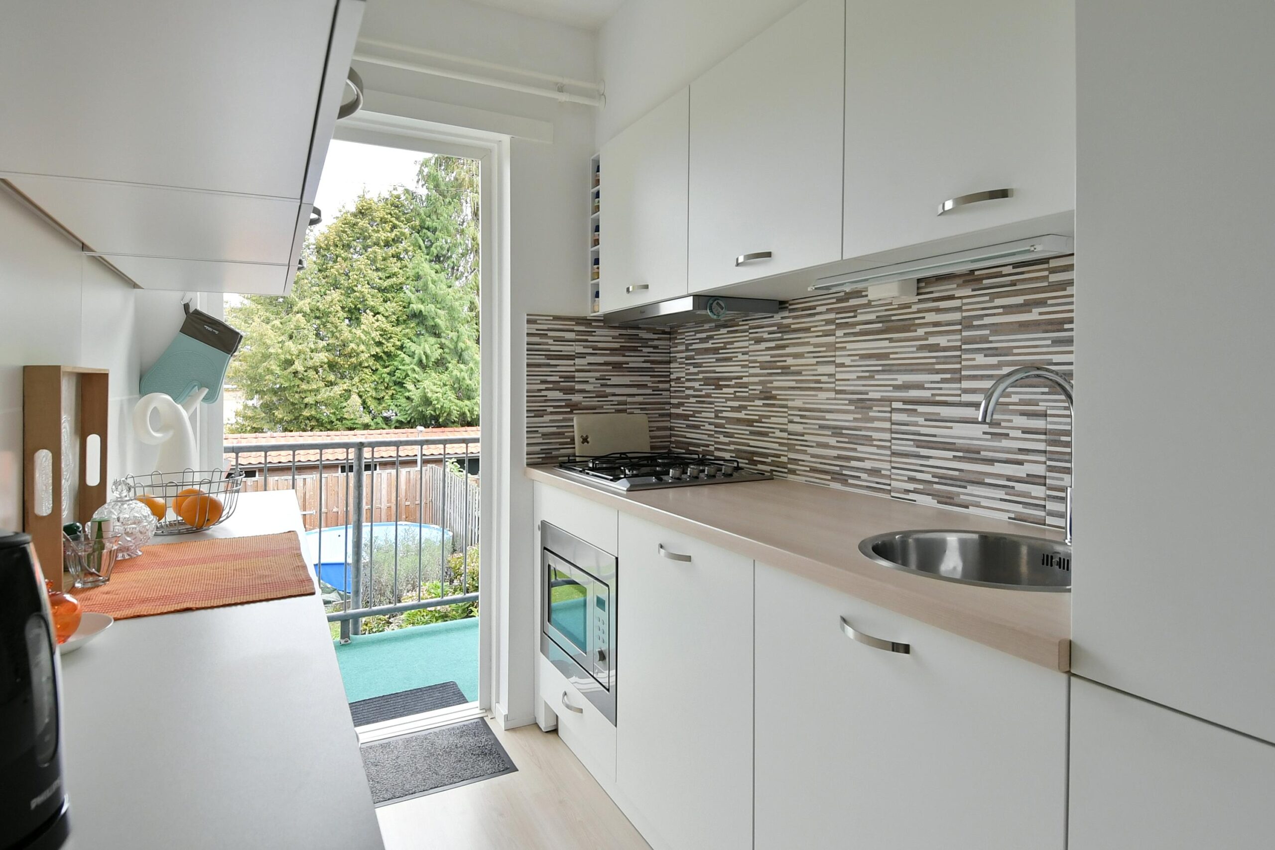 De keuken is praktisch ingericht en voorzien van diverse inbouwapparatuur en geeft toegang tot het tweede balkon. Het appartement beschikt over twee slaapkamers, waarvan één ruime hoofdslaapkamer en een tweede kamer die uitstekend geschikt is als werk-, logeer- of kinderkamer. De badkamer is netjes afgewerkt en voorzien van een douche en wastafel. Daarnaast is er een separaat toilet.
