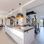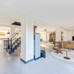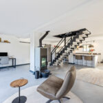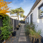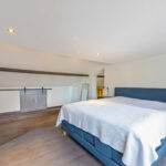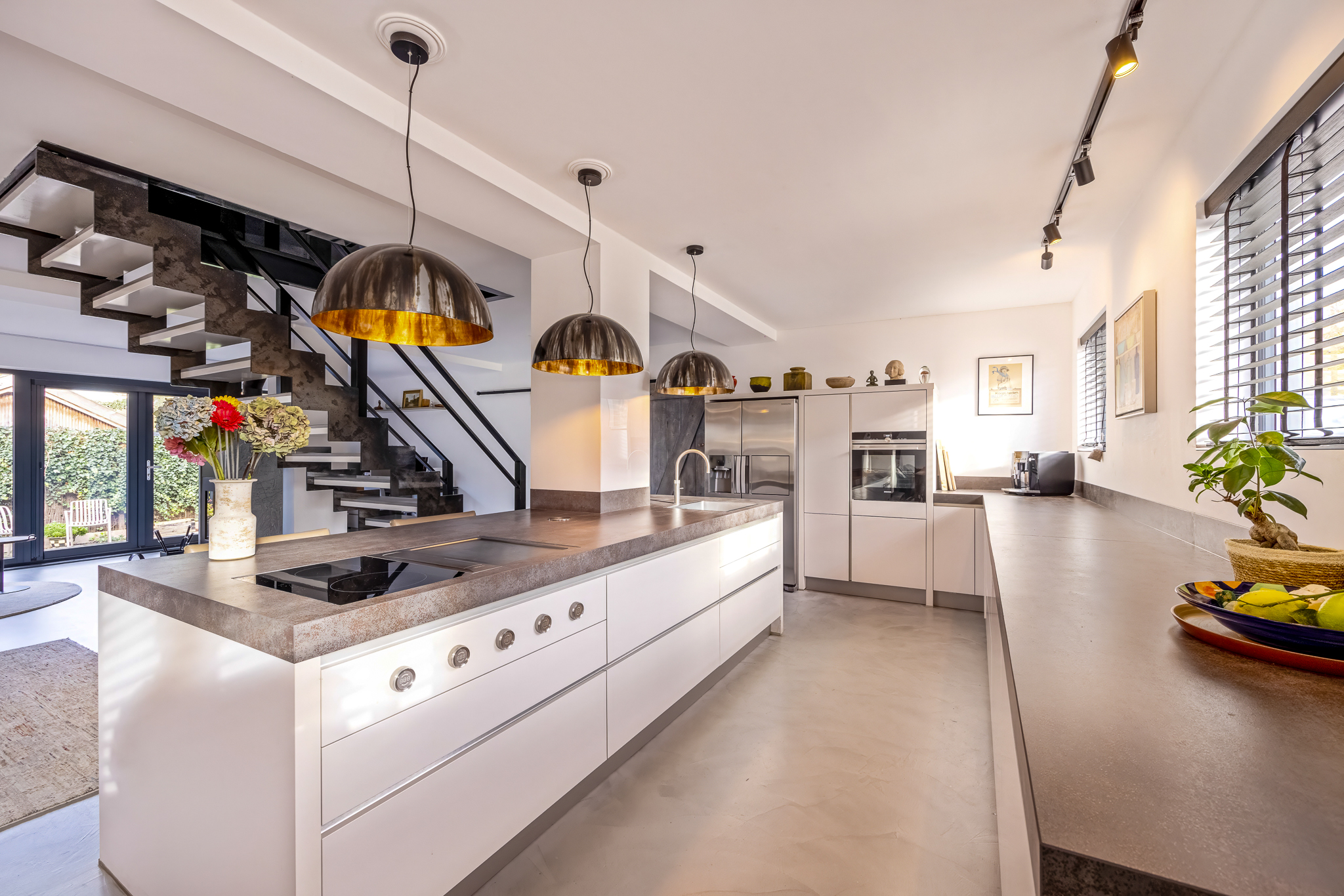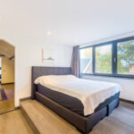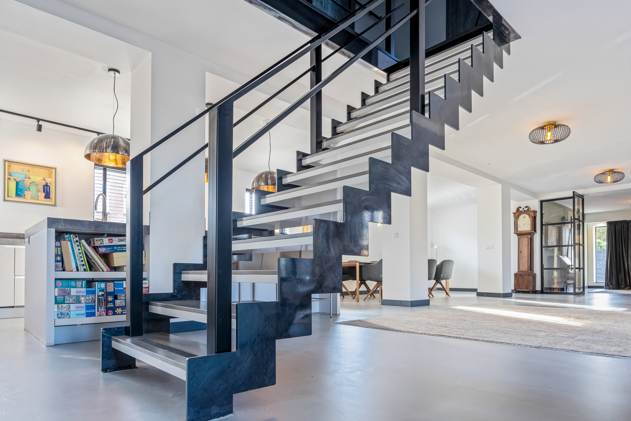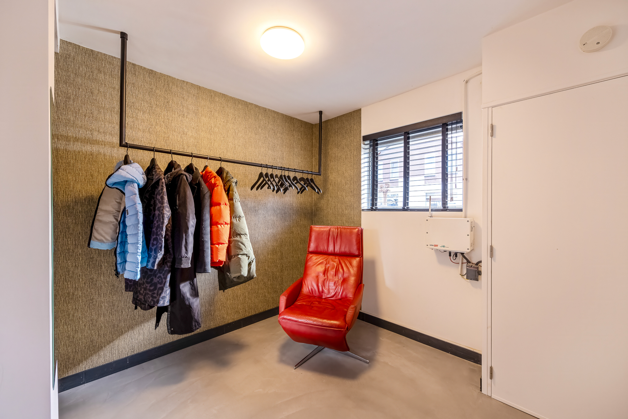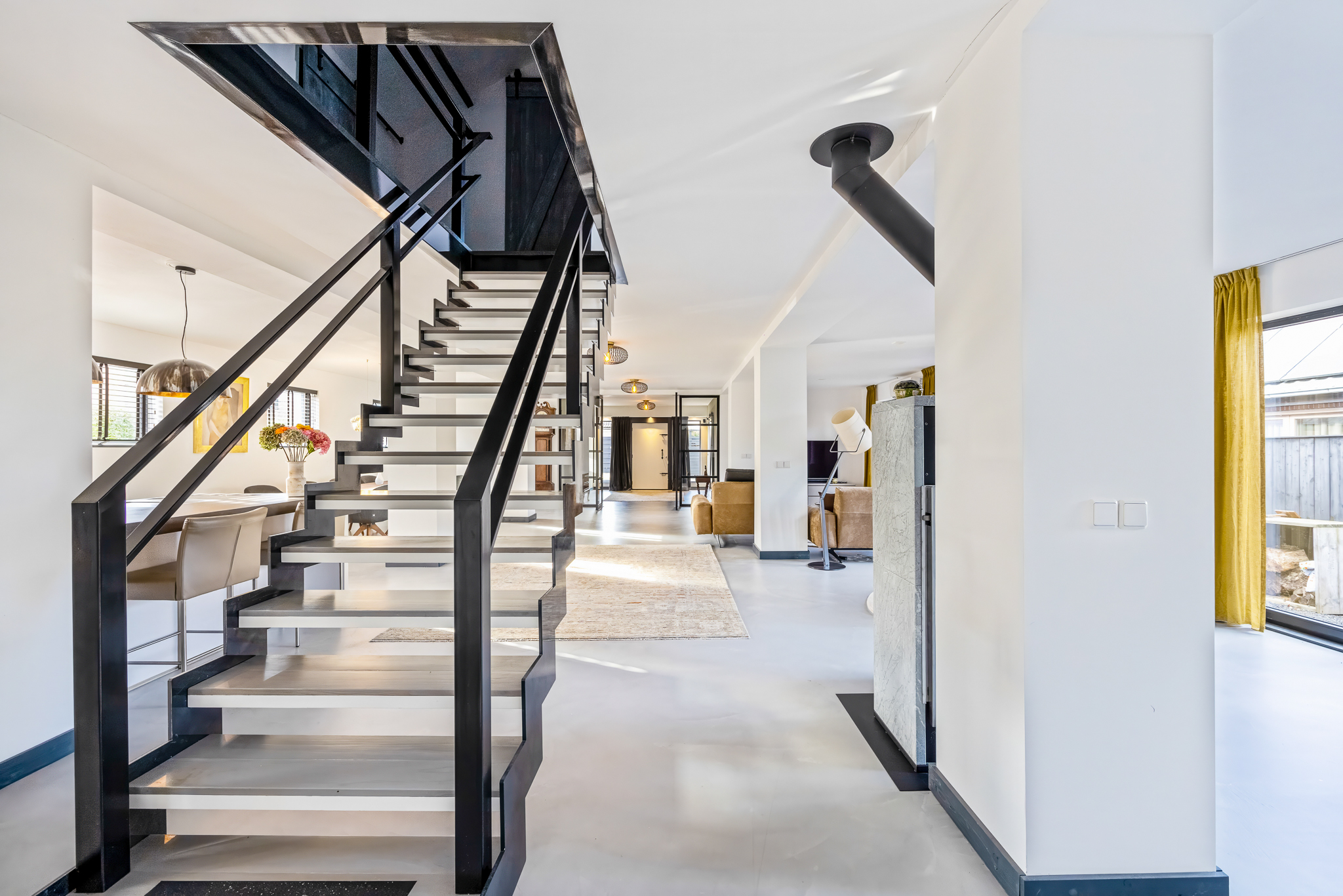 The covered entrance with its characteristic door opens into a generous hallway leading through to the large, bright living room with open kitchen. This inviting living space is ideal for both everyday comfort and relaxed cooking and dining. At the front of the house is a spacious storage room that, due to its layout and position, can easily be used as a study or home office. This level also includes a bedroom, a cloakroom with toilet and a practical utility room. The utility room is equipped with the necessary connections to create an additional bathroom – ideal for those wishing to live on one level.