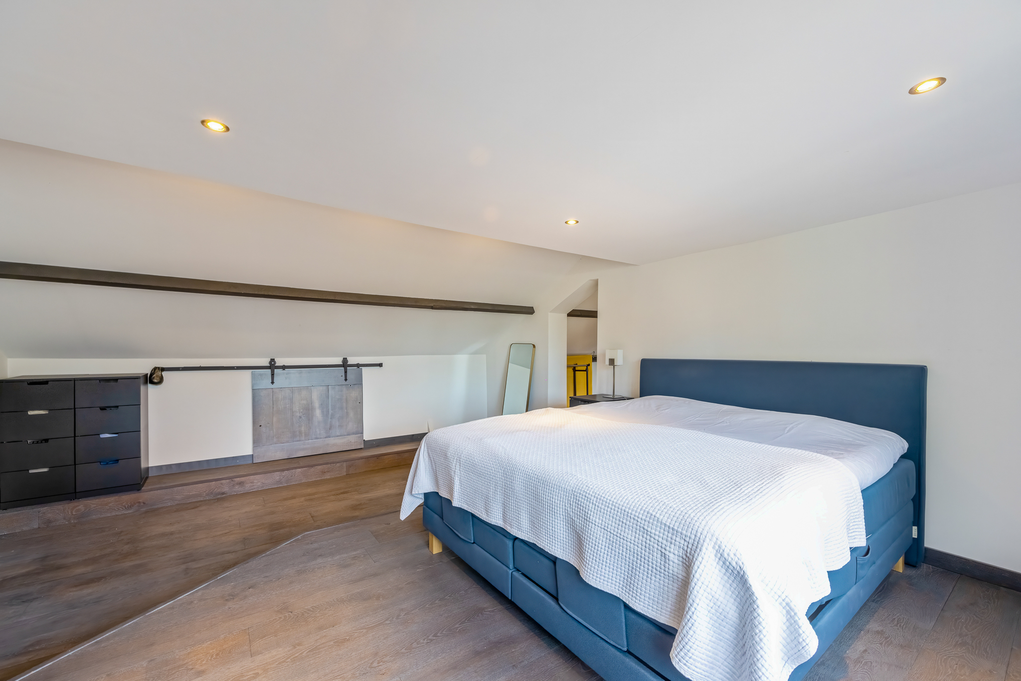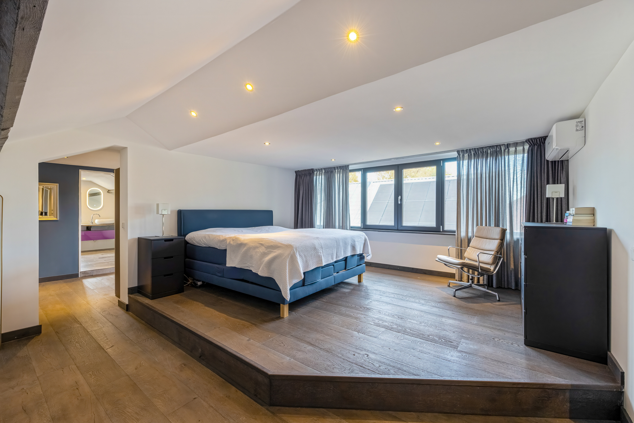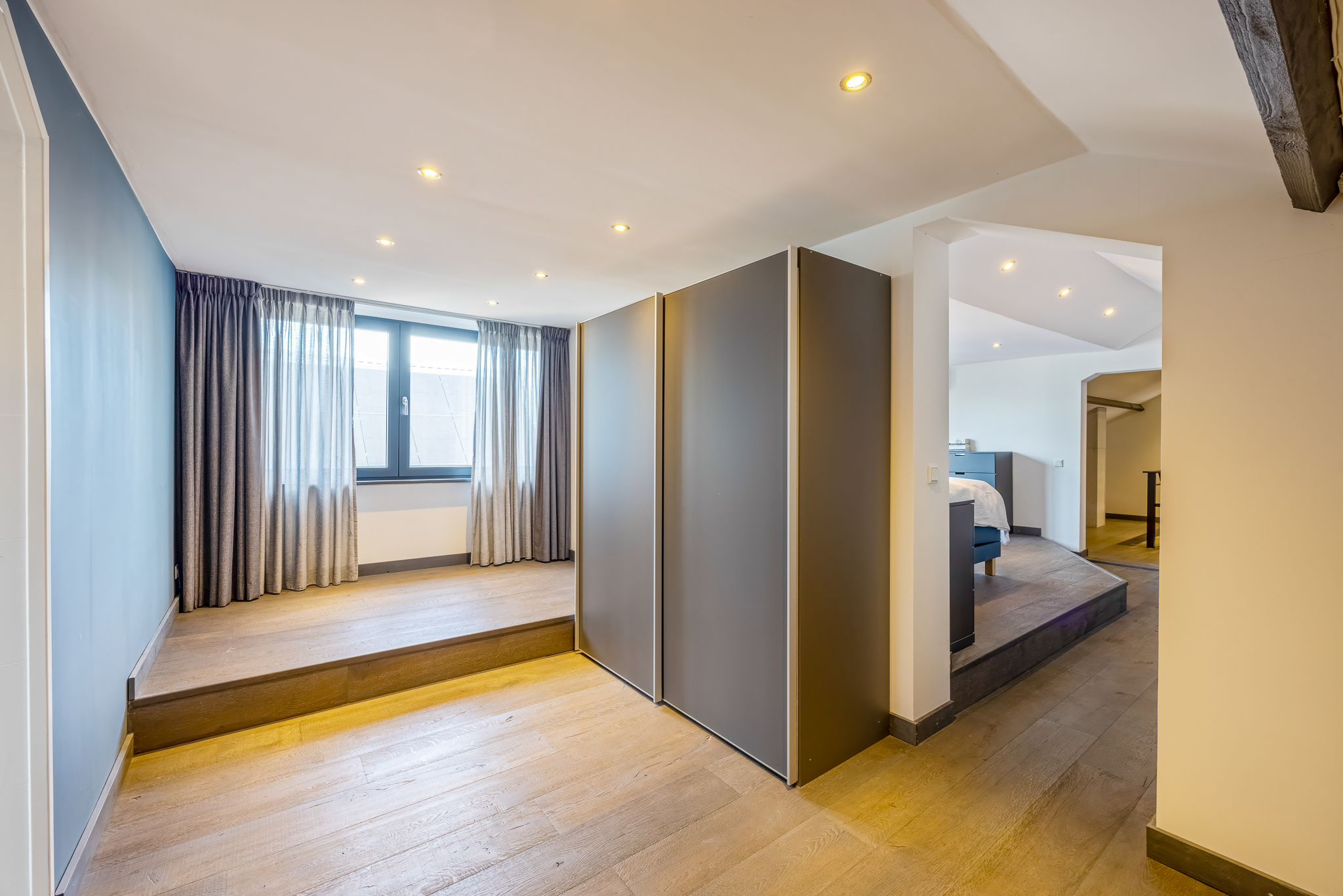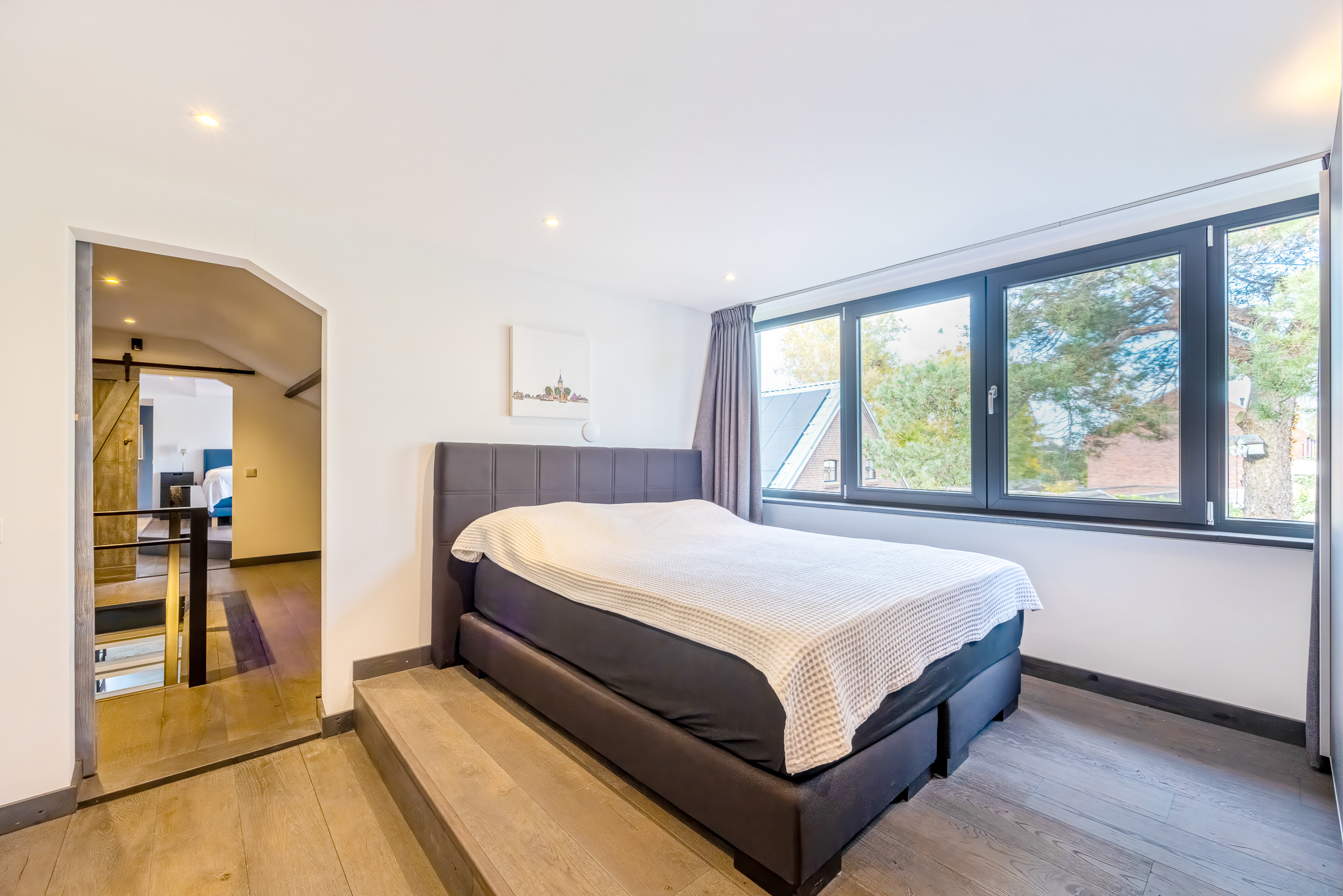 De brede trap brengt u naar een ruime overloop. Hier bevinden zich een wasruimte en een aparte droogruimte. De master-bedroom aan de voorzijde beschikt over een eigen kleedkamer en een luxe badkamer met ligbad, douche, toilet en wastafel. Aan de achterzijde ligt een tweede royale slaapkamer, eveneens met privébadkamer met douche en toilet.