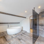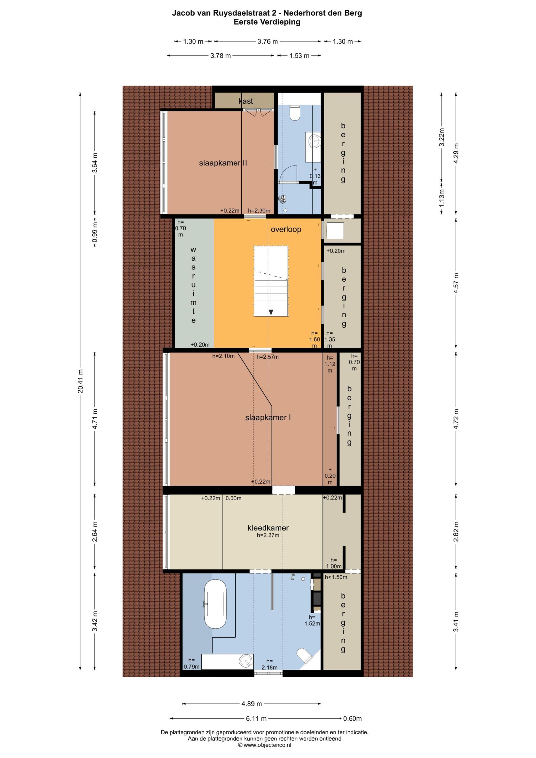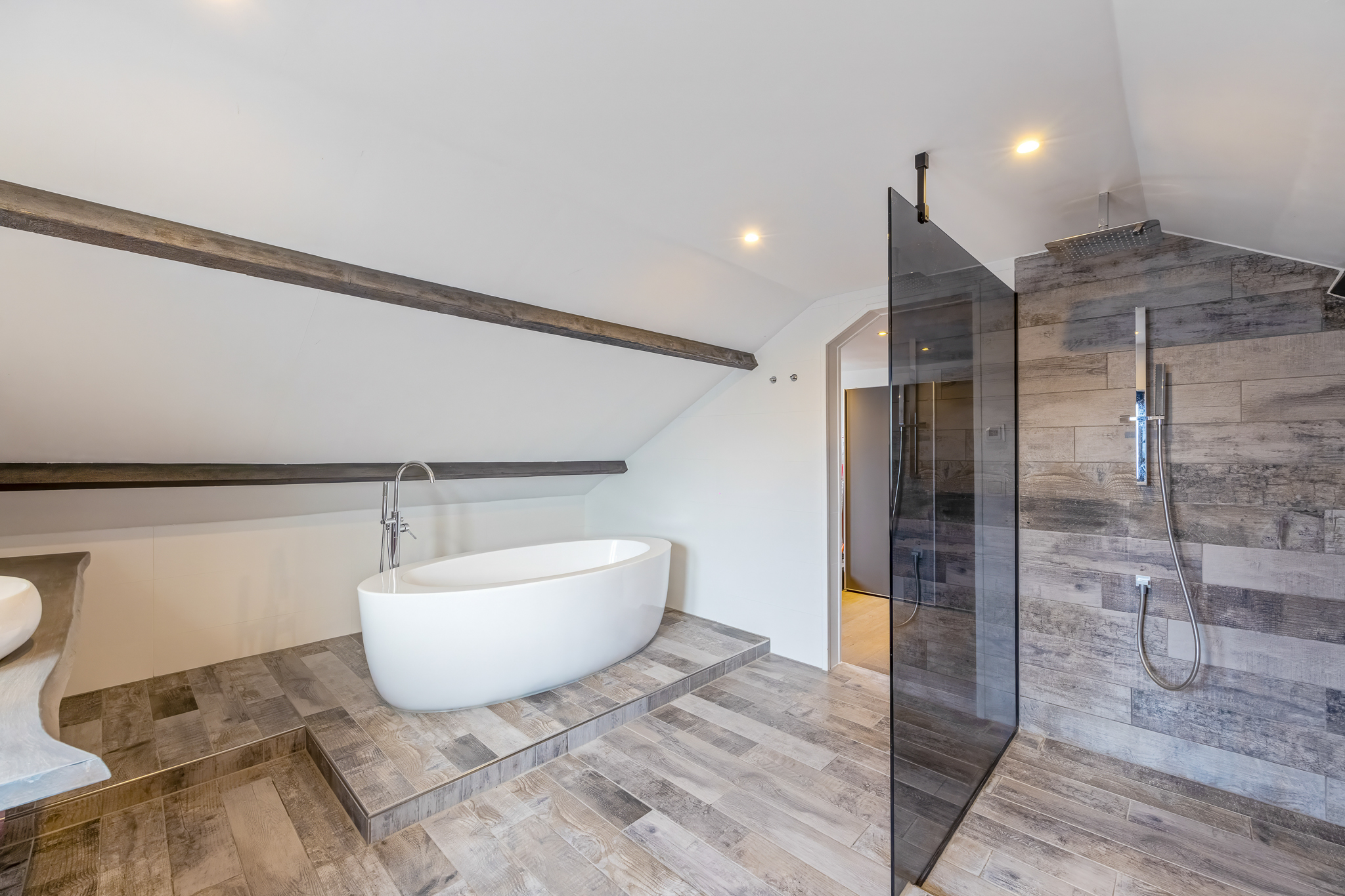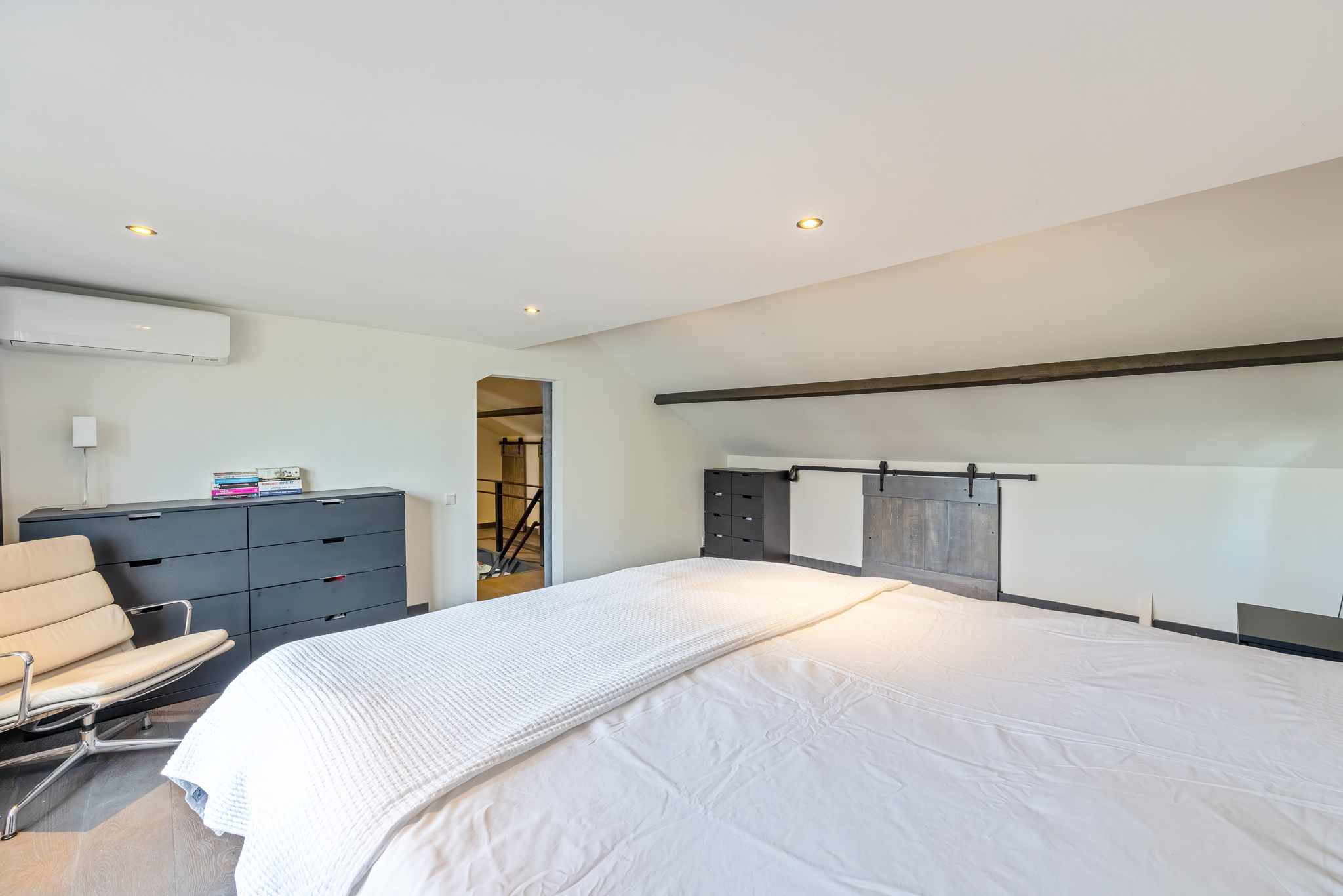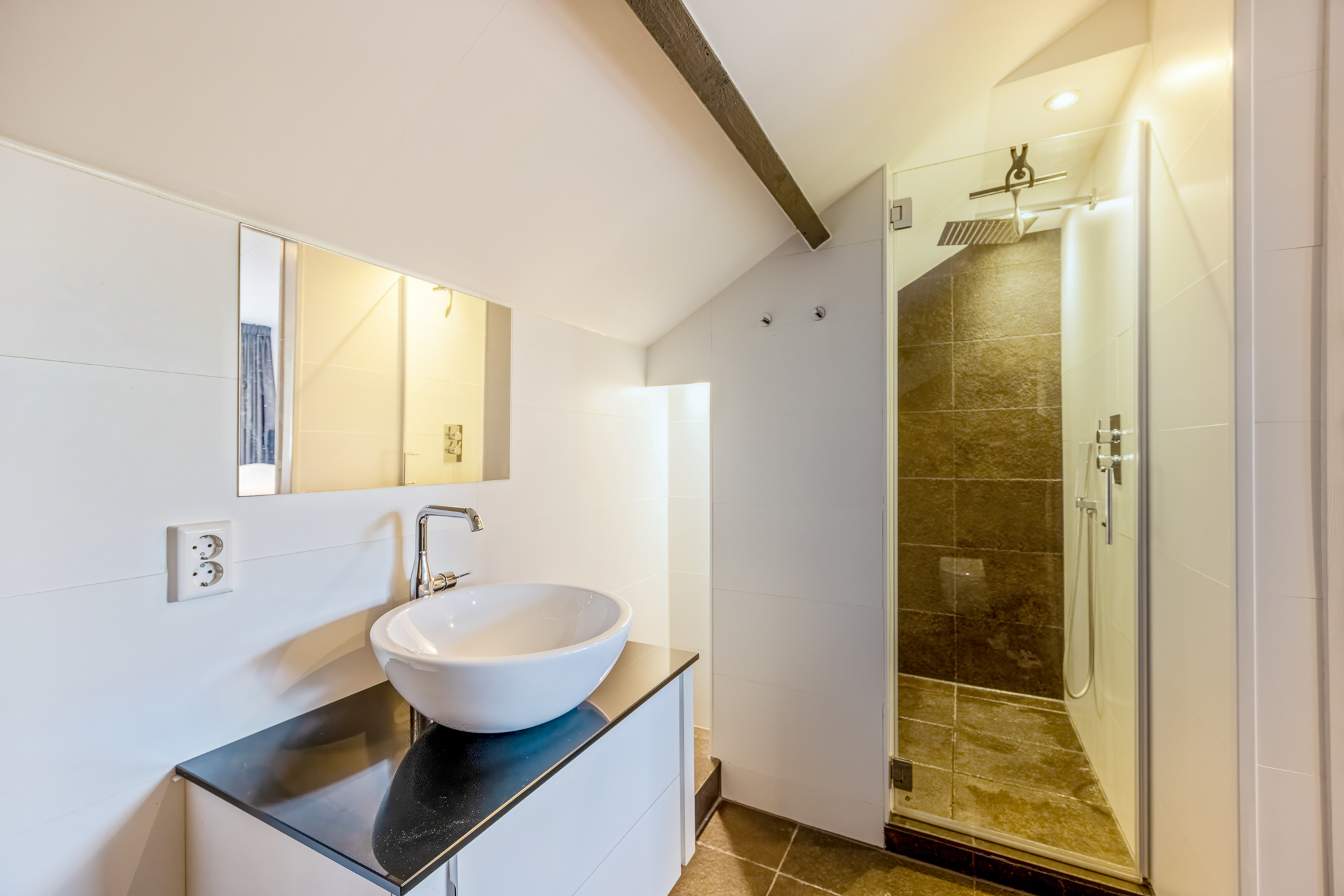 De brede trap brengt u naar een ruime overloop. Hier bevinden zich een wasruimte en een aparte droogruimte. De master-bedroom aan de voorzijde beschikt over een eigen kleedkamer en een luxe badkamer met ligbad, douche, toilet en wastafel. Aan de achterzijde ligt een tweede royale slaapkamer, eveneens met privébadkamer met douche en toilet.