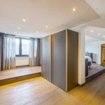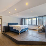 The wide staircase leads to a spacious landing. Here you will find a laundry room and a separate drying room. At the front is the master bedroom, which features a private walk-in closet and a luxury bathroom with bathtub, shower, toilet and washbasin. At the rear is a second generously sized bedroom, also equipped with its own bathroom with shower and toilet.