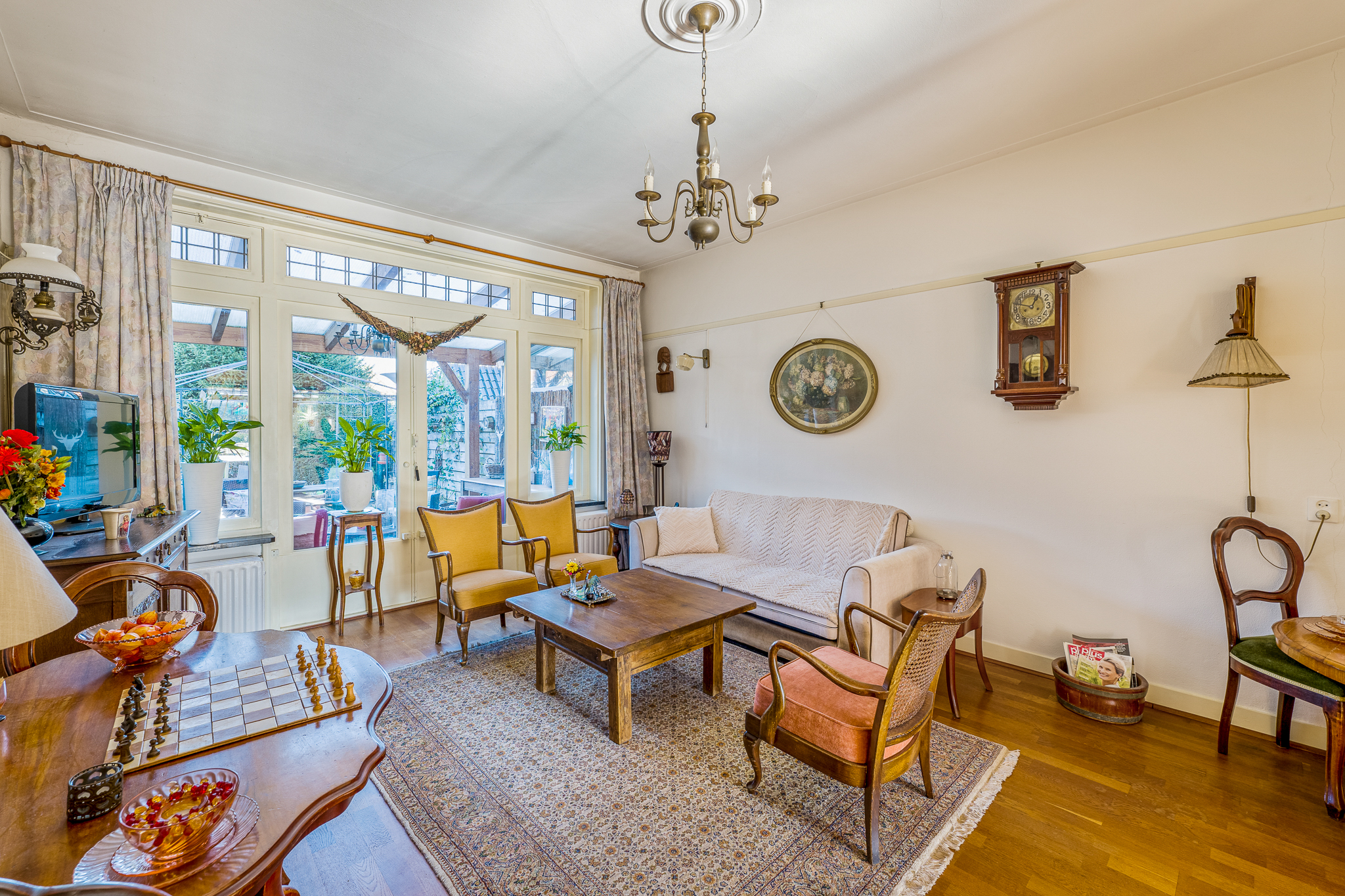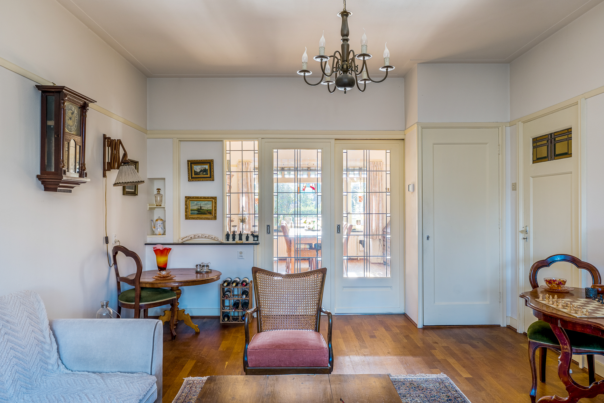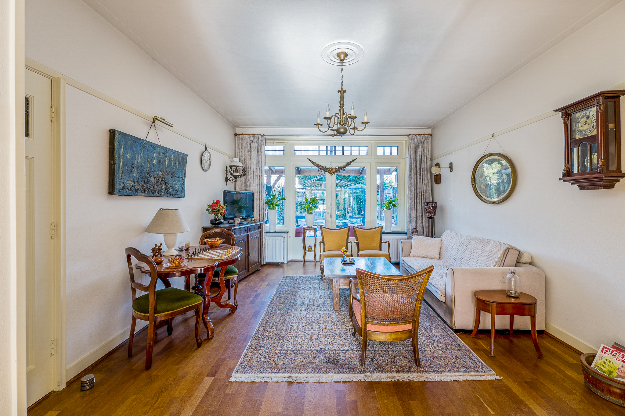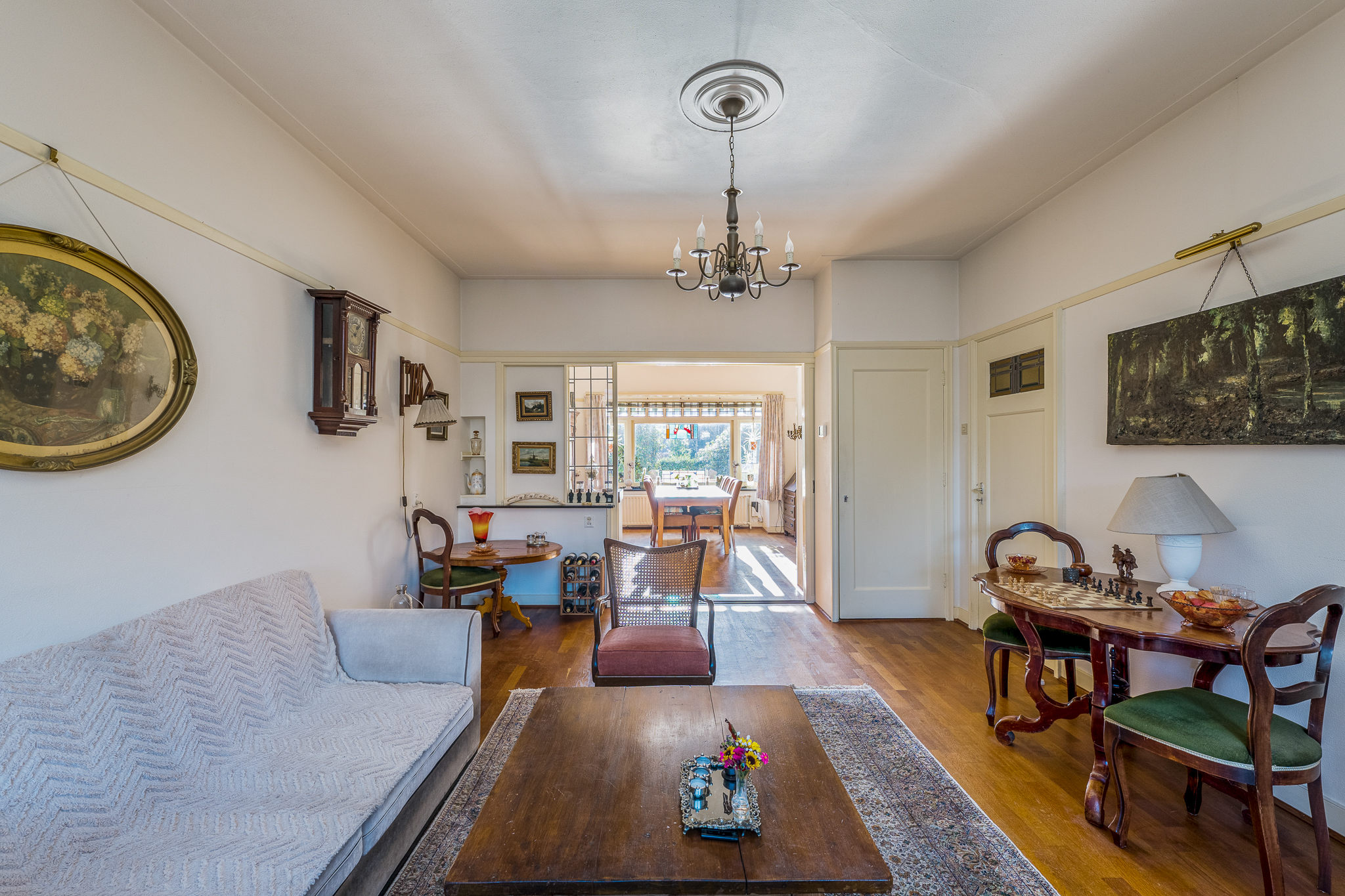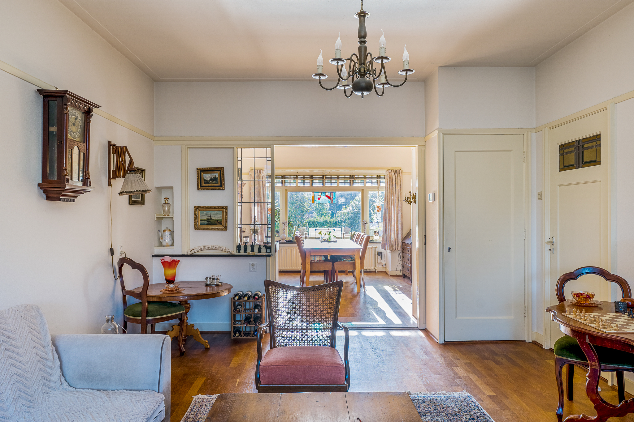 Begane grond: vestibule met toegang tot de hal, toilet en trapopgang. De oorspronkelijke indeling is behouden met een woonkamer aan de voorzijde, een separate eetkamer aan de achterzijde en een extra voorkamer die geschikt is als werk- of tv-kamer. De keuken bevindt zich aan de achterzijde en geeft toegang tot de veranda en de tuin.