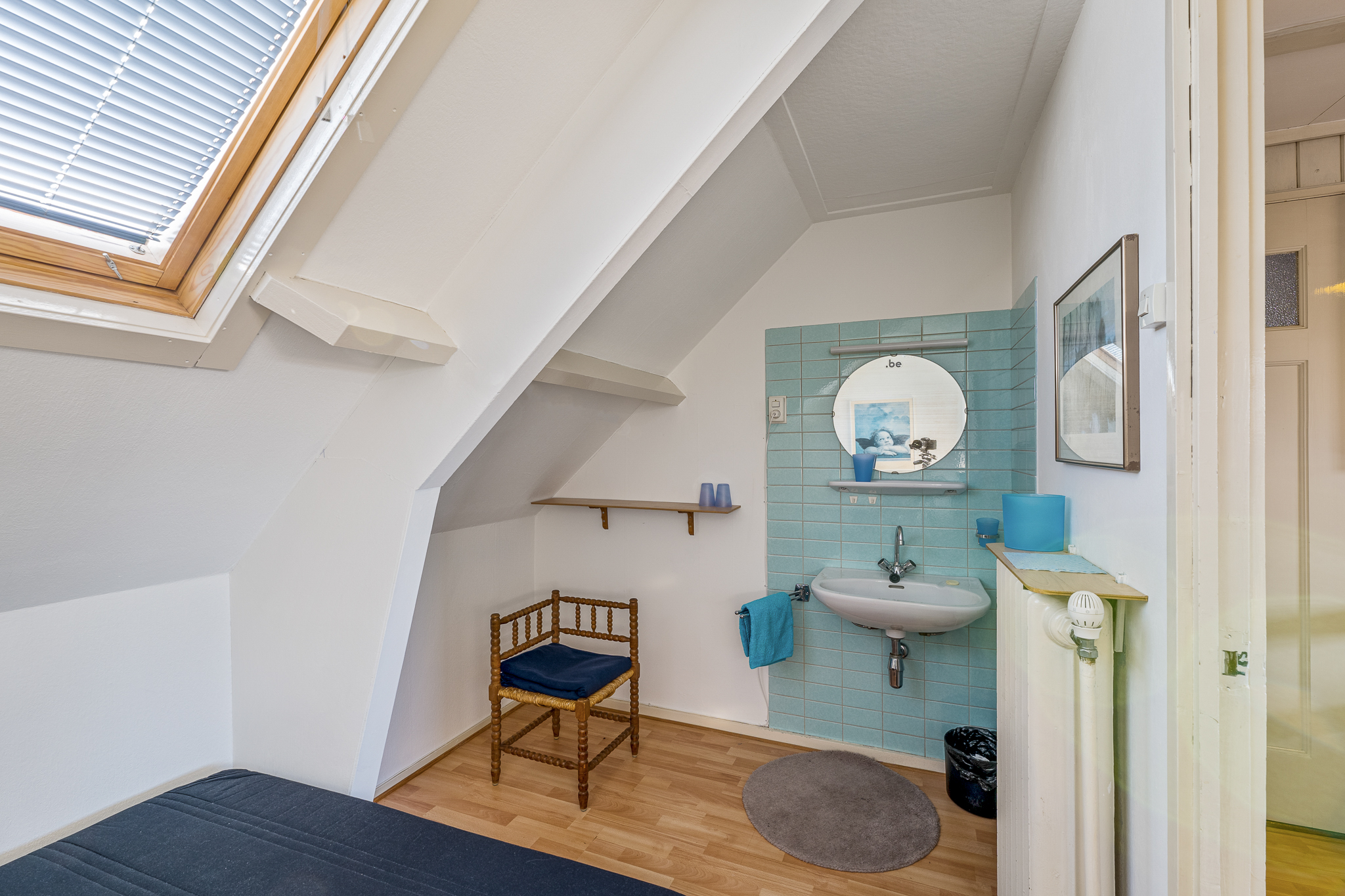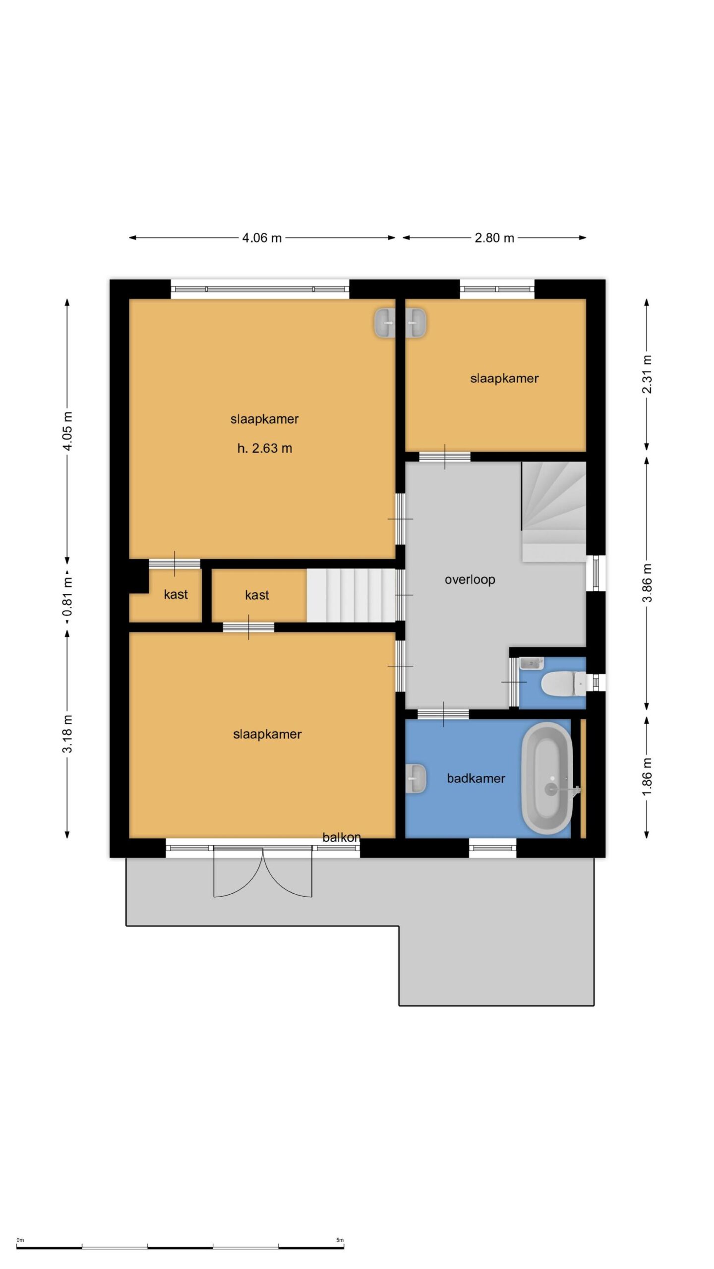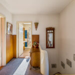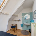 Eerste verdieping: overloop met separaat toilet, drie slaapkamers en de badkamer, voorzien van ligbad en wastafel. Aan de achterzijde bevindt zich een balkon bereikbaar vanuit de hoofdslaapkamer.