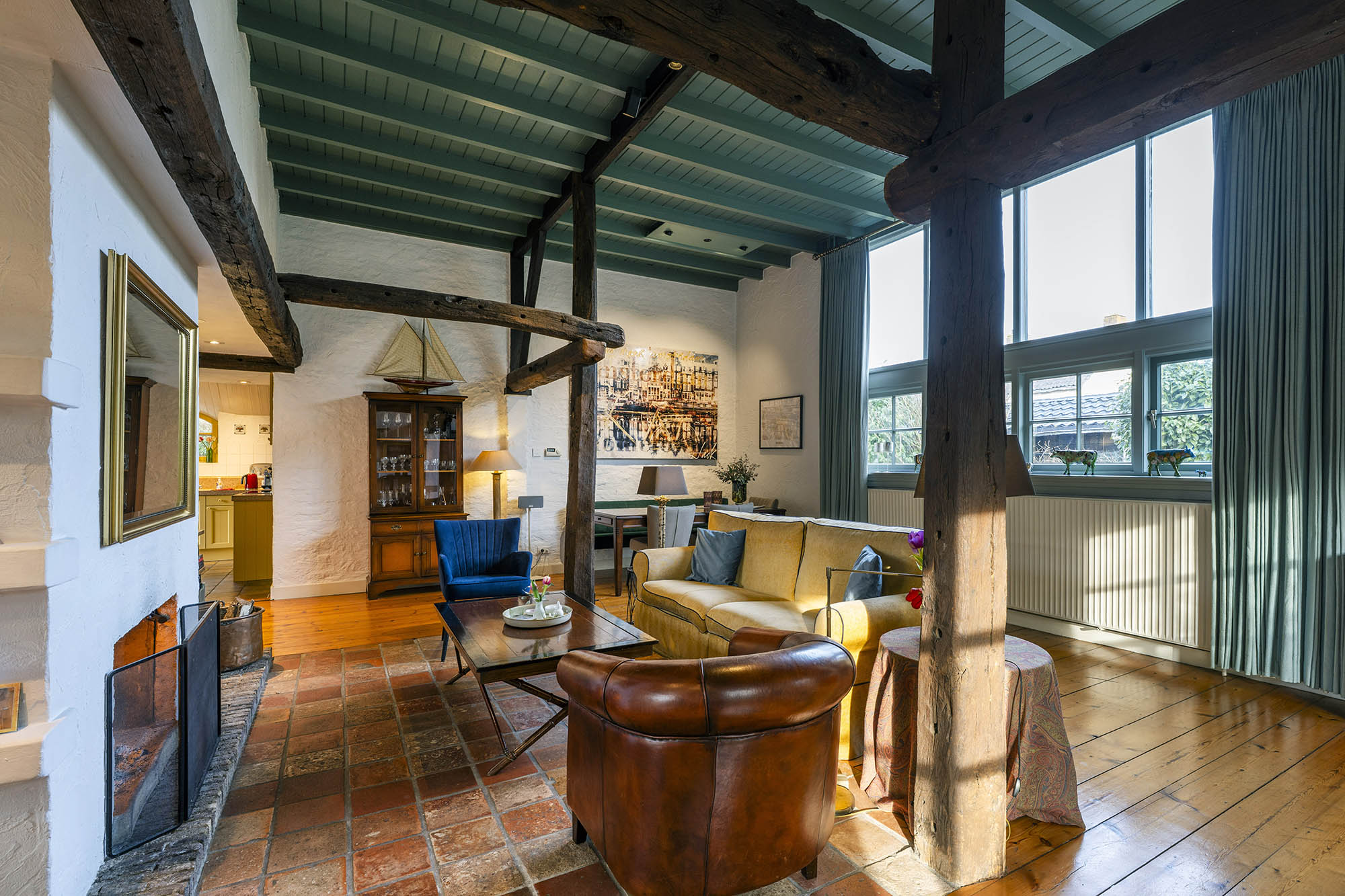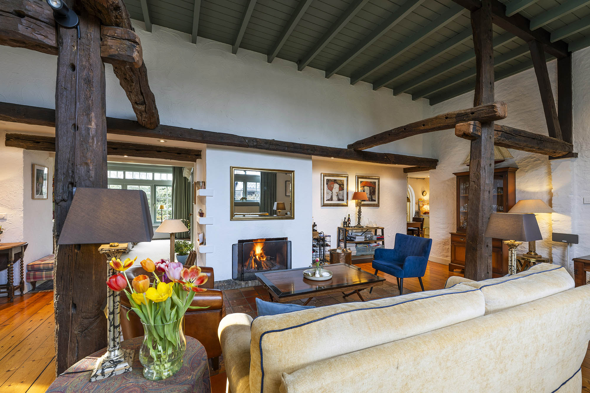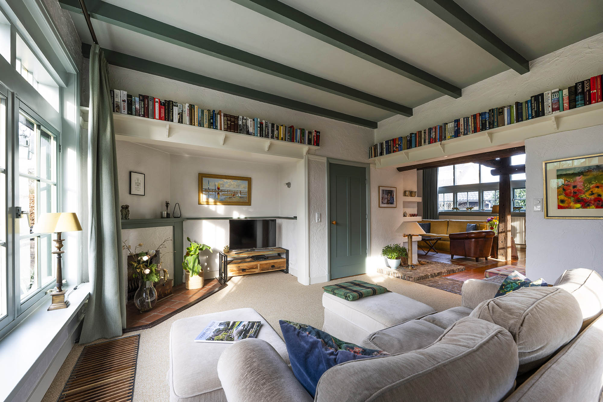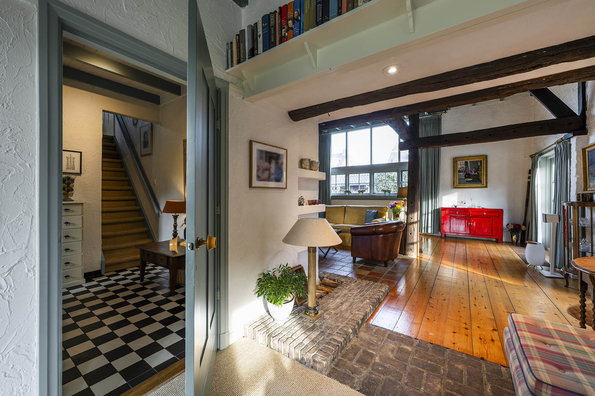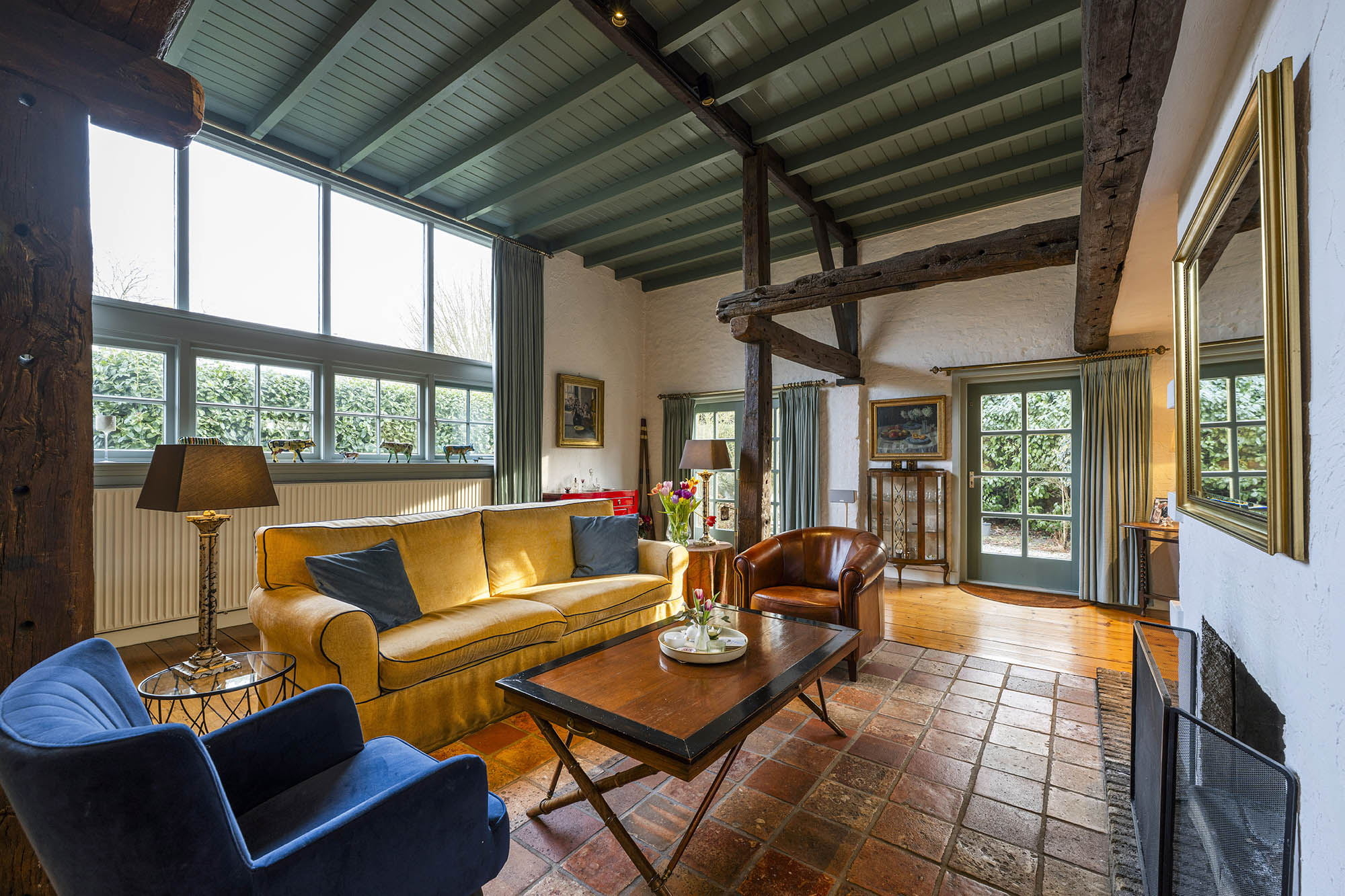 De ruime hal geeft toegang tot een werkkamer en een lichte lees-/tv-kamer met open haard en vaste boekenkasten. Het voormalige atelier (54 m²) vormt de royale living met indrukwekkende raampartijen, balkenplafond, open haard en openslaande deuren naar de tuin. De aangrenzende eetkeuken waar het fijn…