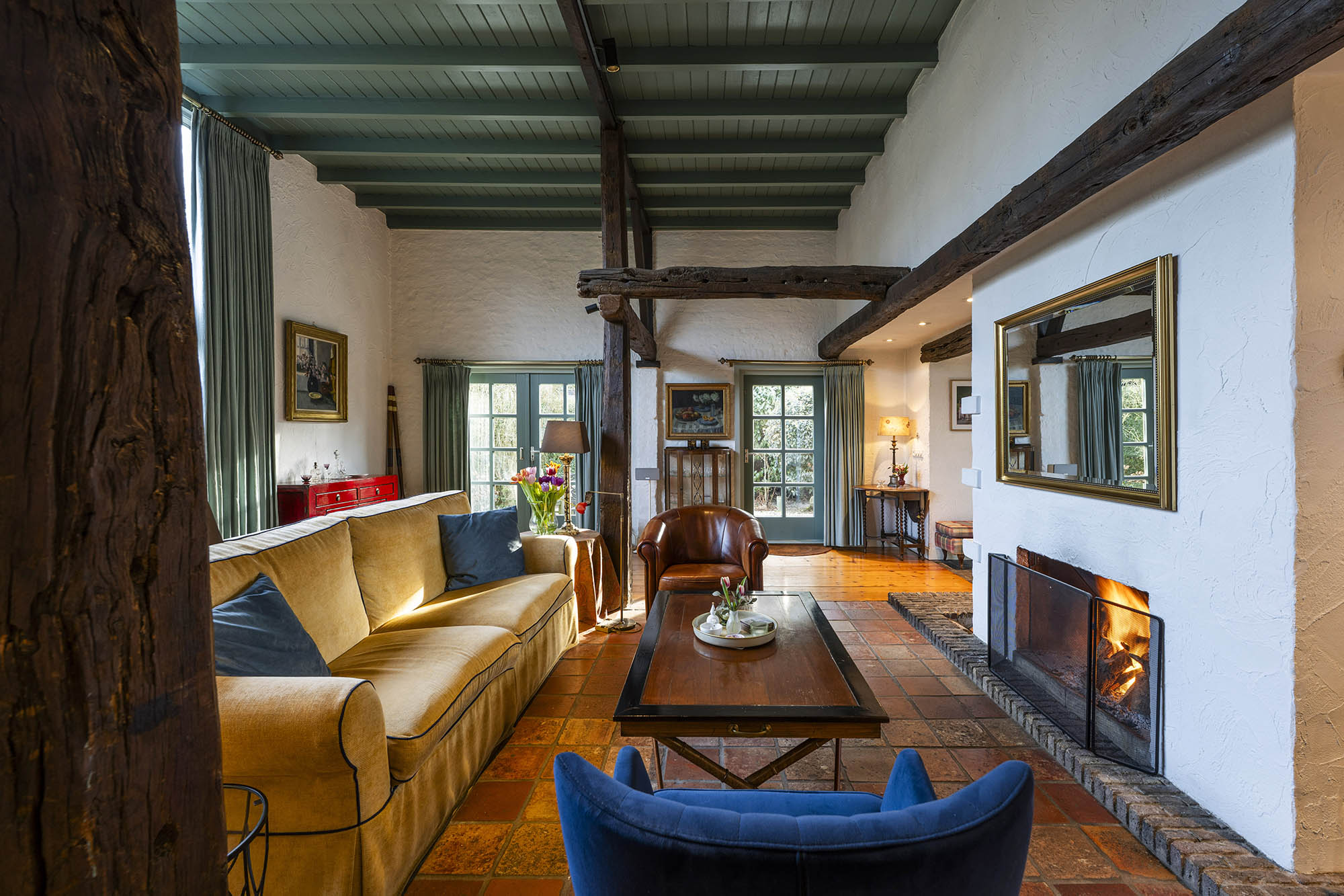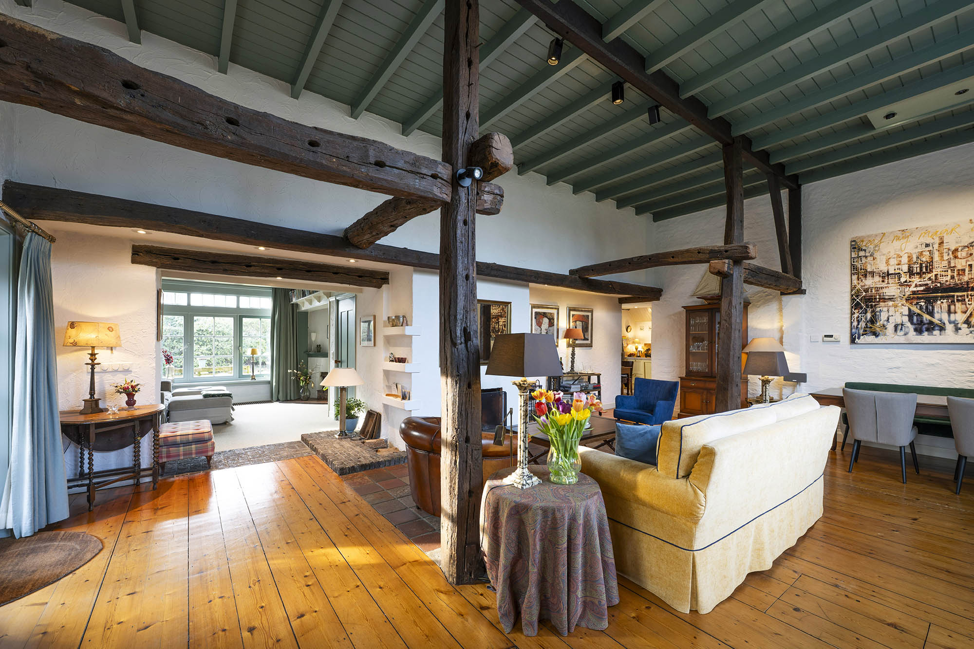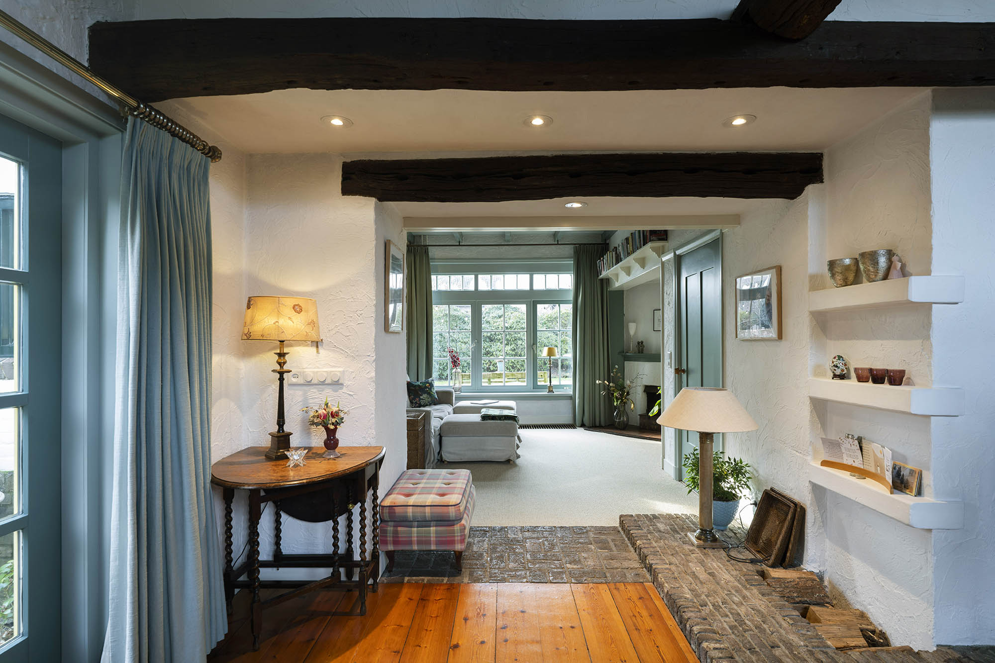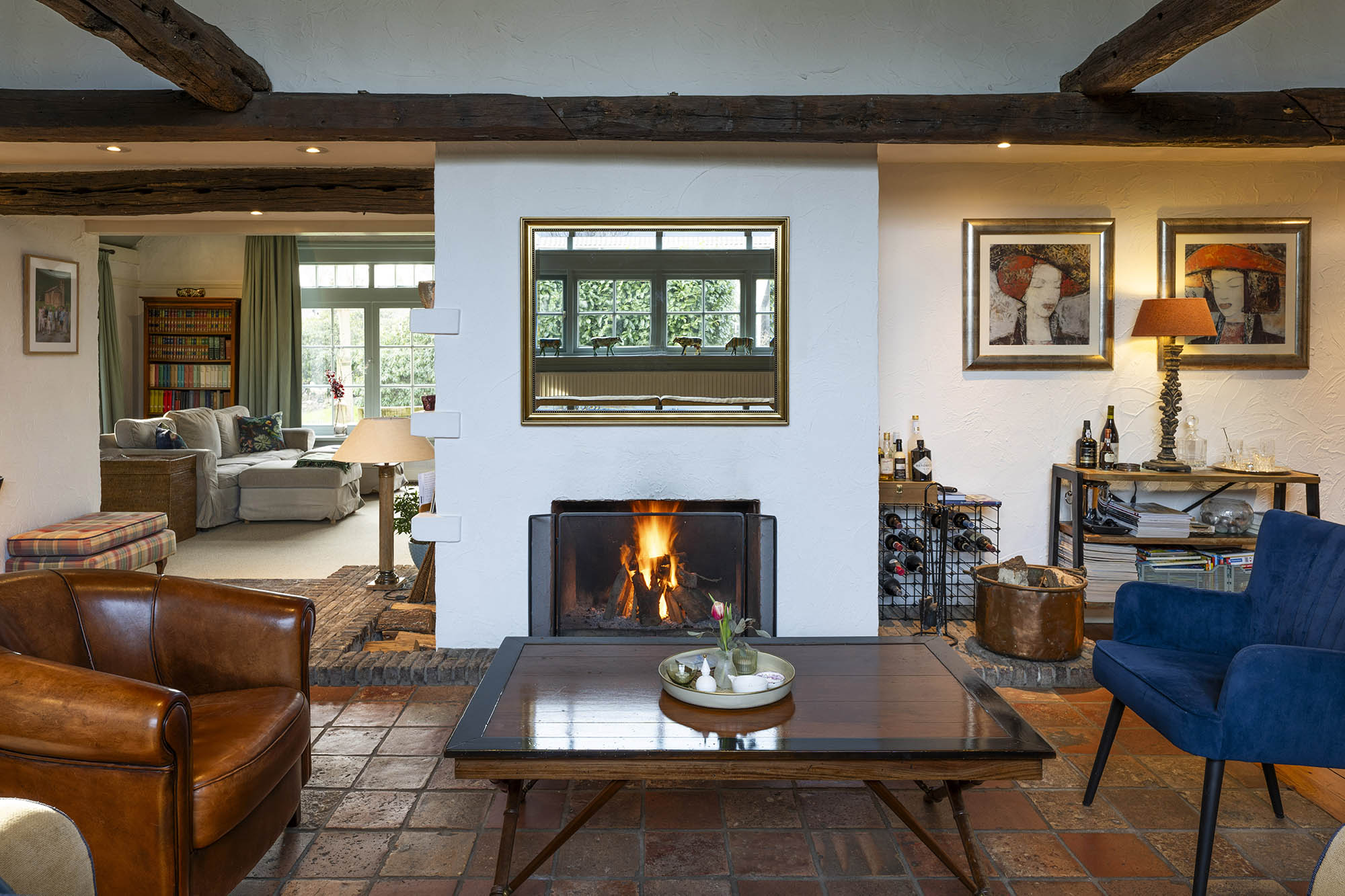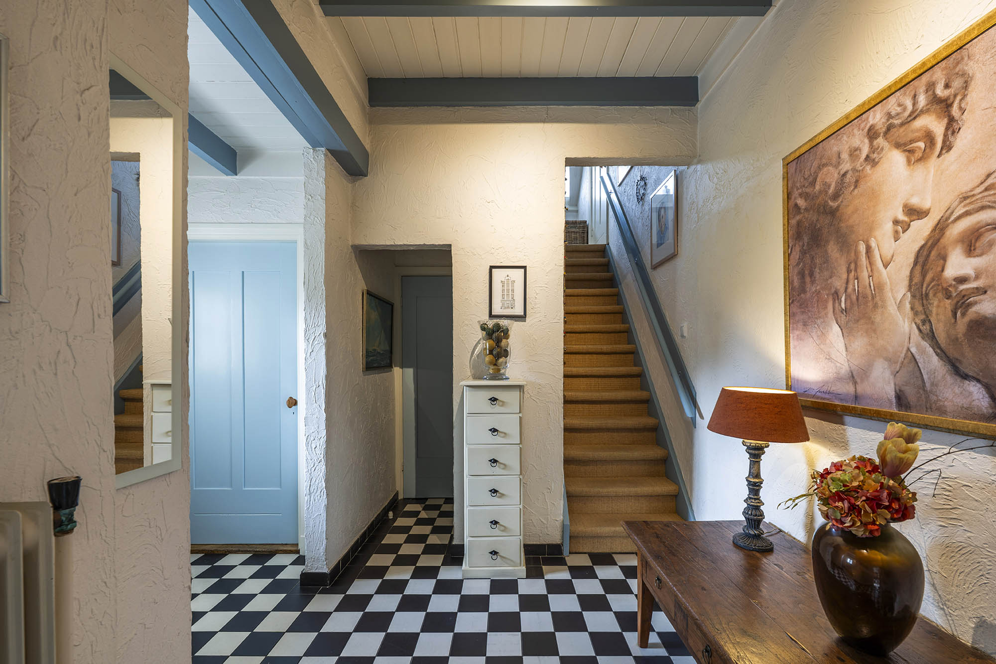 De ruime hal geeft toegang tot een werkkamer en een lichte lees-/tv-kamer met open haard en vaste boekenkasten. Het voormalige atelier (54 m²) vormt de royale living met indrukwekkende raampartijen, balkenplafond, open haard en openslaande deuren naar de tuin. De aangrenzende eetkeuken waar het fijn…