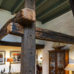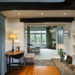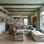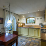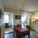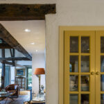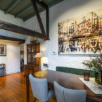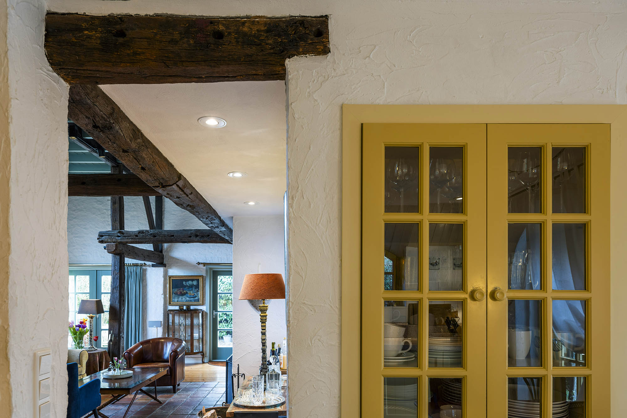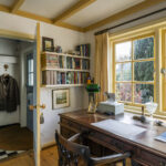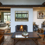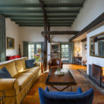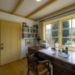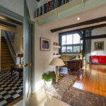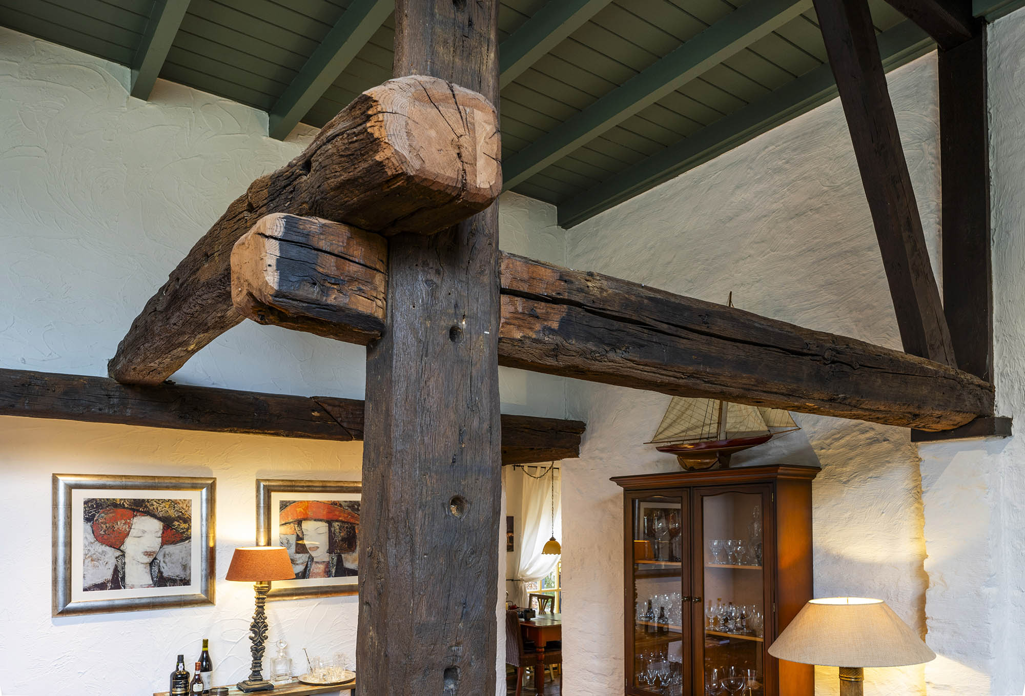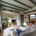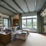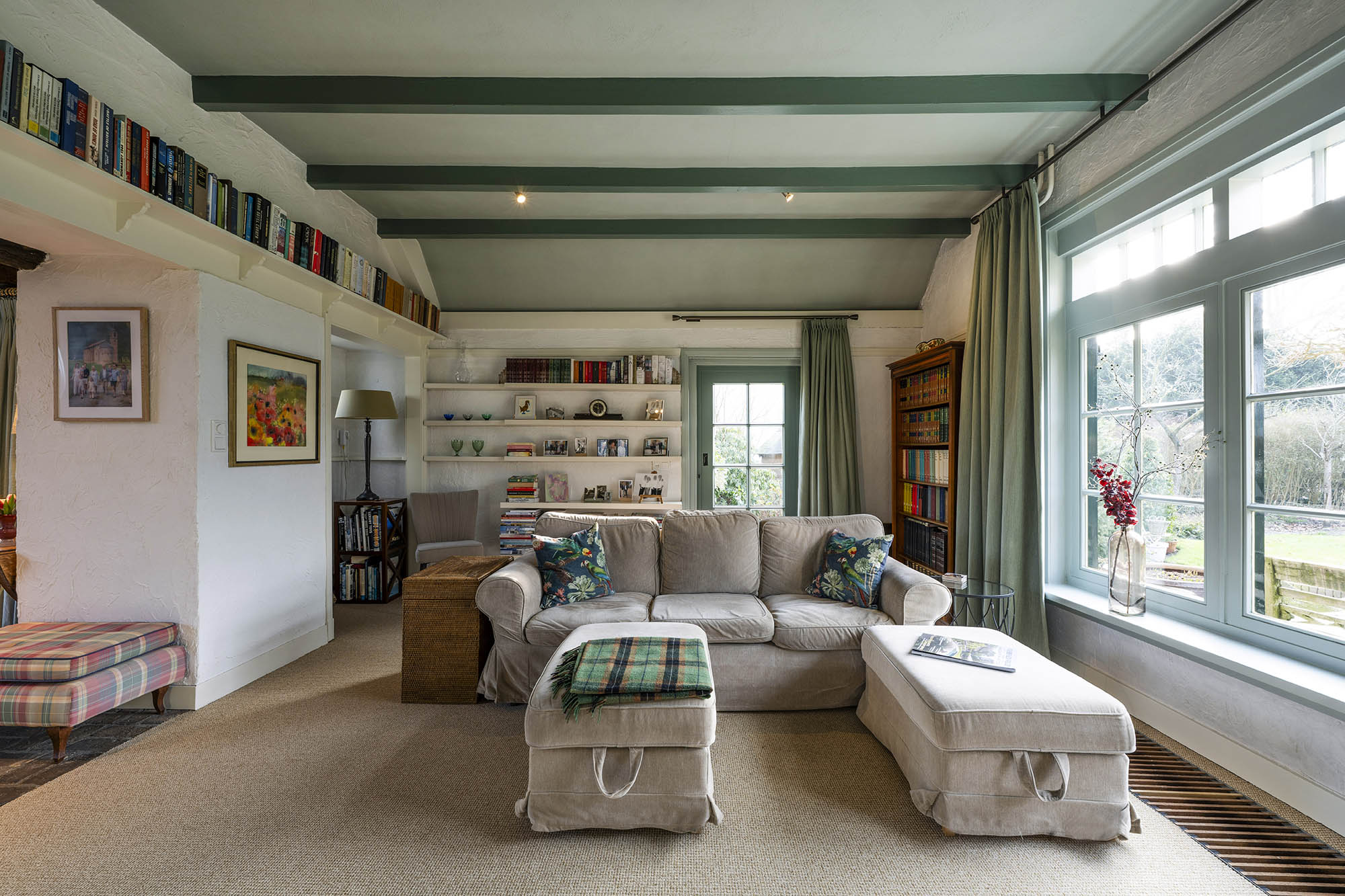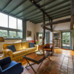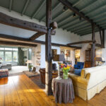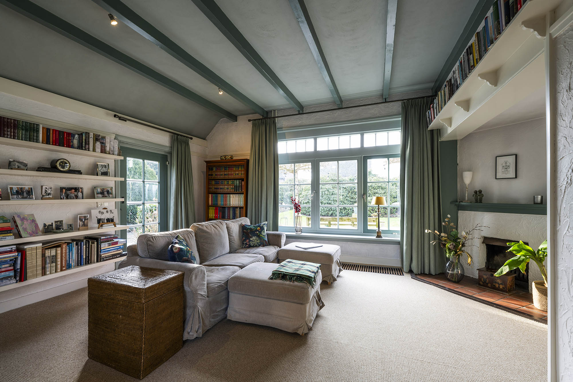 De ruime hal geeft toegang tot een werkkamer en een lichte lees-/tv-kamer met open haard en vaste boekenkasten. Het voormalige atelier (54 m²) vormt de royale living met indrukwekkende raampartijen, balkenplafond, open haard en openslaande deuren naar de tuin. De aangrenzende eetkeuken waar het fijn…