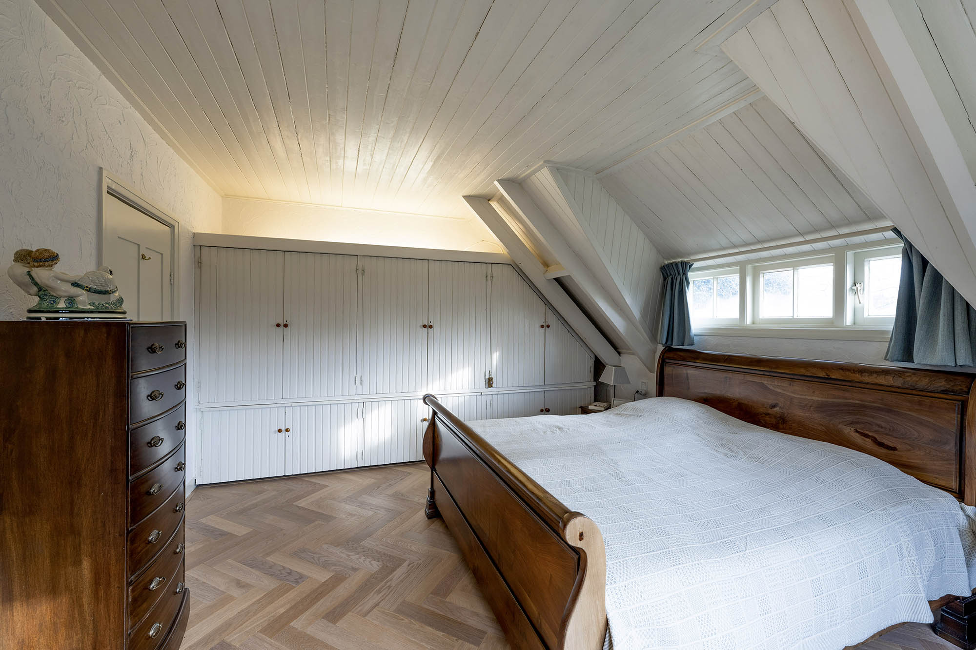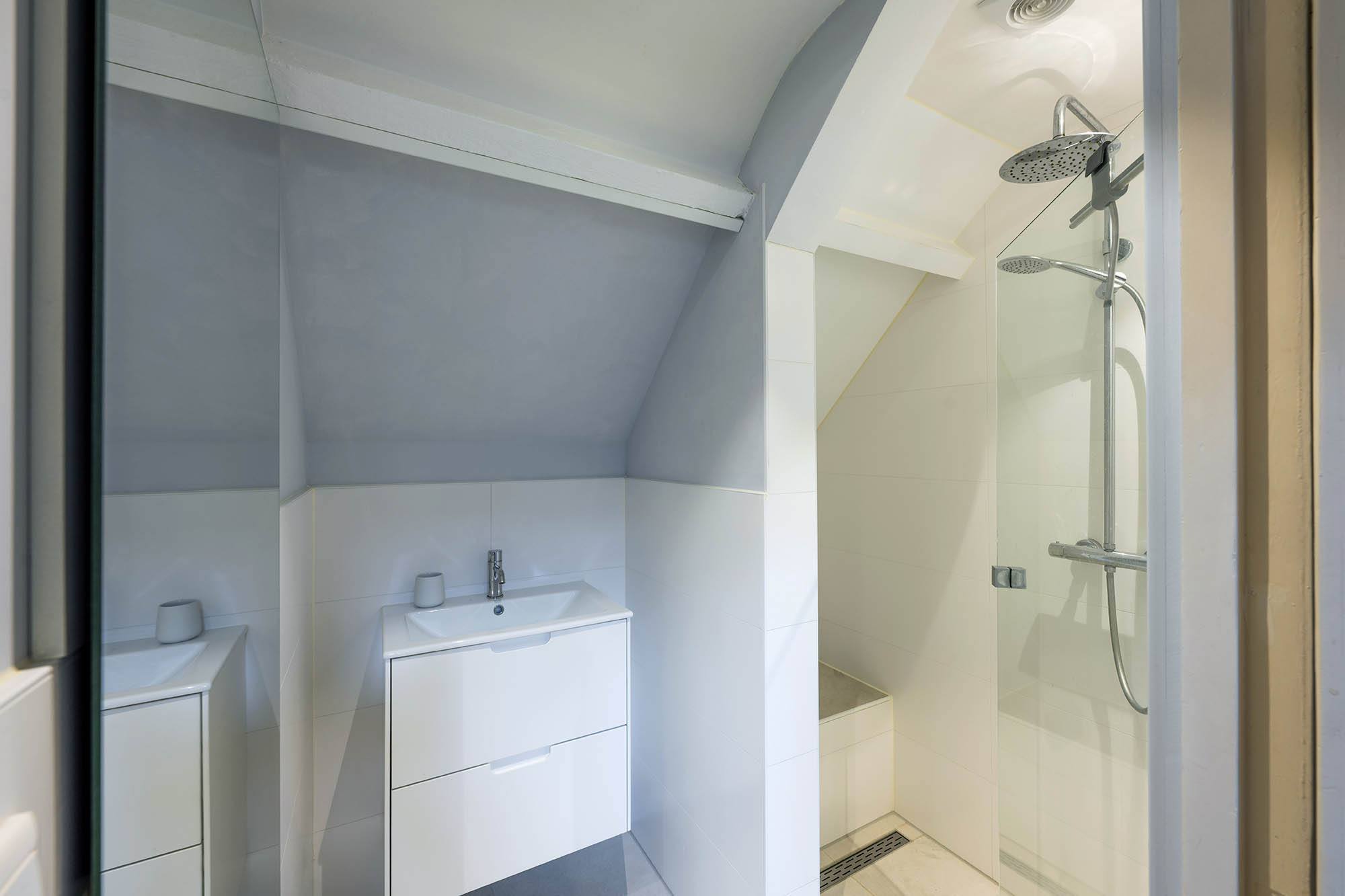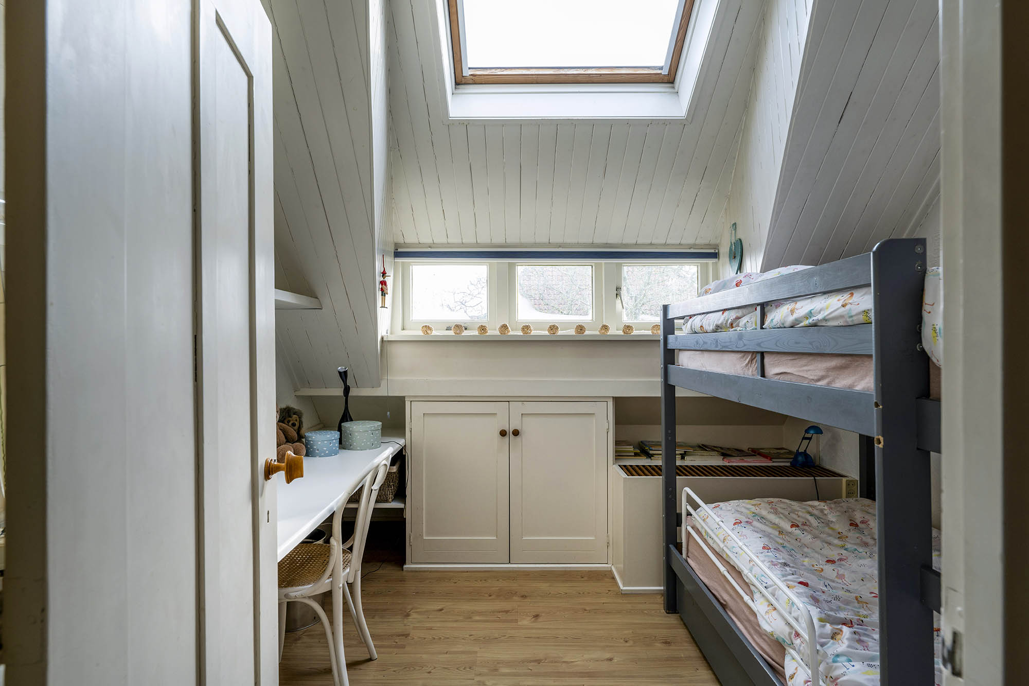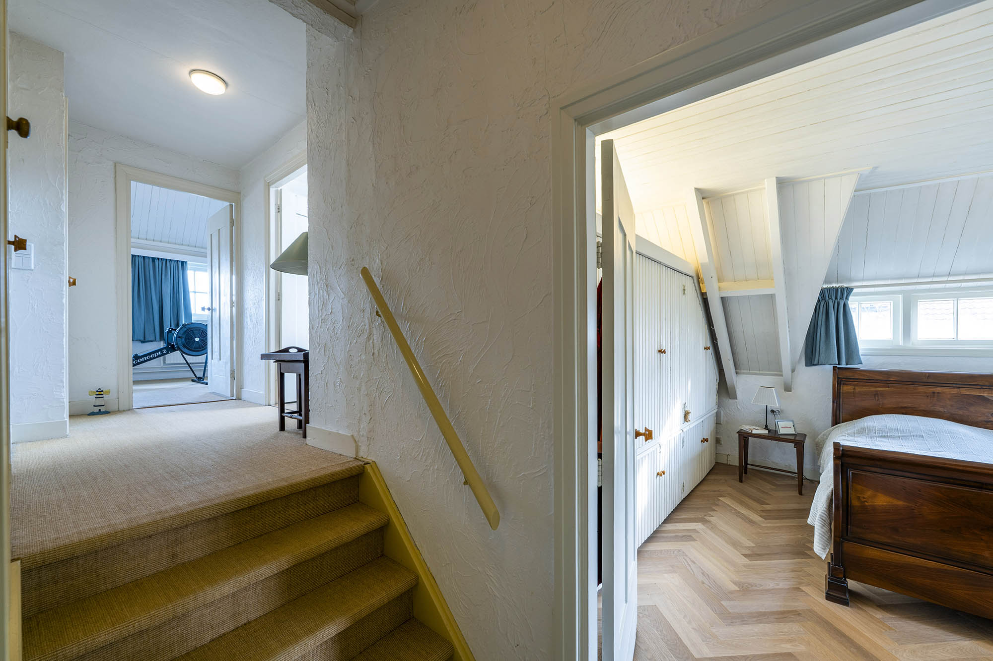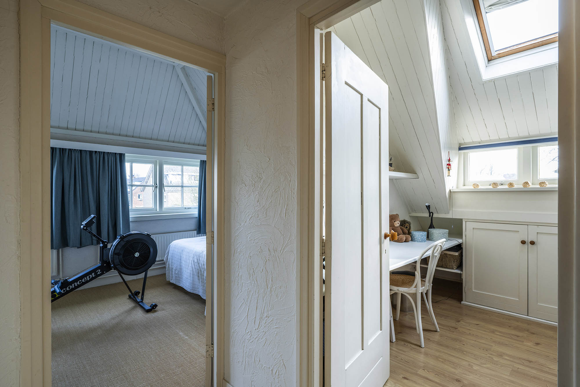 De verdieping telt vier slaapkamers, twee badkamers, tweede toilet en diverse inbouwkasten. De master bedroom heeft een badkamer en suite met inloopdouche en dubbele wastafel. De speelse indeling en authentieke details maken deze etage even charmant als praktisch.