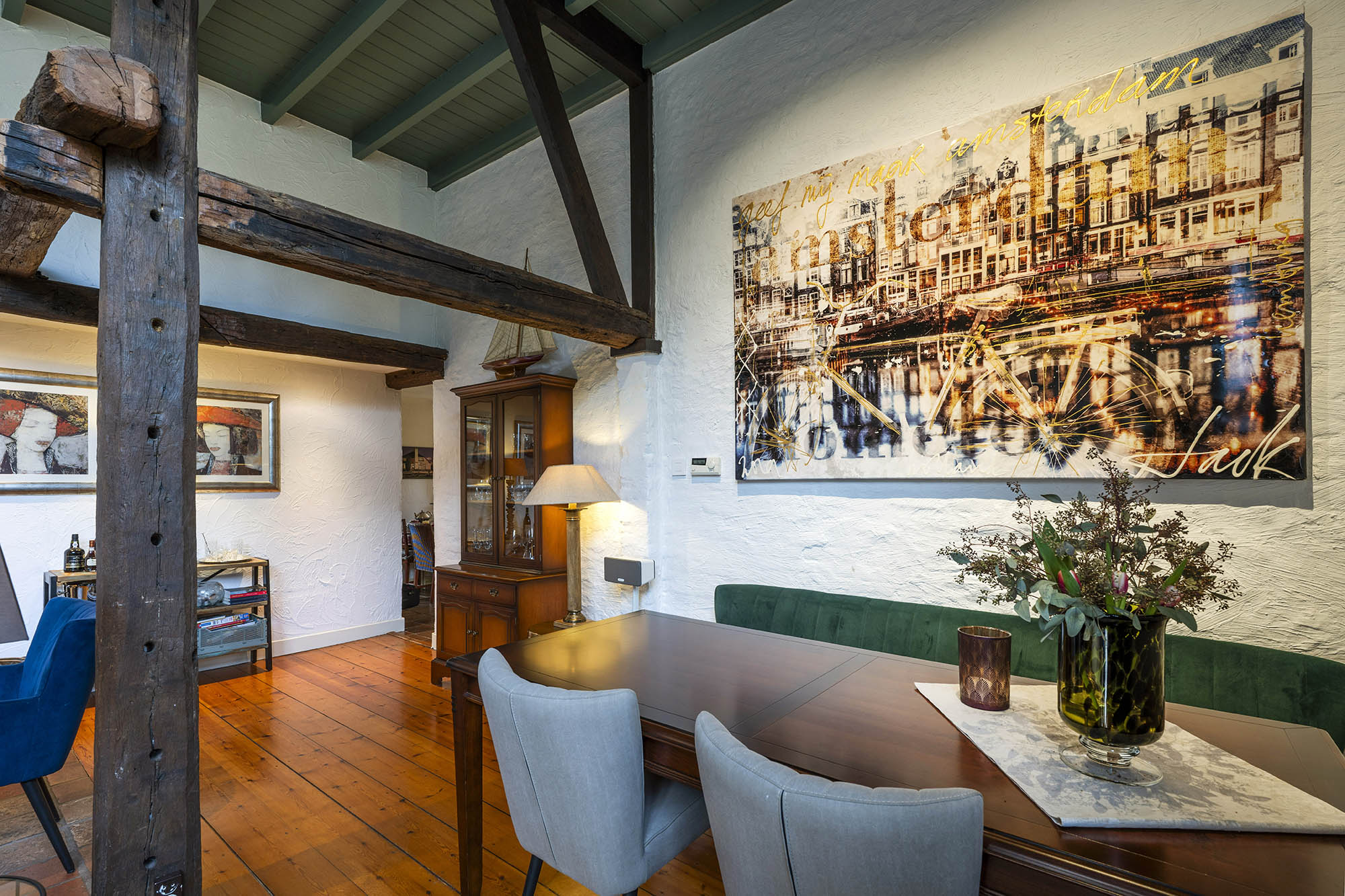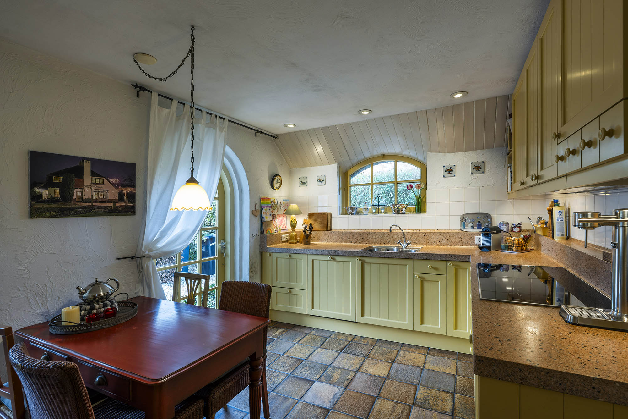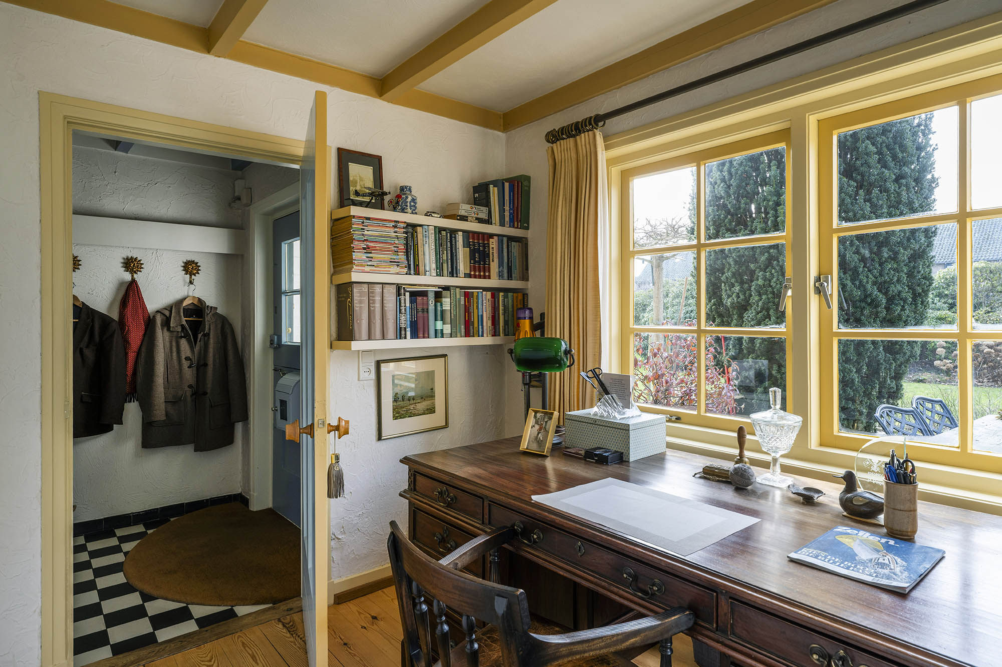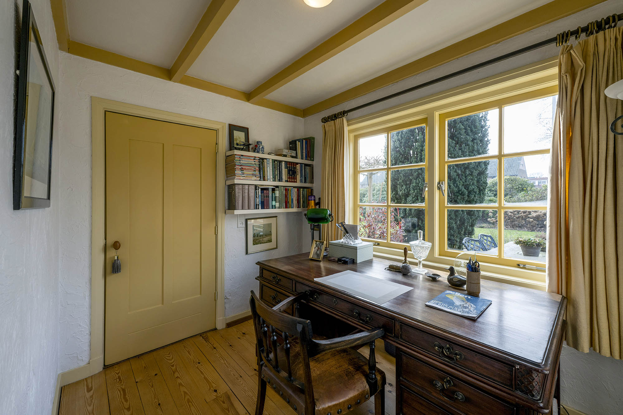 De ruime hal geeft toegang tot een werkkamer en een lichte lees-/tv-kamer met open haard en vaste boekenkasten. Het voormalige atelier (54 m²) vormt de royale living met indrukwekkende raampartijen, balkenplafond, open haard en openslaande deuren naar de tuin. De aangrenzende eetkeuken waar het fijn koken en verblijven is. De bijkeuken biedt volop functionele ruimte met oven en grote koel/vriescombinatie en veel kastruimte. Aansluitend bevindt zich een tweede werk- of slaapkamer met lichtkoepel.