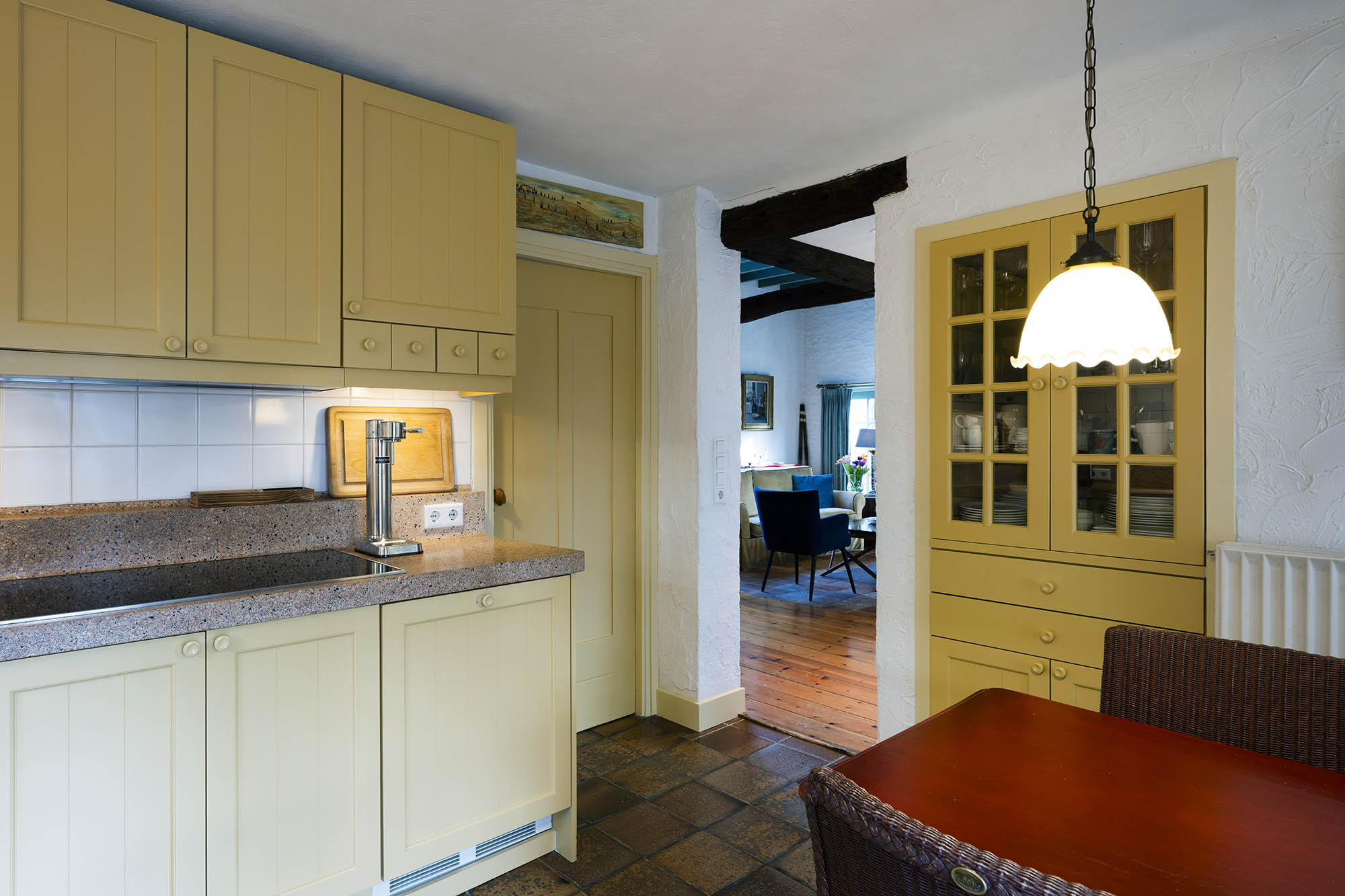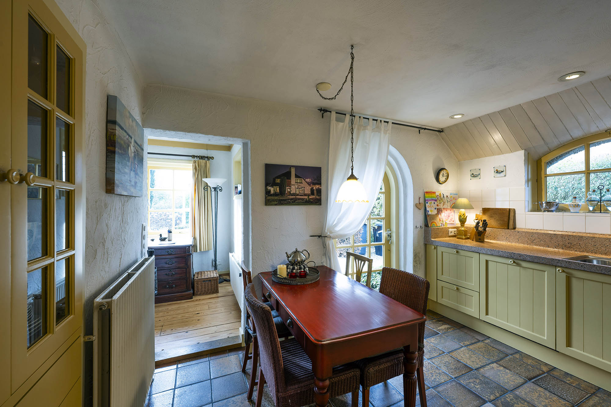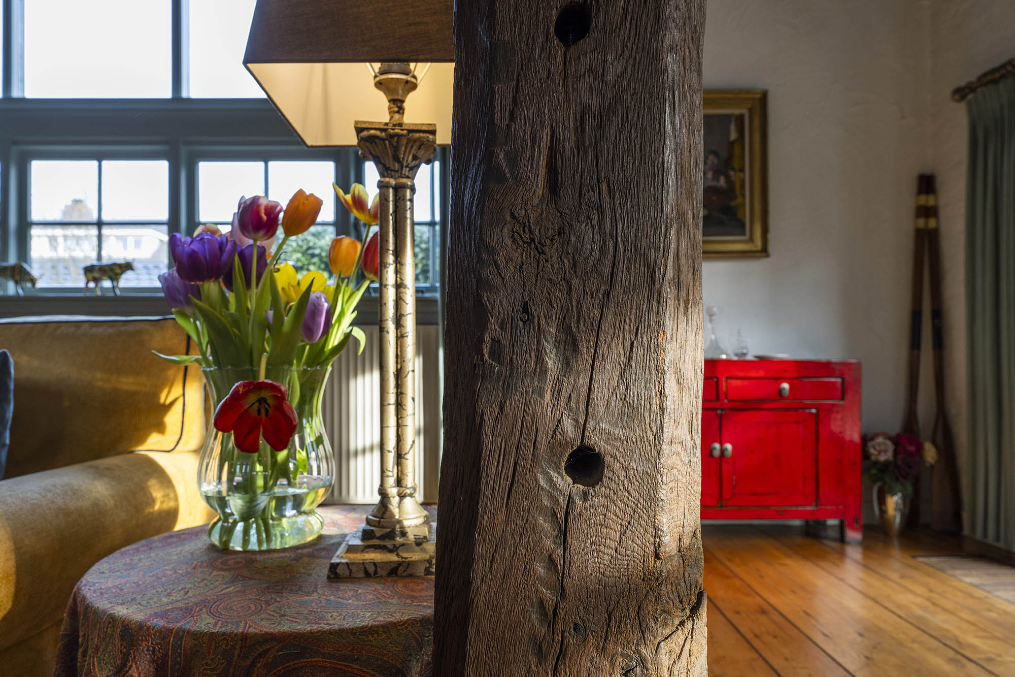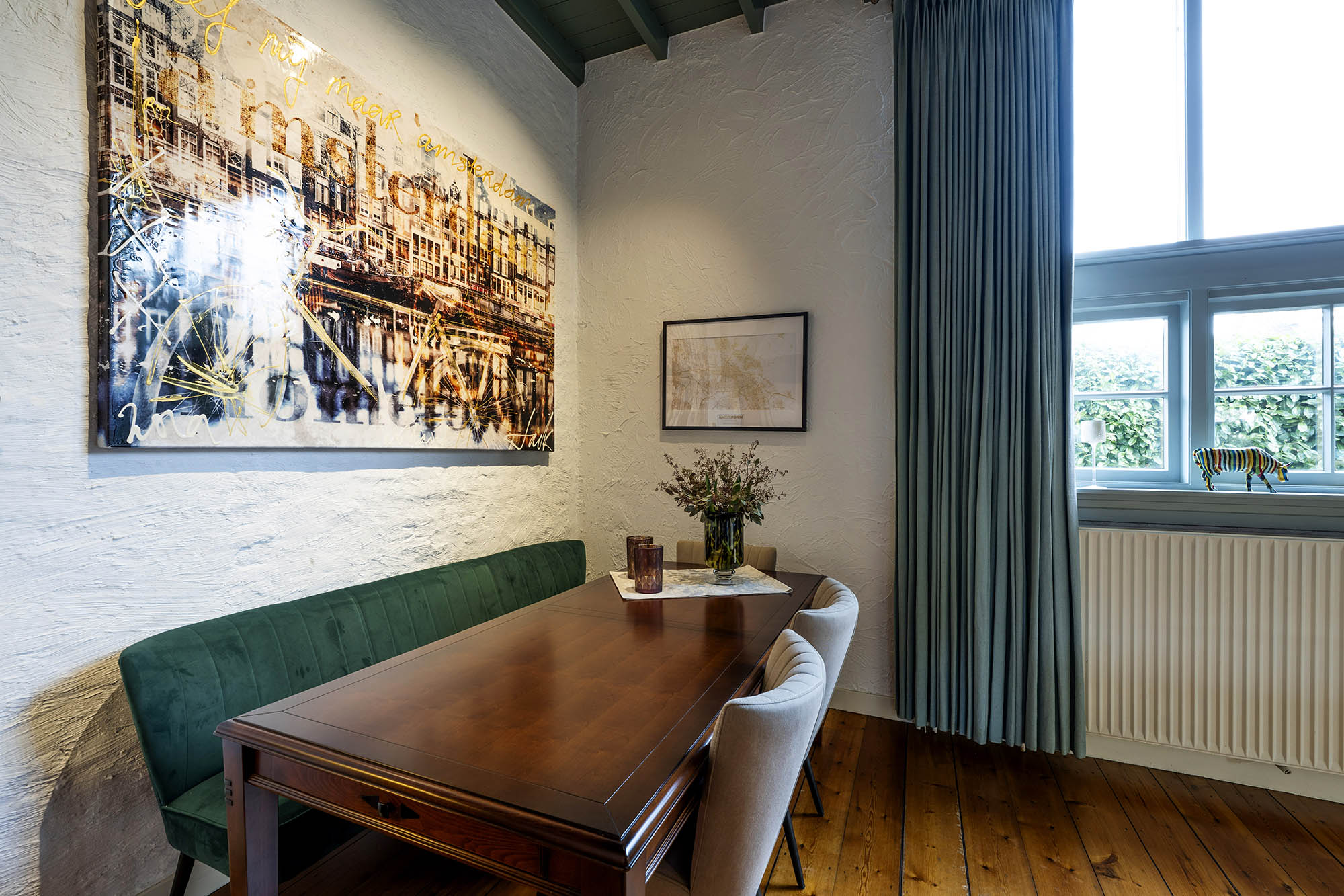 De ruime hal geeft toegang tot een werkkamer en een lichte lees-/tv-kamer met open haard en vaste boekenkasten. Het voormalige atelier (54 m²) vormt de royale living met indrukwekkende raampartijen, balkenplafond, open haard en openslaande deuren naar de tuin. De aangrenzende eetkeuken waar het fijn koken en verblijven is. De bijkeuken biedt volop functionele ruimte met oven en grote koel/vriescombinatie en veel kastruimte. Aansluitend bevindt zich een tweede werk- of slaapkamer met lichtkoepel.