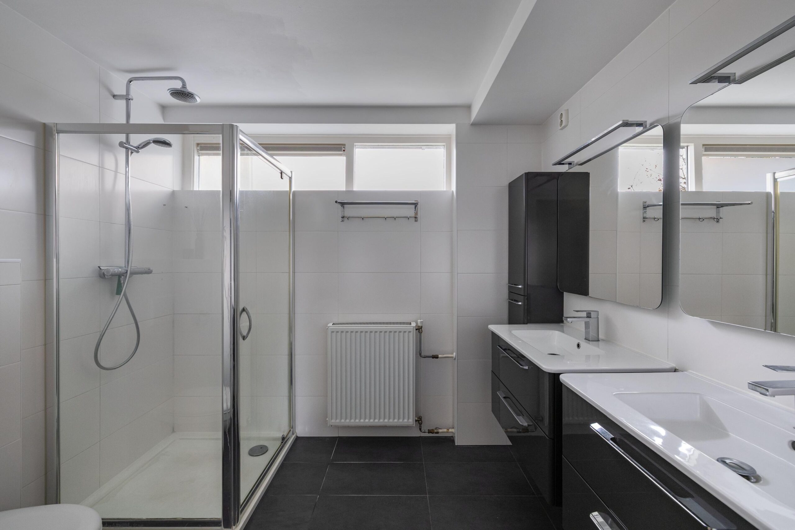 De overloop biedt toegang tot drie goed bemeten slaapkamers, allen voorzien van glad stucwerk en keurige vloeren. De moderne badkamer beschikt over een douche, toilet en een dubbele wastafel met meubel.