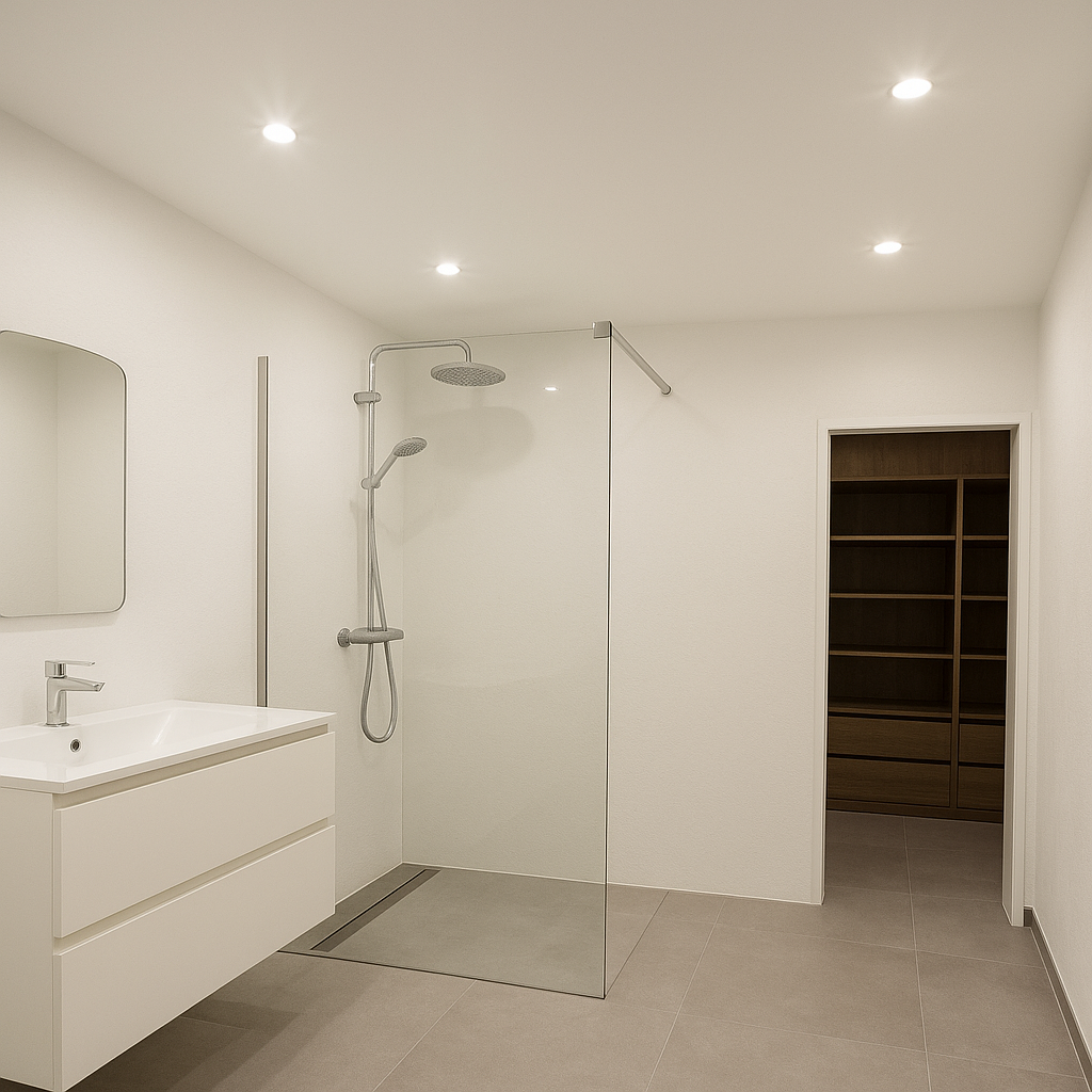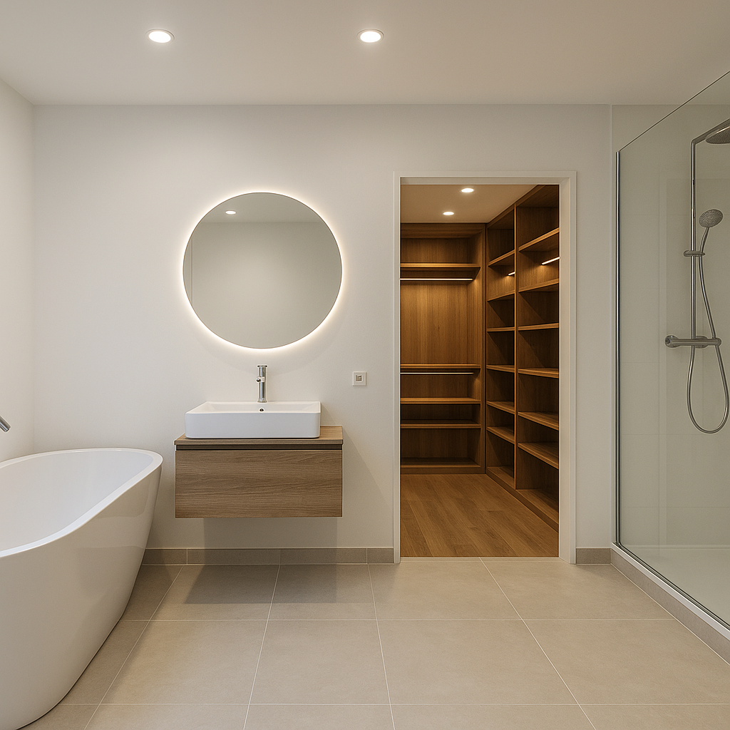 Overloop met separaat toilet, bergkast en kast met cv-ketel. De ouderslaapkamer bevindt zich aan de voorzijde. Aan de achterzijde vindt u een ruime tweede en derde slaapkamer, beiden met airconditioning (ook voor verwarming). De grote badkamer is uitgerust met een ligbad, separate douche, dubbele wastafel en designradiator. Vanuit de badkamer komt u in de zeer ruime kleedkamer