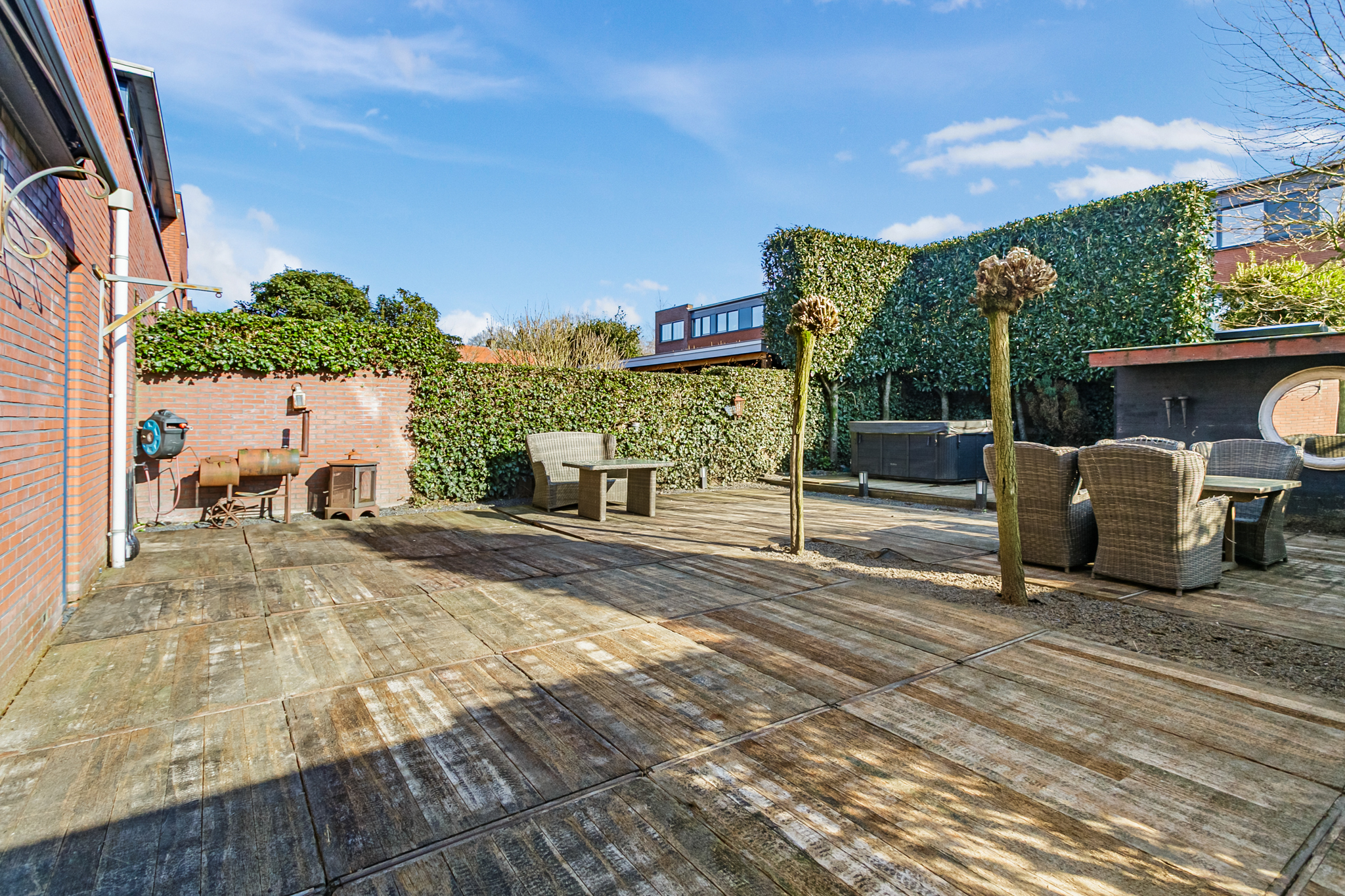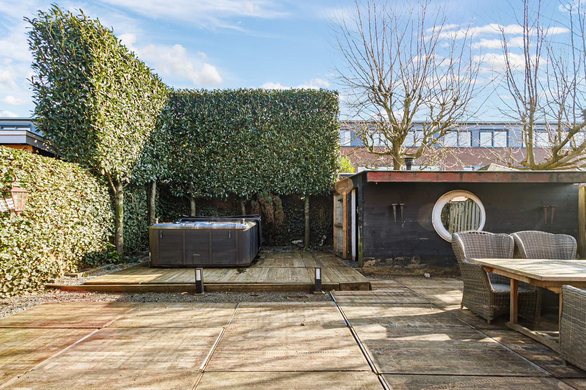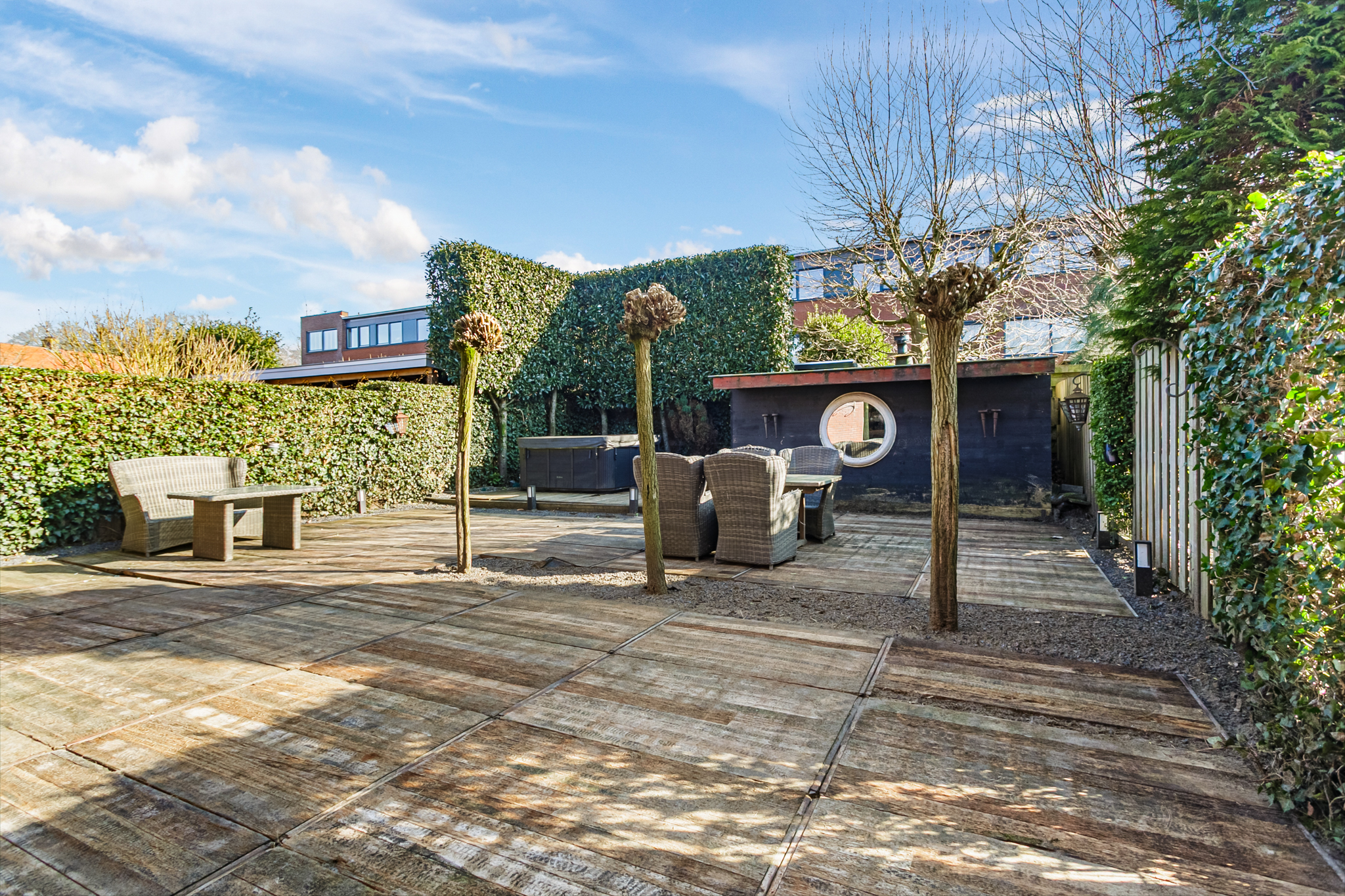 De achtertuin is circa 11 meter breed en 14 meter diep en is fraai aangelegd met groot terras, groen en een ruime overkapping achterin de tuin. Dankzij de gunstige zonligging is er de hele dag door een keuze tussen zon- en schaduwplekken.