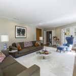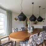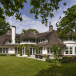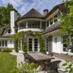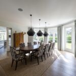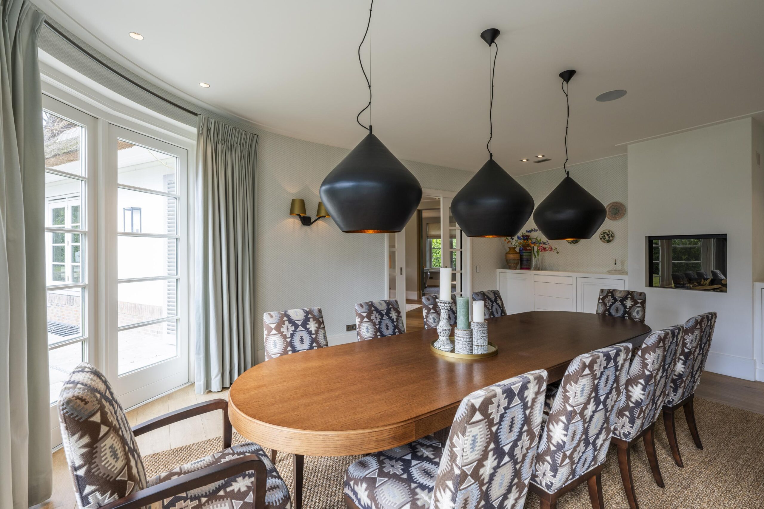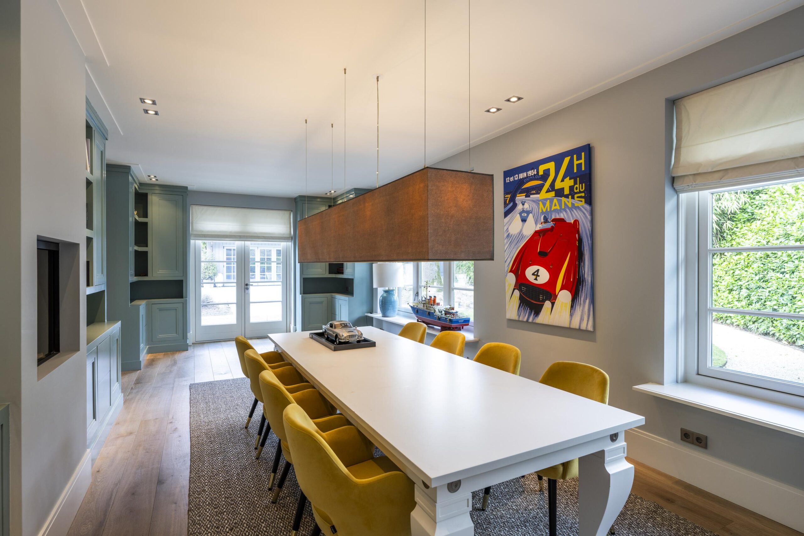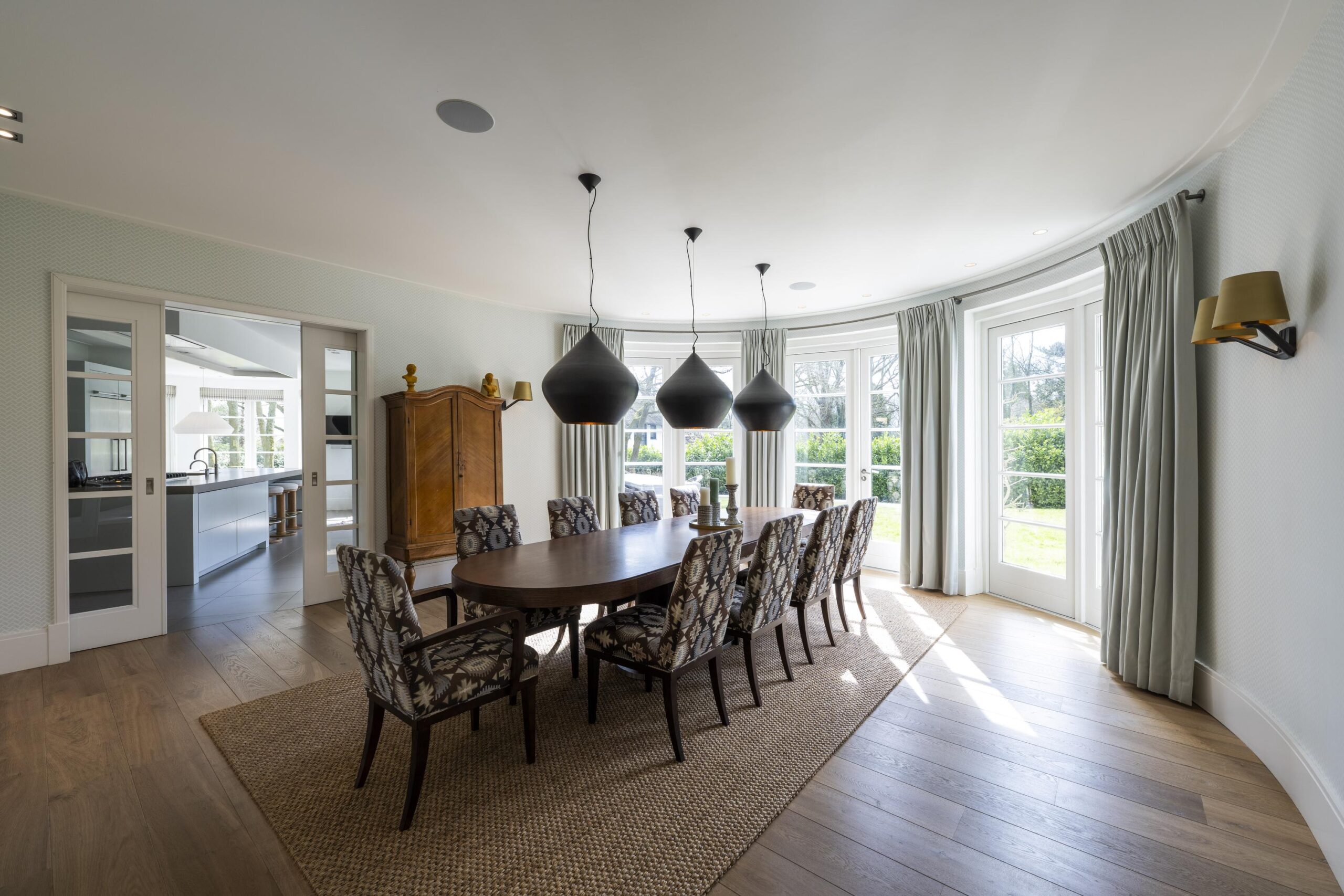 De riante woonkamer ademt rust en elegantie, hoge plafonds, een open haard en dubbele openslaande deuren naar de veranda. De aangrenzende eetkamer is gesitueerd in een karakteristieke ronde erker en leent zich perfect voor intieme diners of levendige familiebijeenkomsten. De luxueuze leefkeuken is voorzien van een groot kookeiland en hoogwaardige inbouwapparatuur – een culinaire droom voor de echte fijnproever.