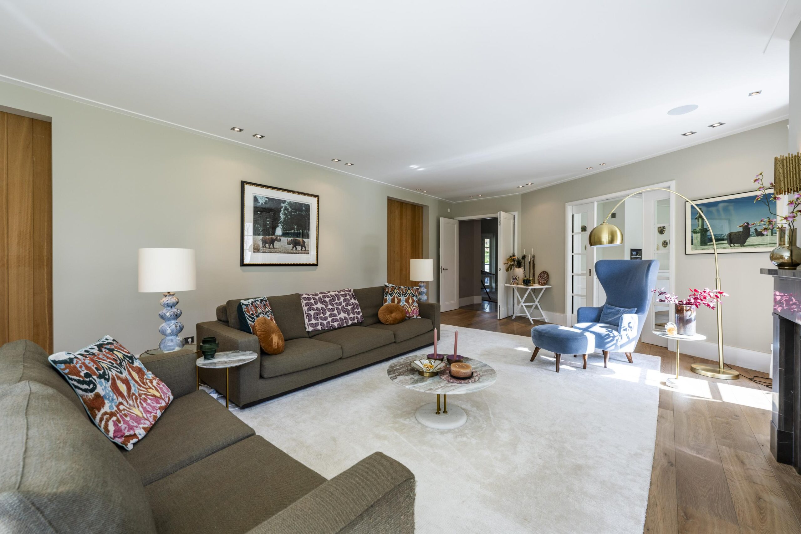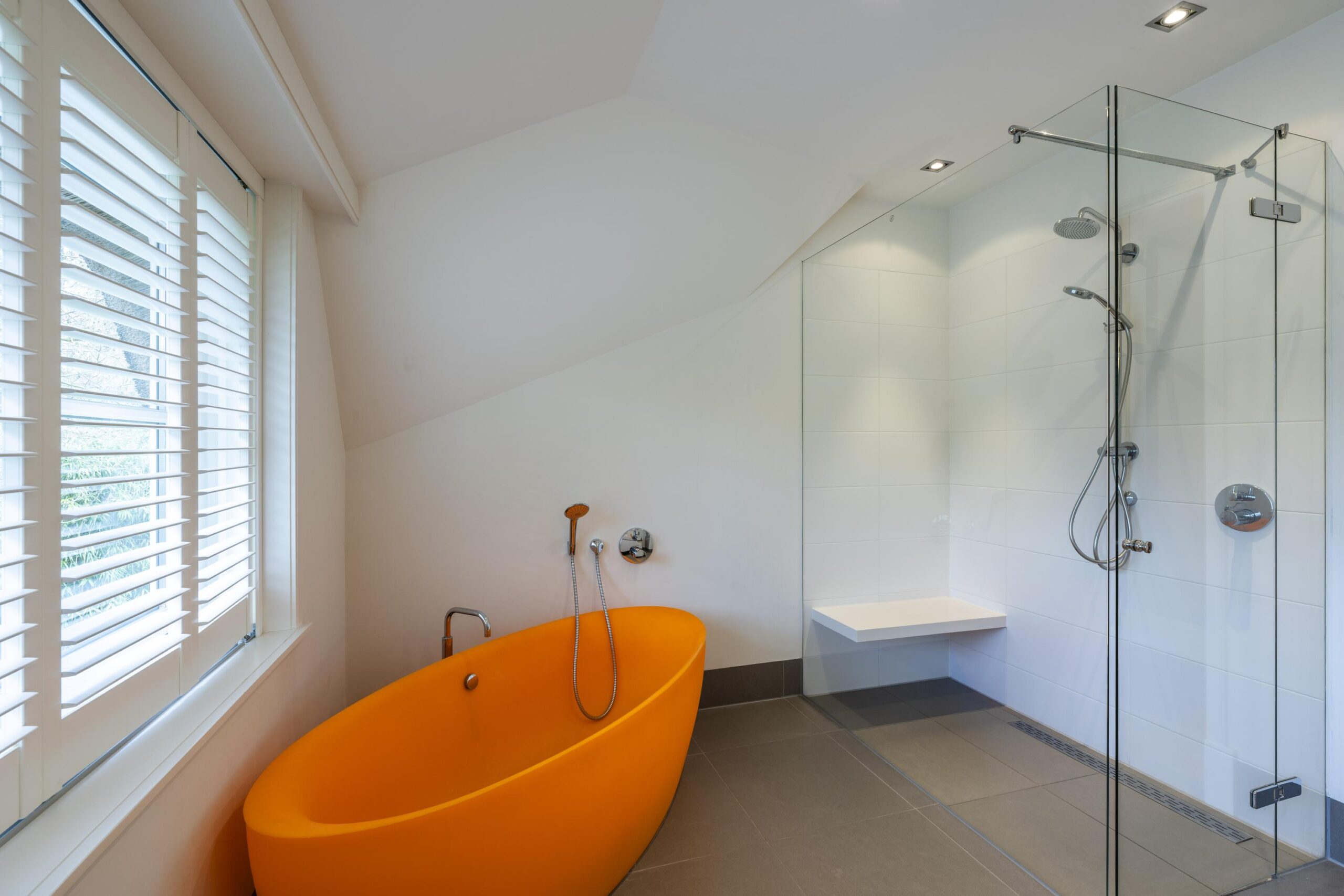 Aansluitend bevindt zich een sfeervolle TV-kamer voor ontspannen avonden, evenals een ruime bijkeuken met praktische kastruimte. Verder zijn er op deze verdieping nog een stijlvolle werkkamer, twee garderobes en een gastentoilet aanwezig. Elke ruimte is met zorg en oog voor detail afgewerkt, waardoor het geheel een gevoel van ingetogen luxe uitstraalt.