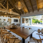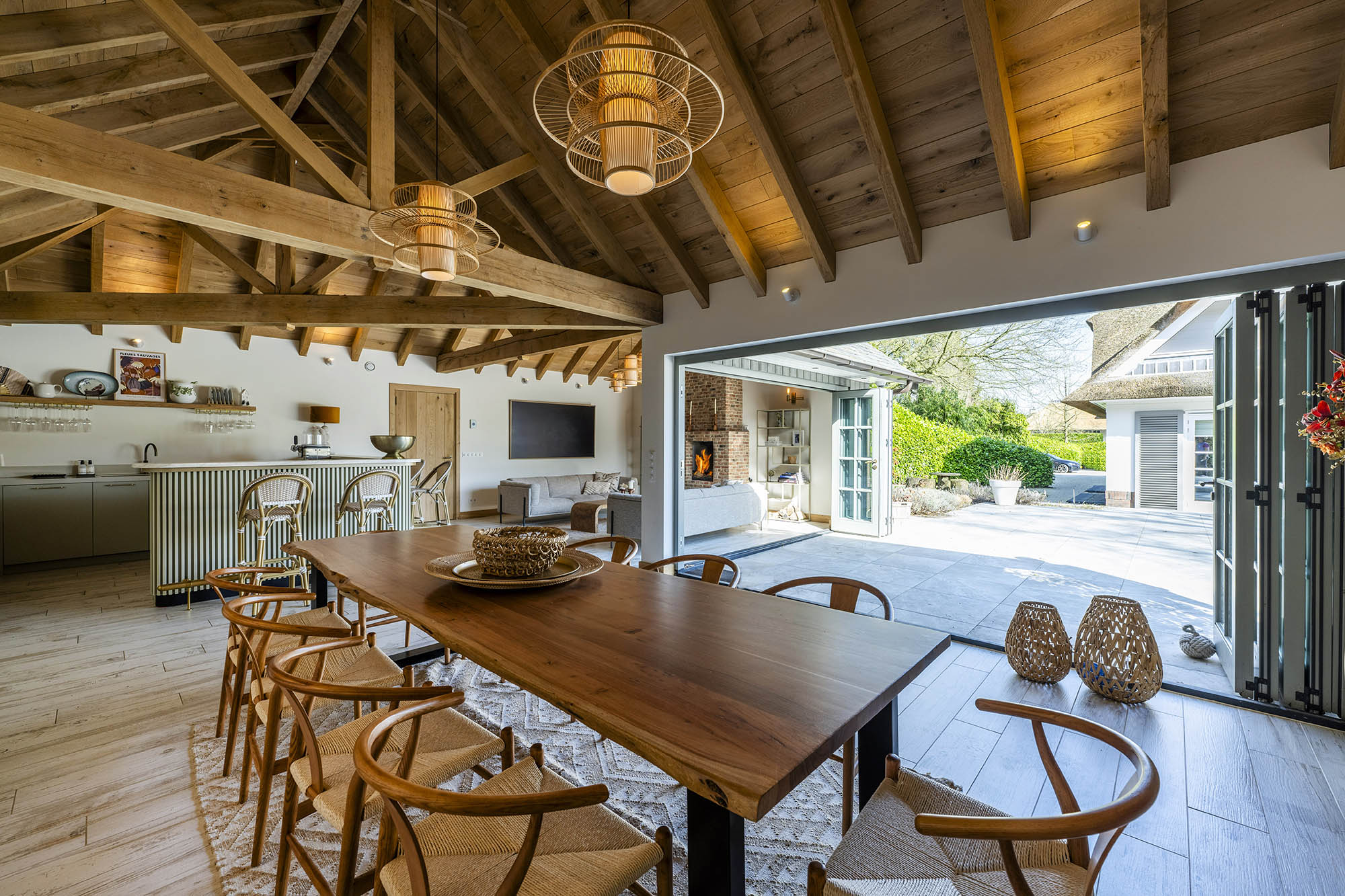 Centraal in het poolhouse bevindt zich een royale loungeruimte met harmonica deuren naar het terras en het zwembad. Dankzij de grote raampartijen valt het daglicht rijkelijk naar binnen en ontstaat een prachtige verbinding met de omliggende tuin. Het is de ideale plek om gasten te ontvangen, tot rust te komen of volop te genieten van lange zomerdagen in stijl. Door de twee houthaarden kan er ook tijdens de winterdagen ultiem genoten worden van dit verlengstuk van het woonhuis.