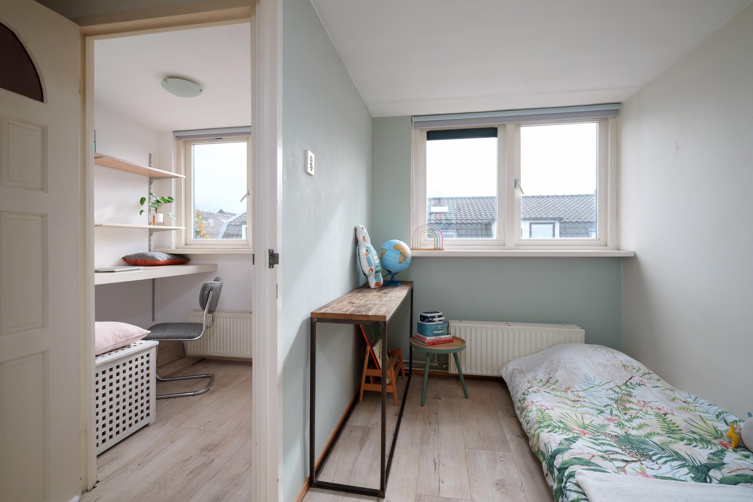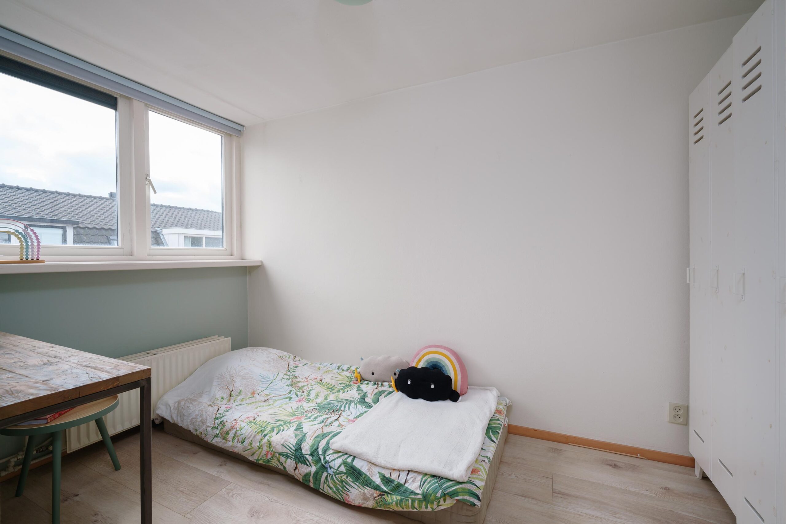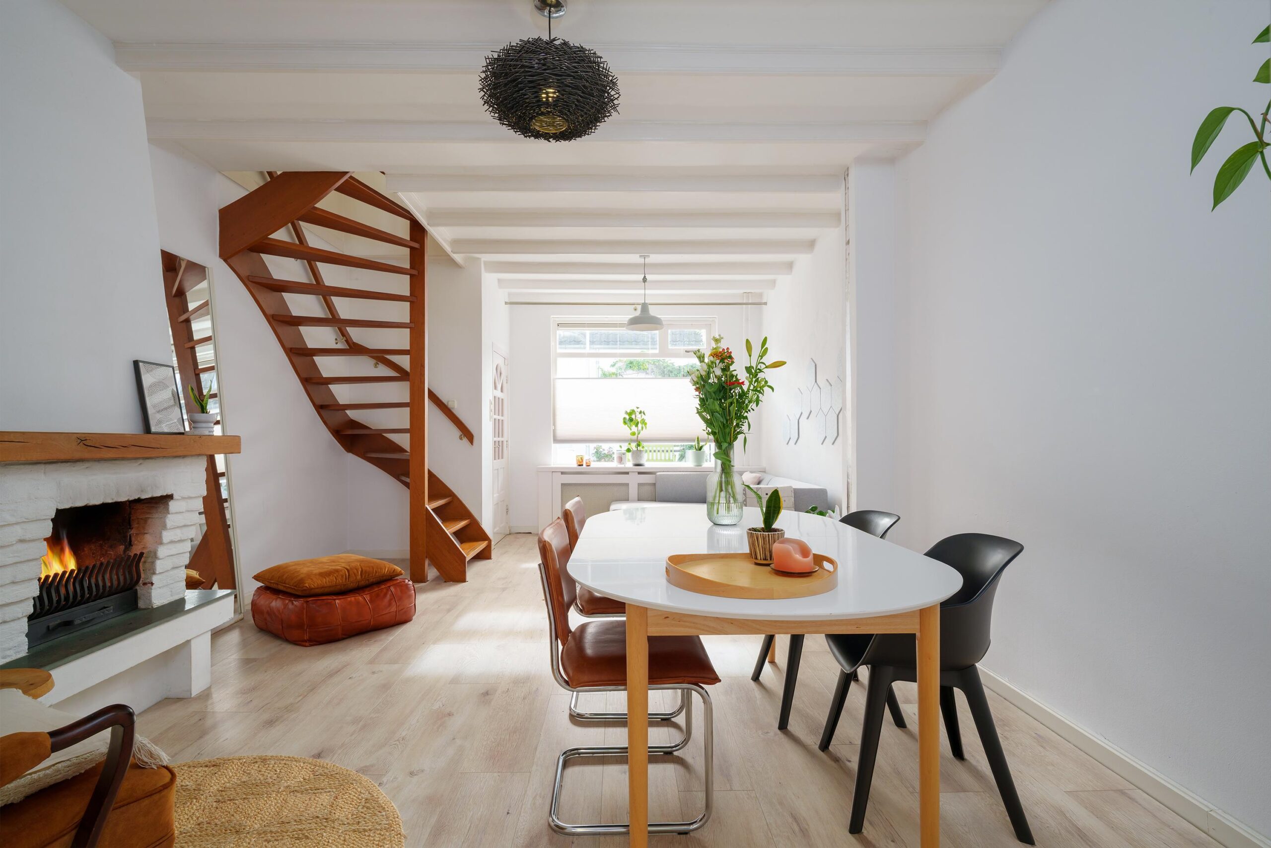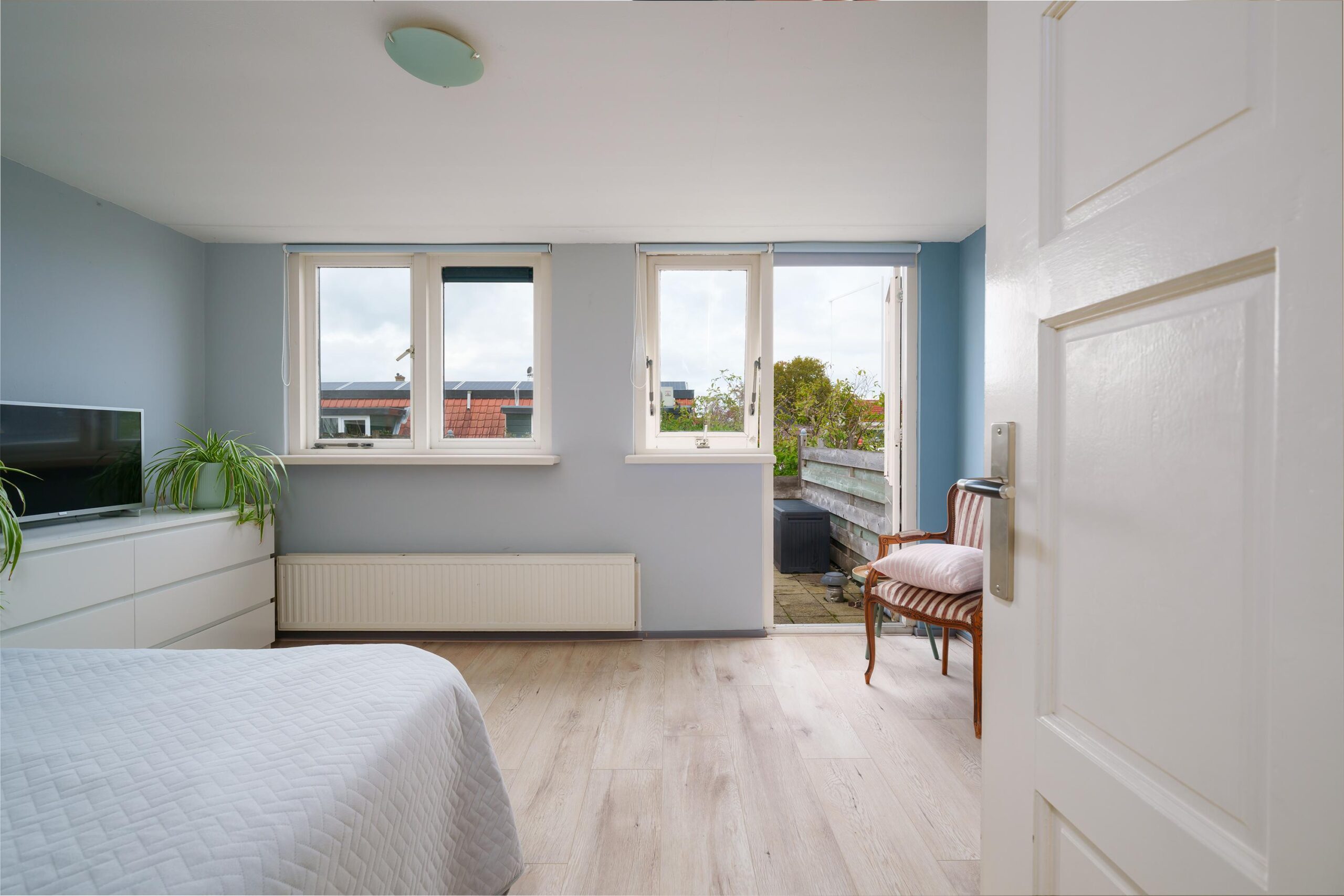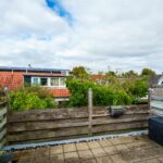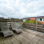 Eerste verdieping Via de open trap kom je op de slaapverdieping met drie slaapkamers van verschillende afmetingen: ideaal als hoofdslaapkamer, logeer-/kinderkamer en een extra (thuis)werkplek. De grootste slaapkamer heeft directe toegang tot het dakterras—een zonnige bonus. Vliering bereikbaar vanaf de overloop voor extra bergruimte. Buitenruimte Achtertuin (van ca. 20 m²) met achterom en houten berging; dakterras aan de hoofdslaapkamer. Zo heb je altijd een plek in de schaduw óf zon.