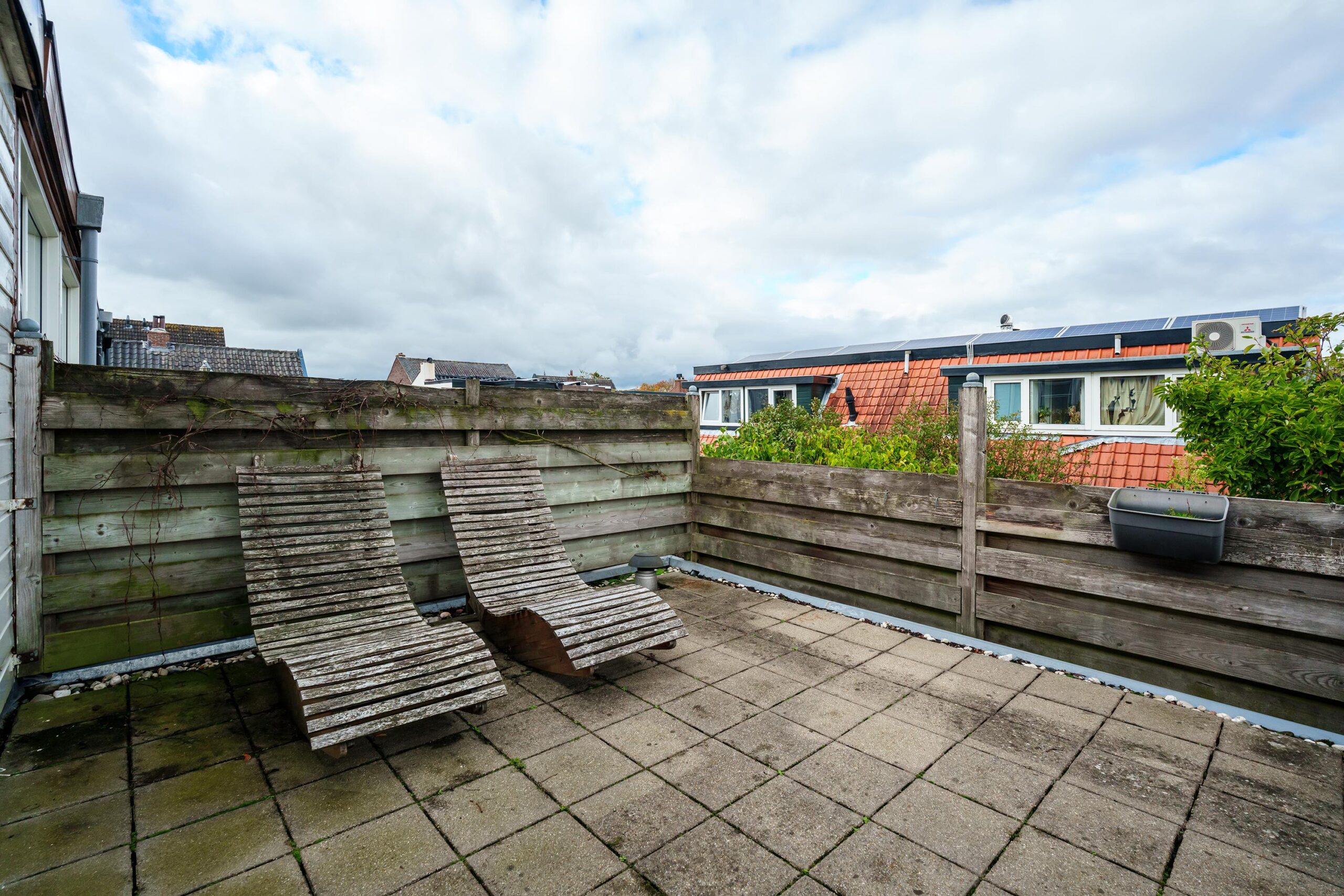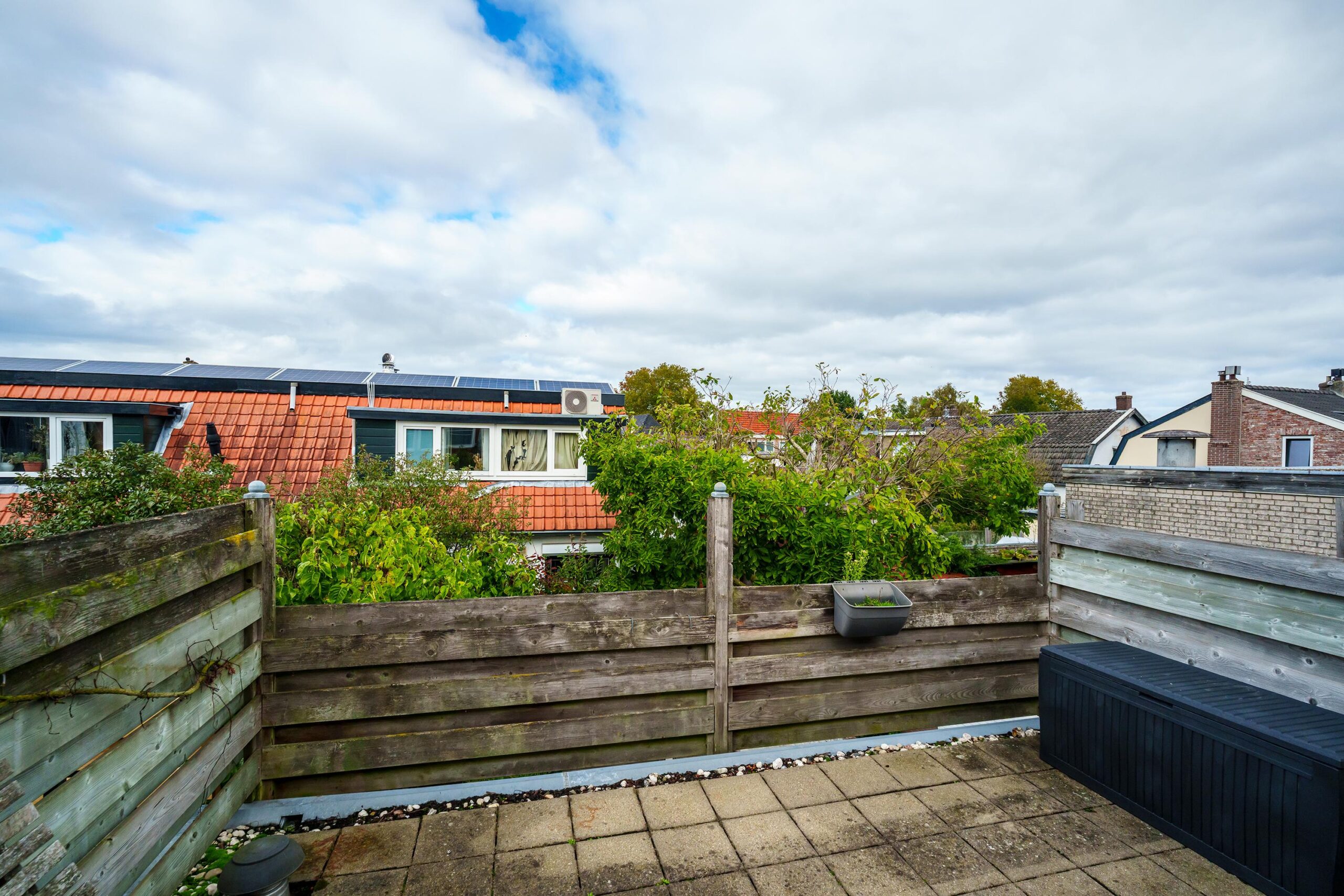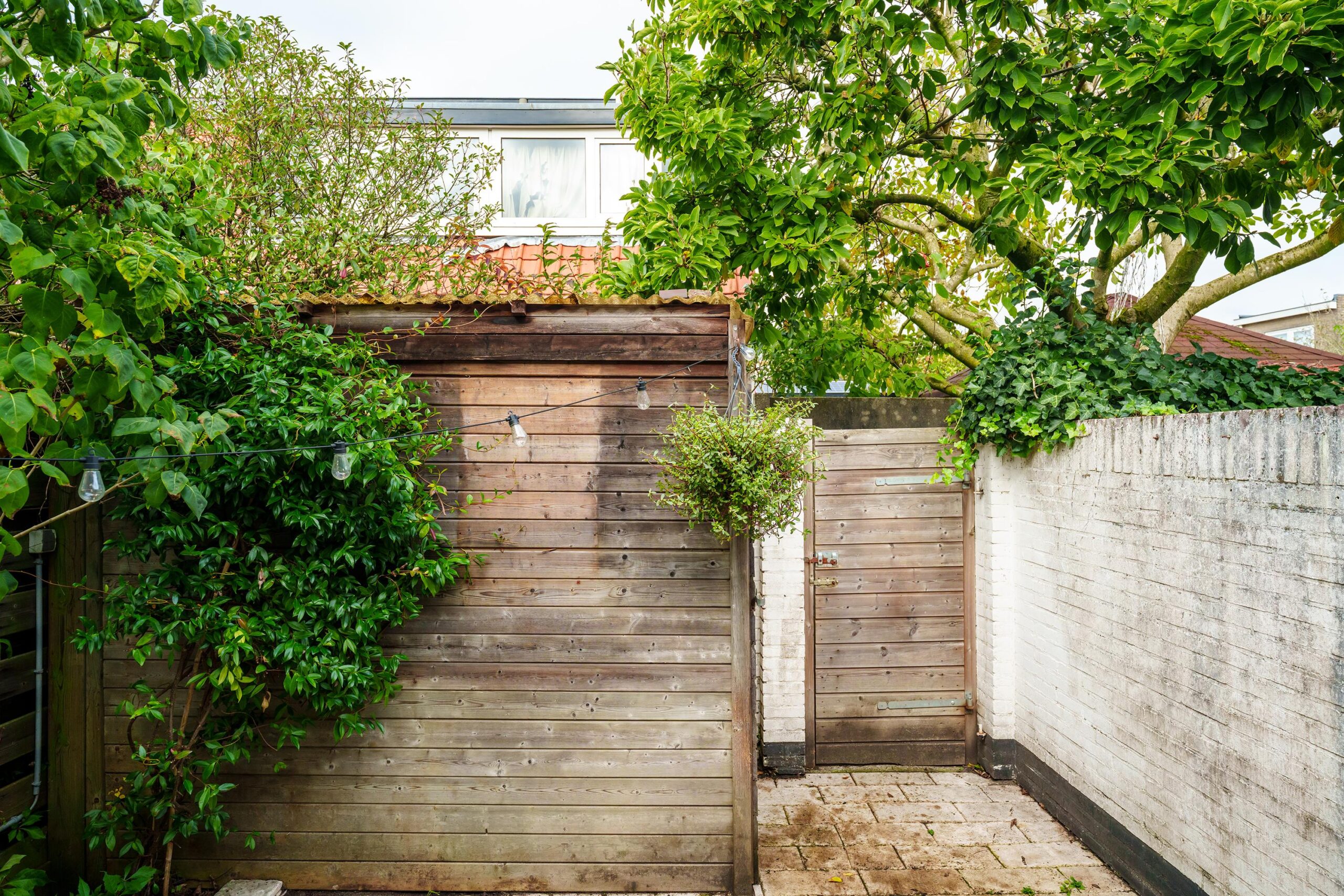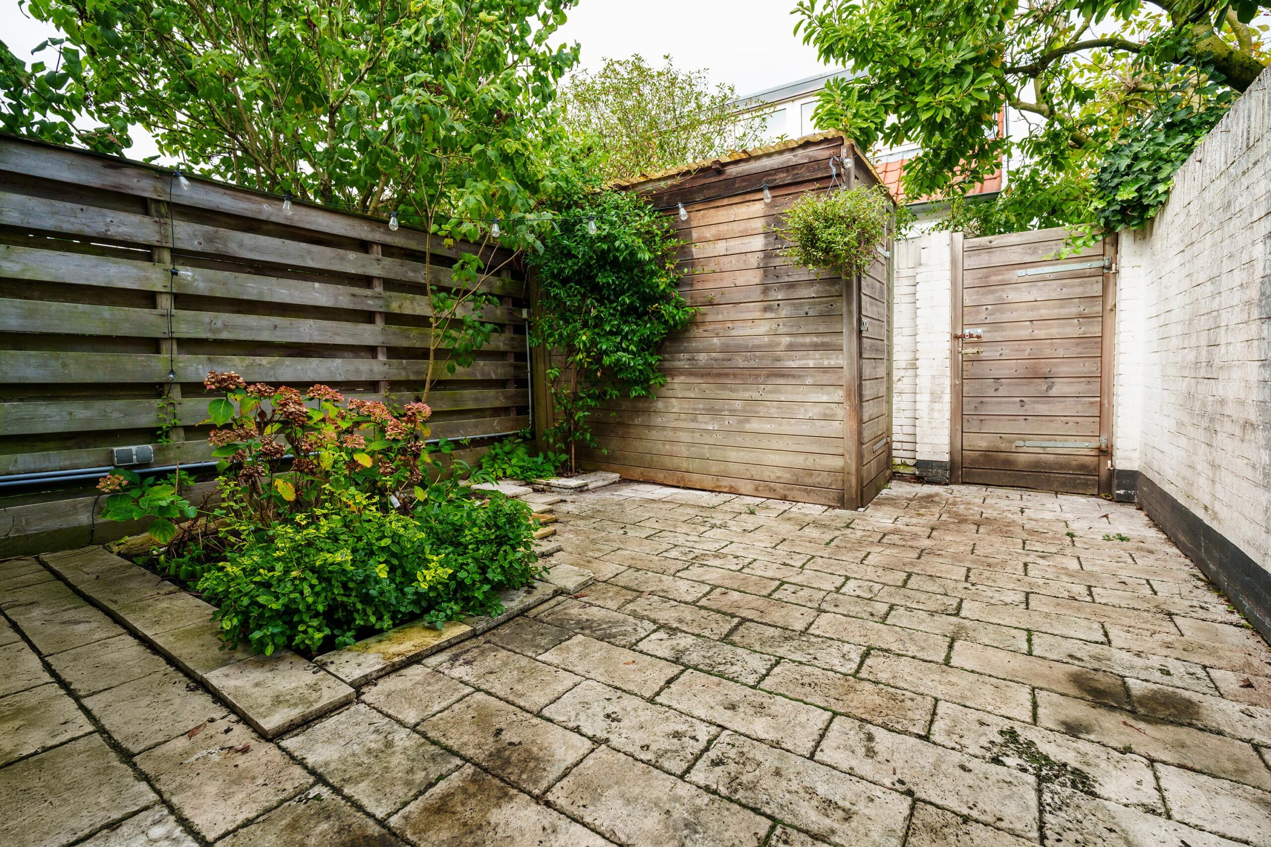 Achter tuin van (ca. 20 m²) met achterom en houten berging; dakterras aan de hoofdslaapkamer. Zo heb je altijd een plek in de schaduw óf zon.