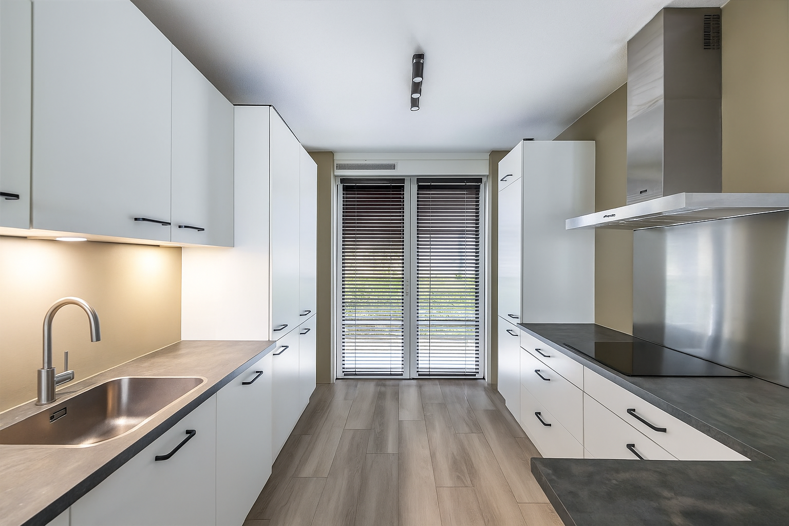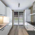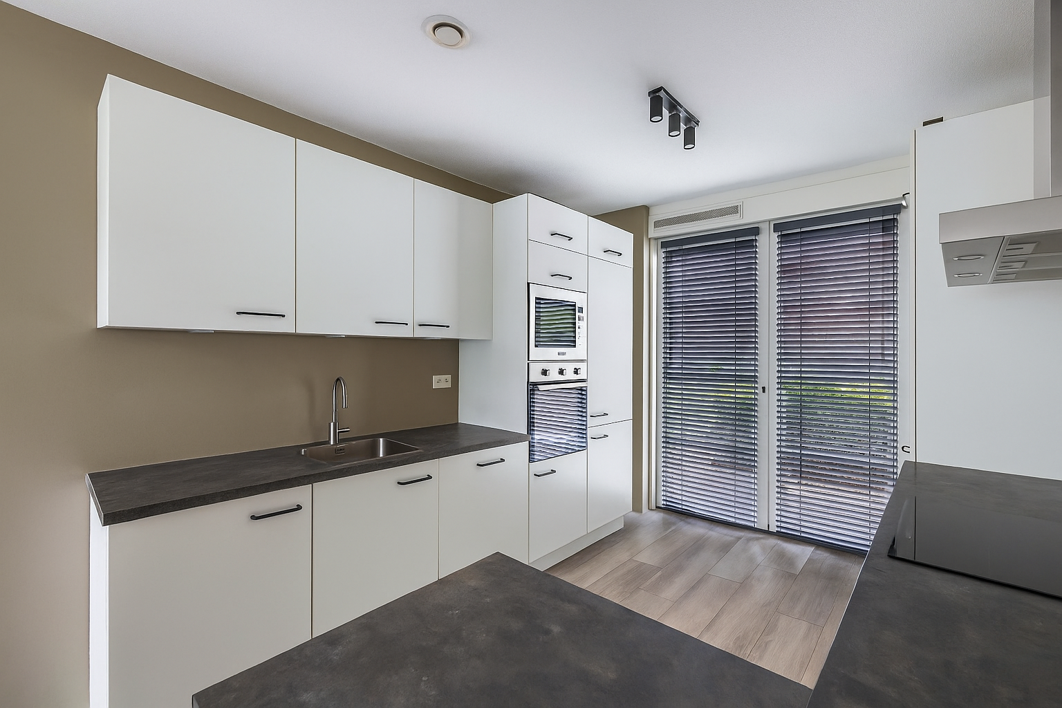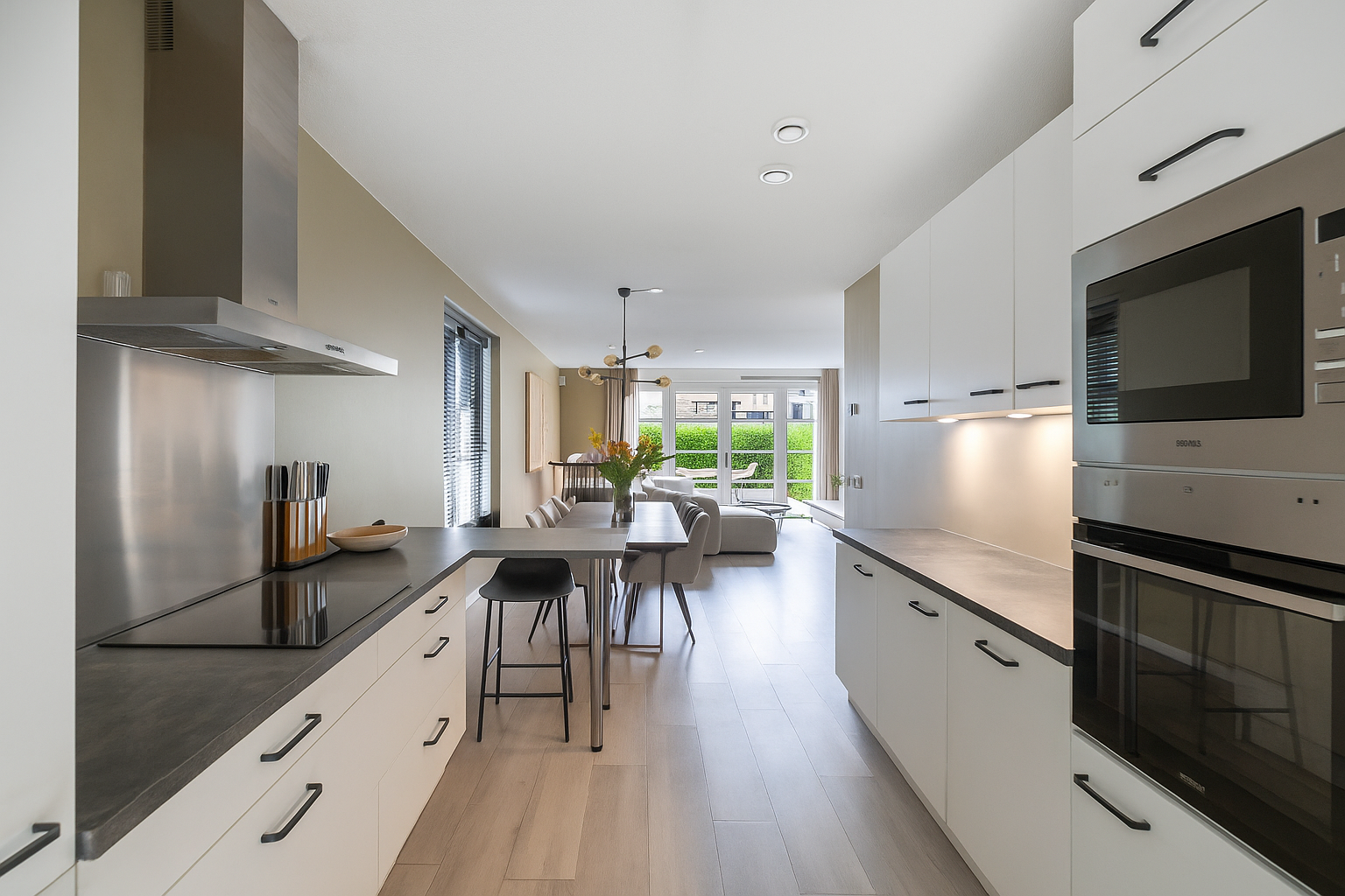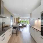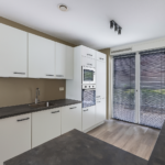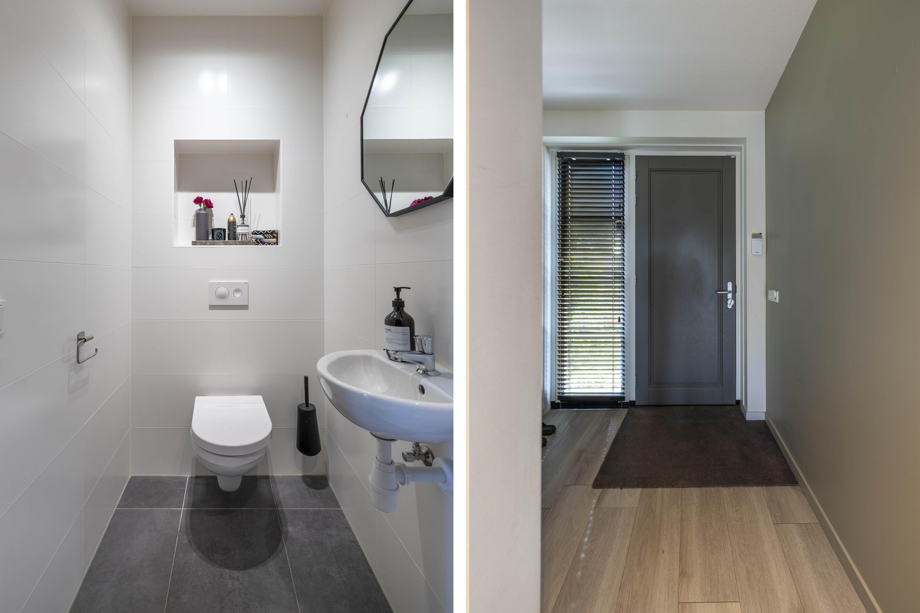 Entree, hal, meterkast, kast met opstelling van de warmtepomp en garderobe, modern vrij hangend toilet met fontein. De nette keuken bevindt zich aan de voorzijde van de woning en beschikt over diverse inbouwapparatuur waaronder een inductiekookplaat, oven, magnetron, vaatwasser en koel- vriescombinatie.