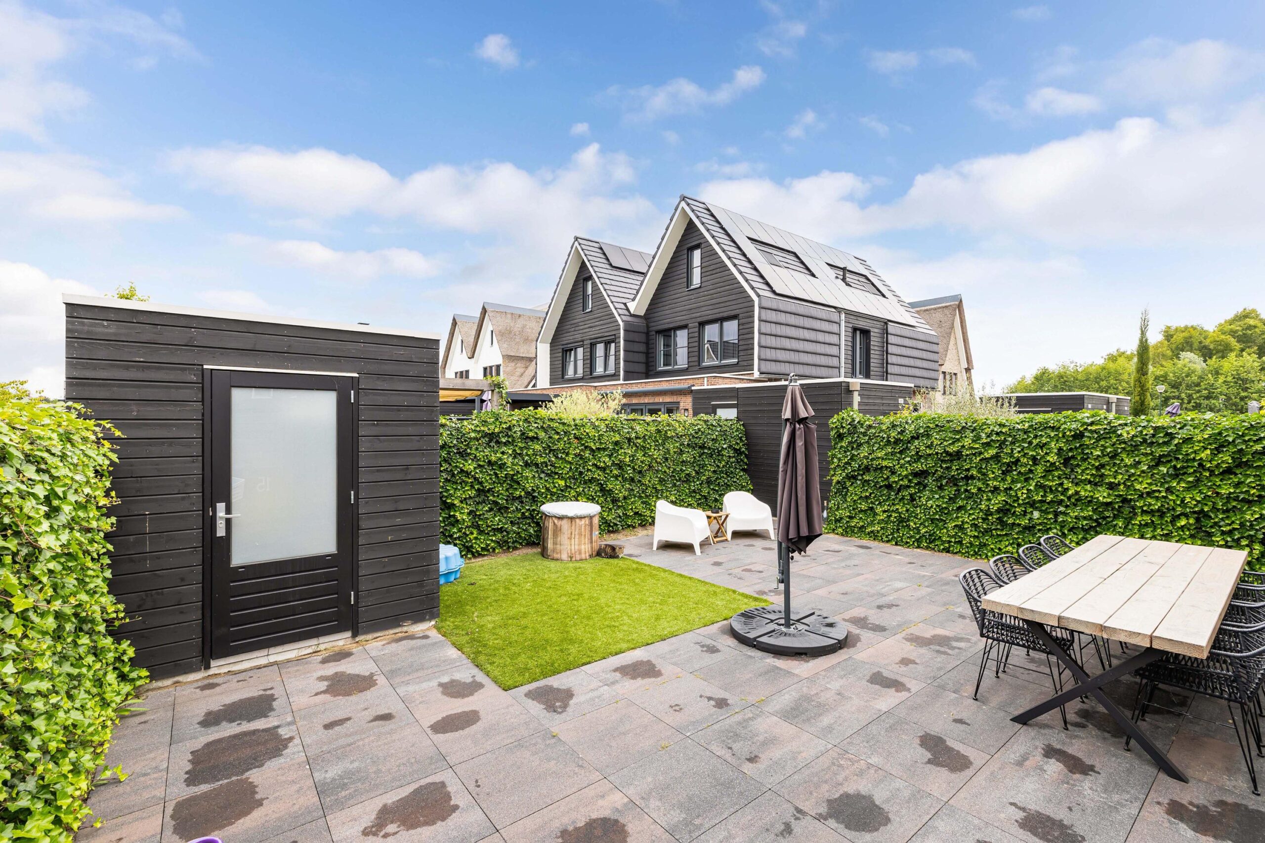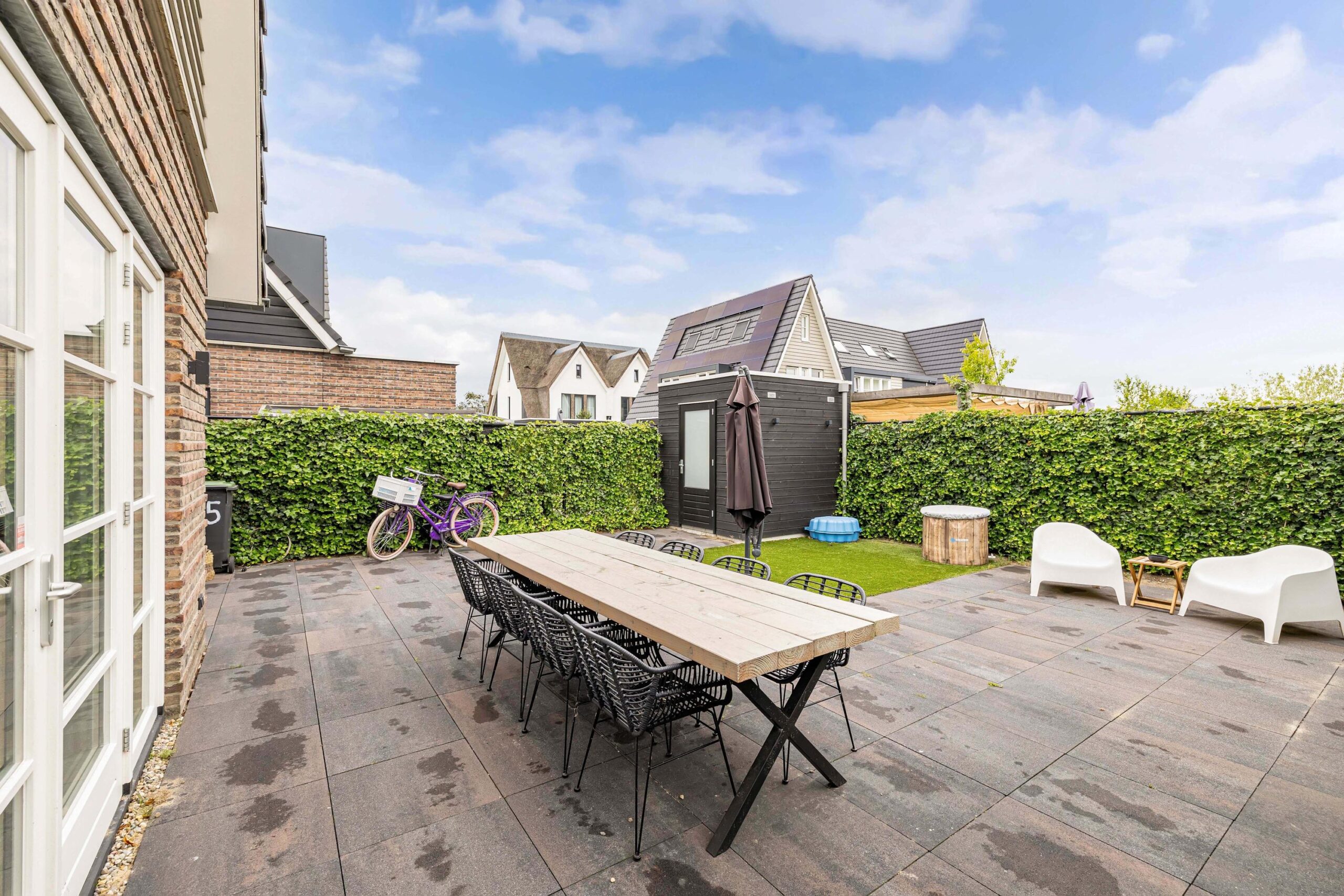 De tuin is fraai aangelegd en op de middag en avond zon gelegen, beschikt over heerlijk terras, ruime vrijstaande berging met elektra! Aan de zijkant kunt u 2 auto's kwijt.