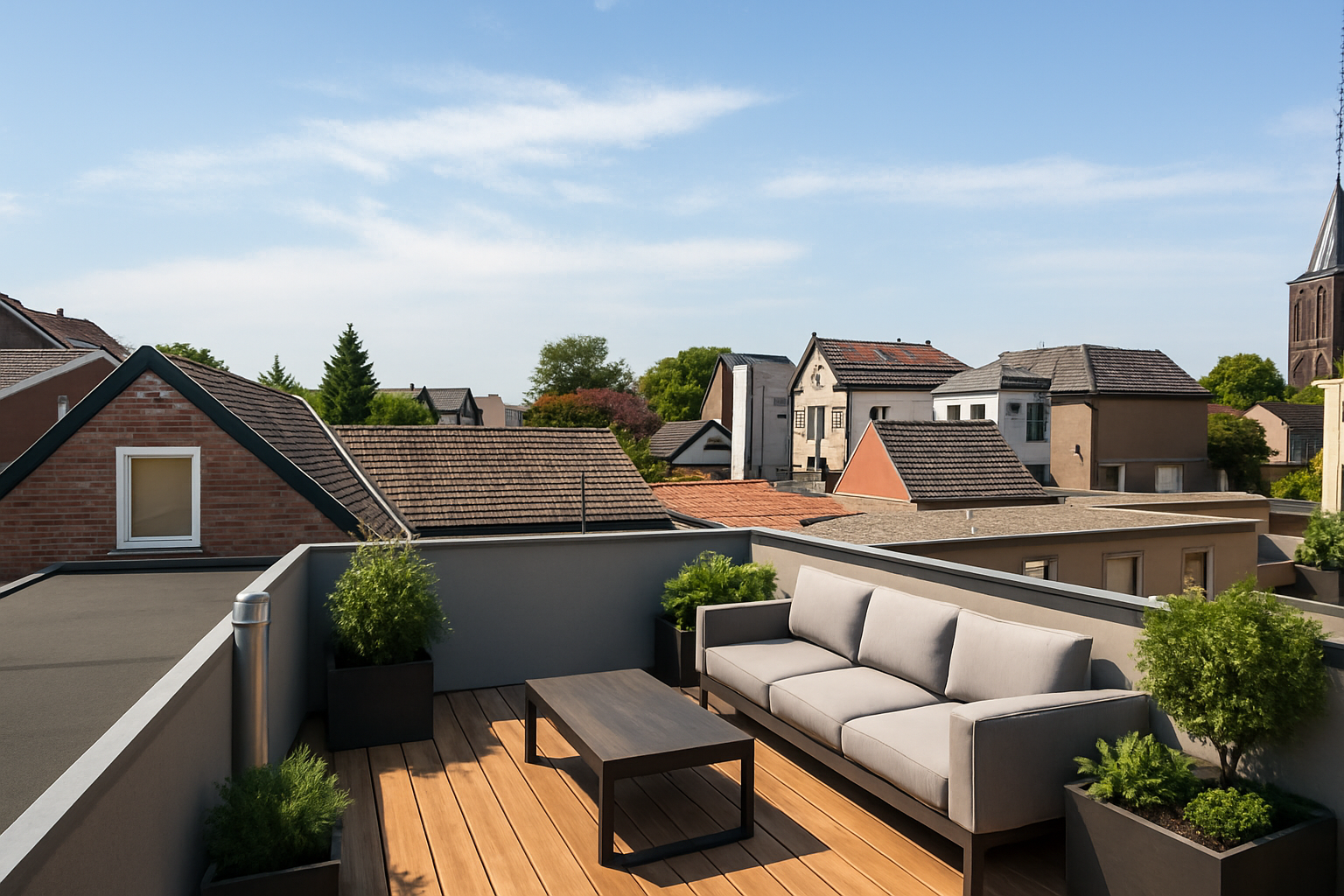 Overloop, 3 in grootte variërende slaapkamers. De grootste slaapkamer beschikt over een vaste kast, een wastafel en biedt toegang tot het dakterras.