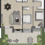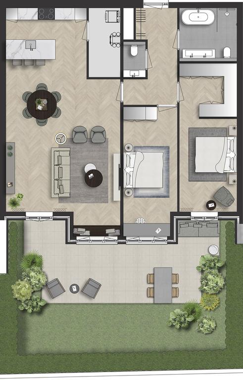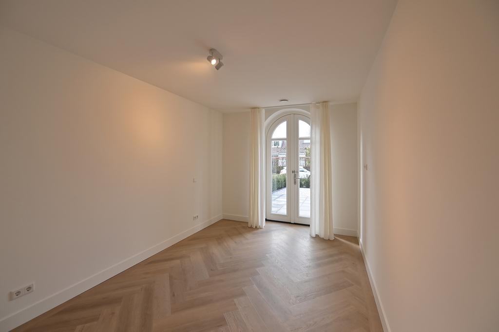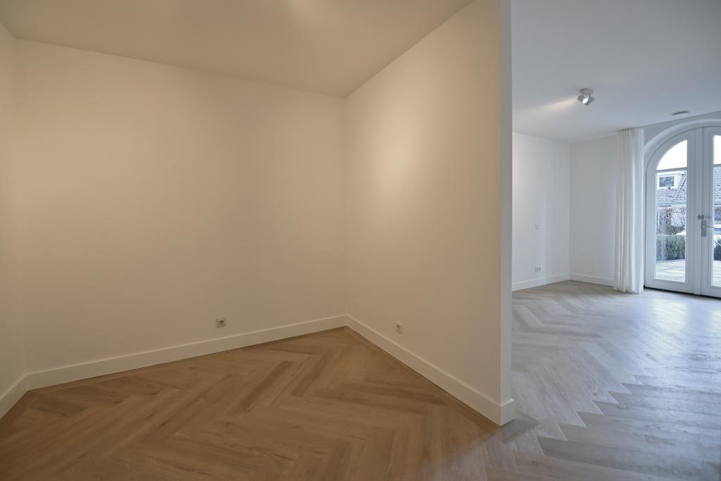 Entree, hal met garderobe en toilet. Fraaie lichte woonkamer met open keuken en openslaande naar het terras. Royale eerste slaapkamer met ruimte om een walk-in-closet te realiseren. Openslaande deuren bieden hier toegang tot de tuin. Tweede, ruime slaapkamer. Luxueuze badkamer voorzien van dubbel wastafelmeubel, grote inloopdouche, toilet en de opstelling voor de wasmachine en droger.