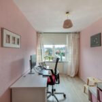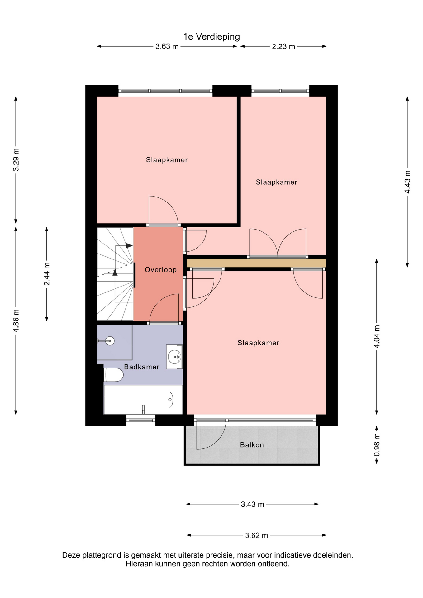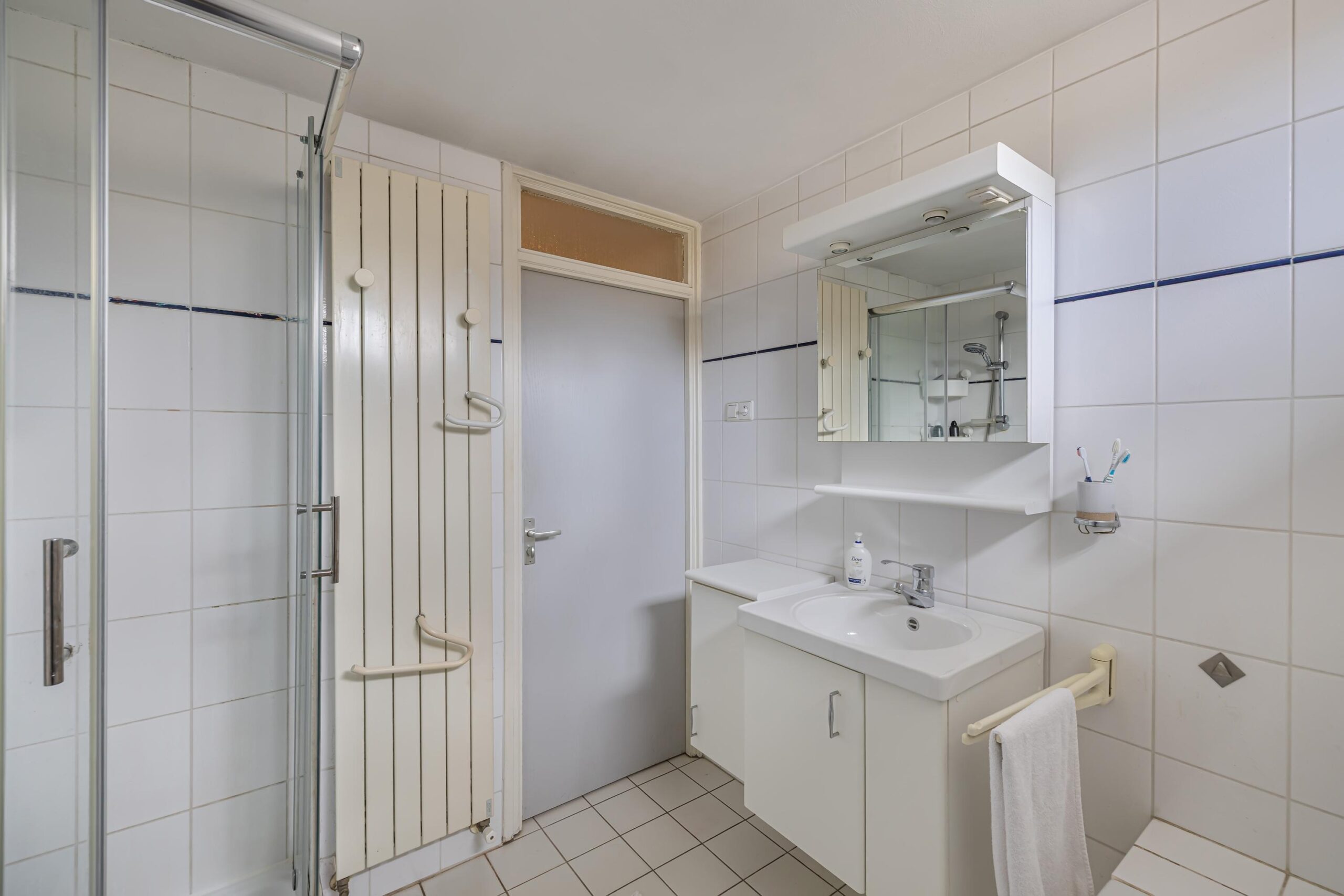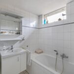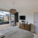 Overloop, aan de achterzijde van de woning zijn twee slaapkamers, de derde slaapkamer is aan de voorzijde en voorzien van een balkon op het westen. De badkamer beschikt over een douche, ligbad, wastafelmeubel, toilet en radiator.