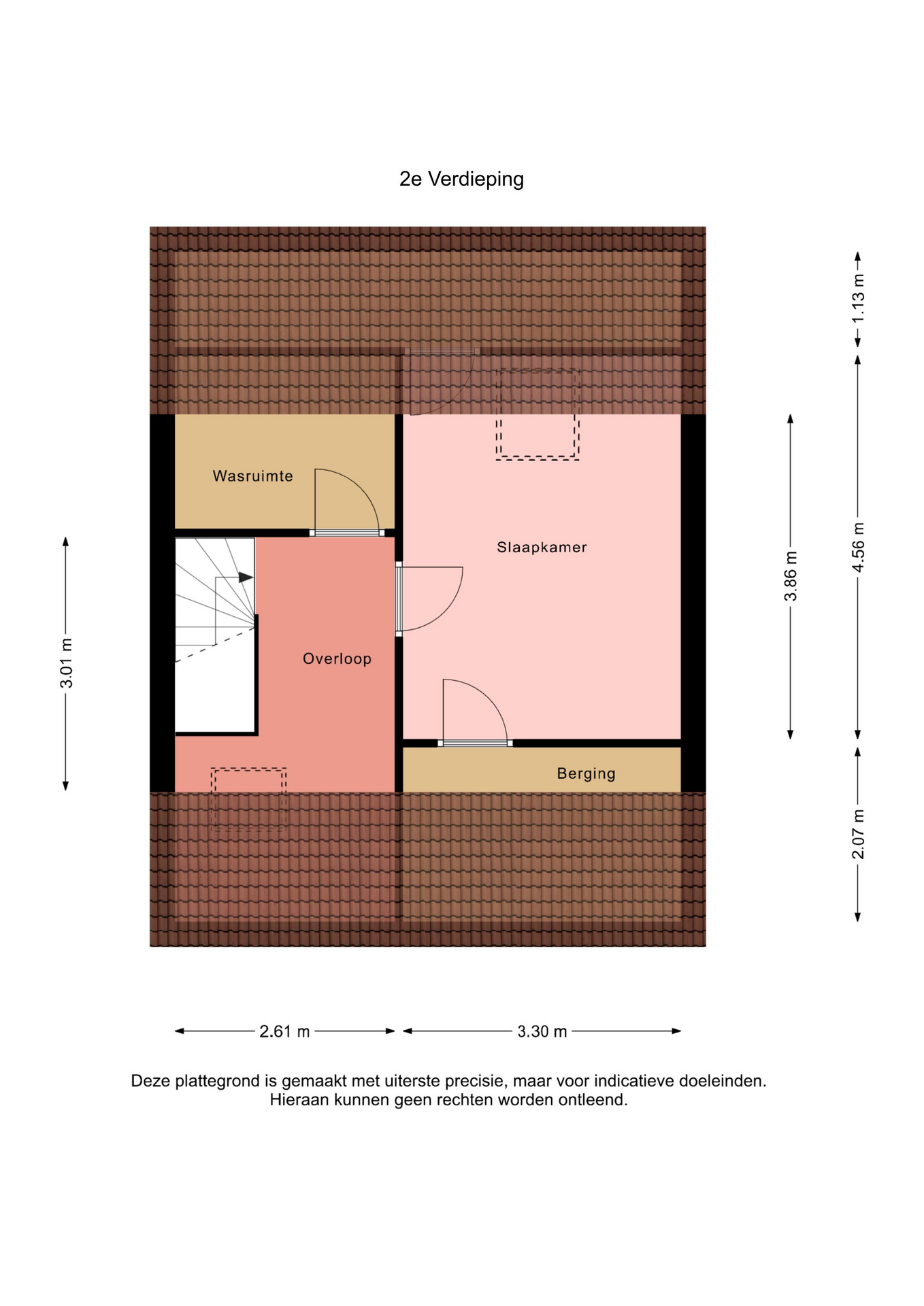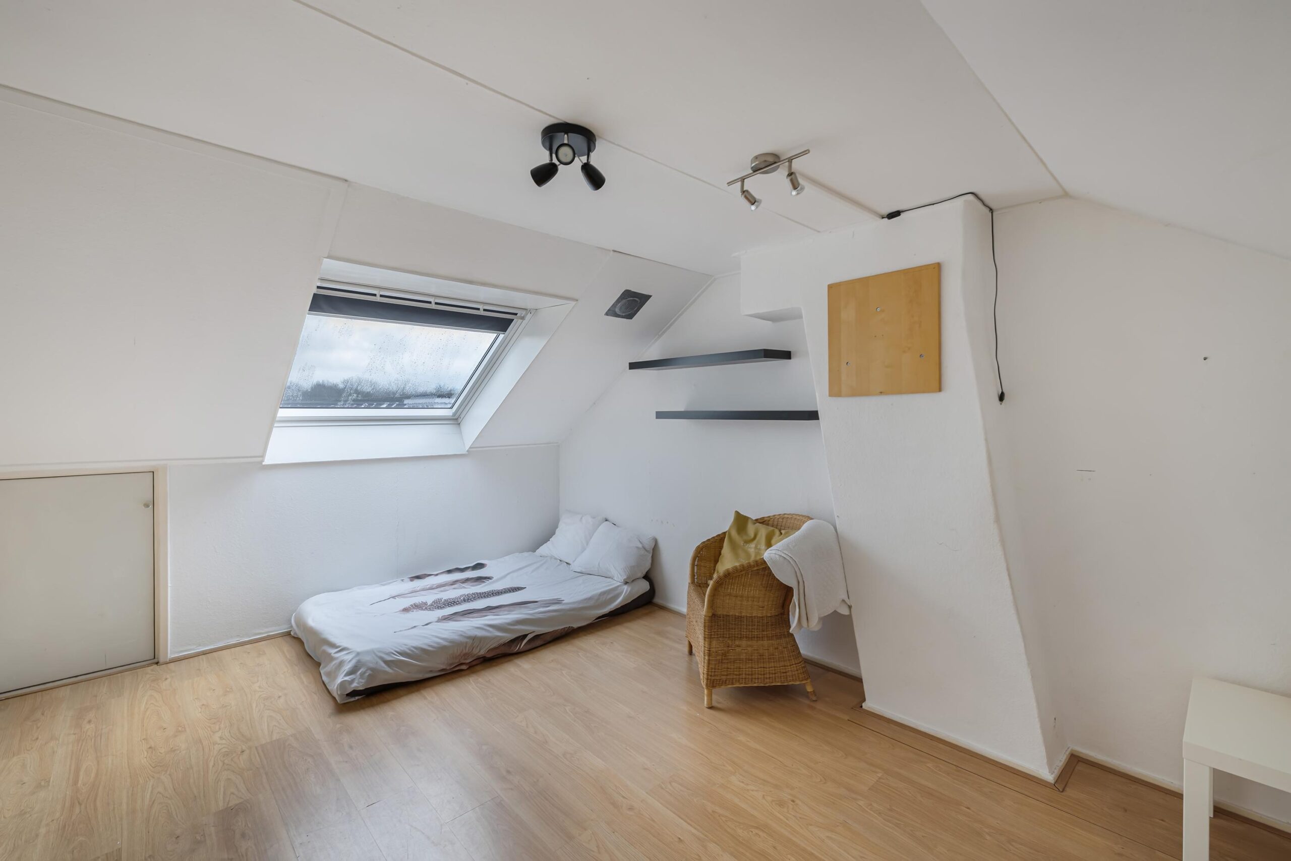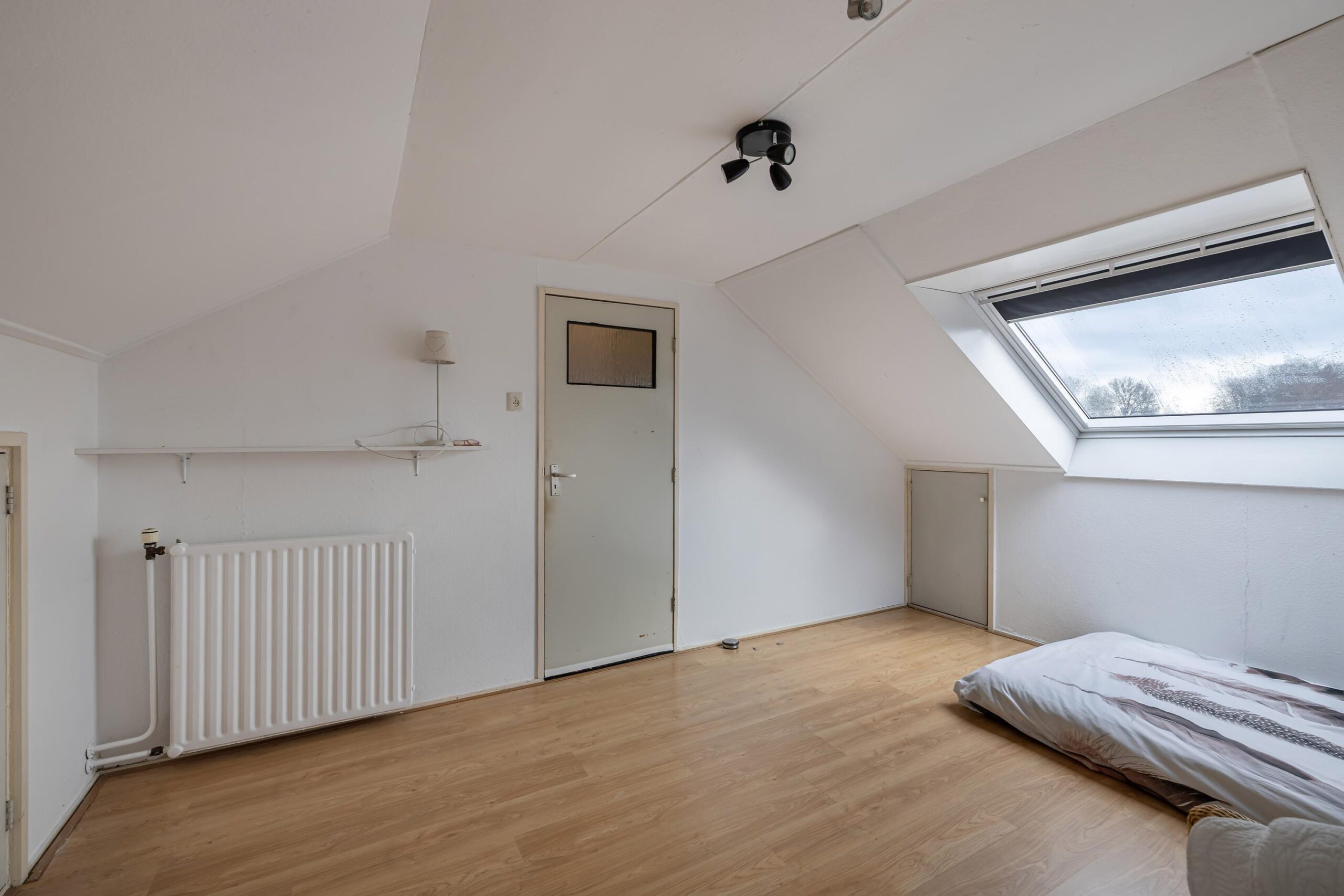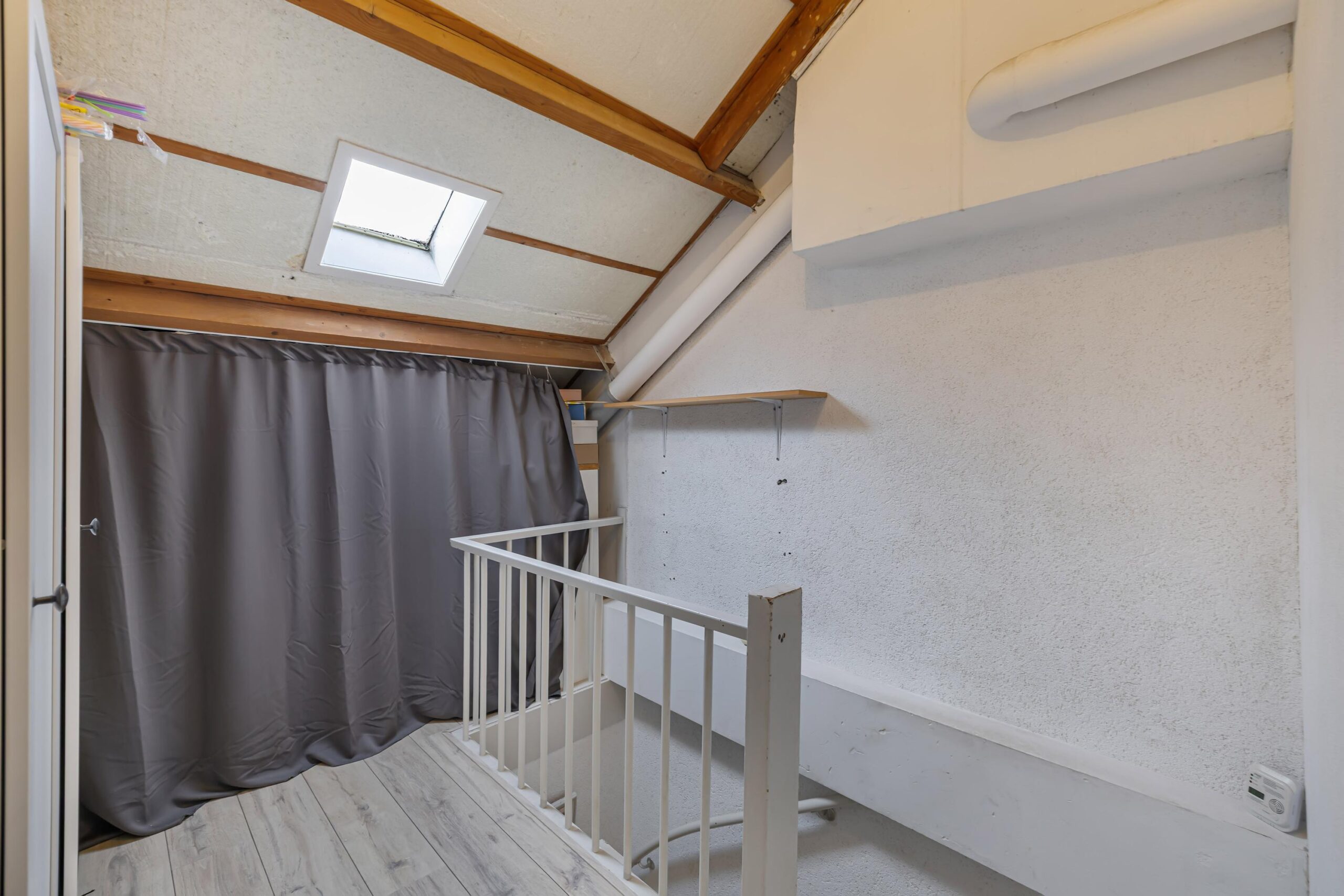 Overloop met dakraam, een bergruimte met cv- en wasmachineopstelling, de vierde slaapkamer met dakraam en veel bergruimte.