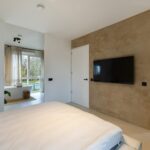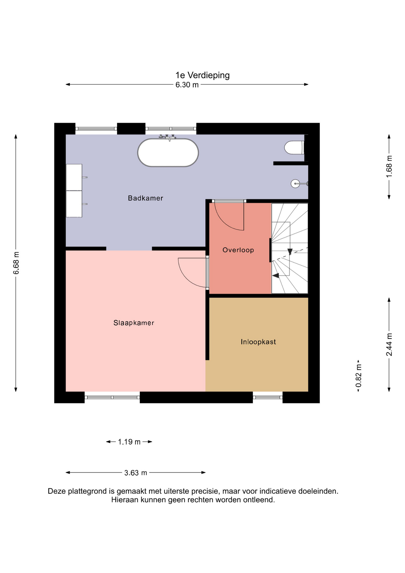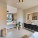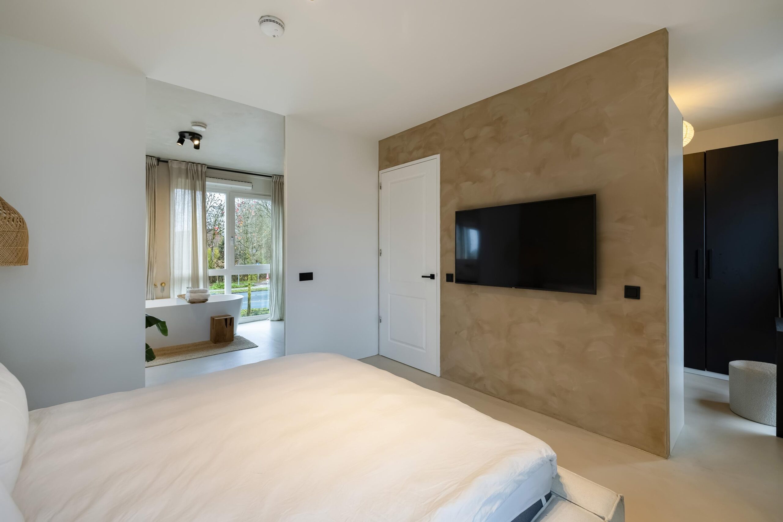 Overloop, 1 grote ruime slaapkamer met inloopkast en een verrassend grote moderne badkamer voorzien van vloerverwarming, een fraai ligbad, een inloopdouche, dubbele wastafel en een vrijhangend toilet.