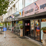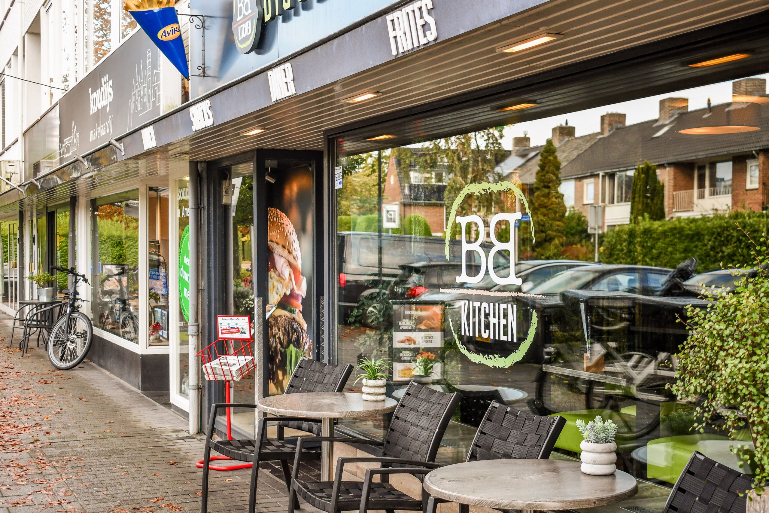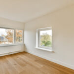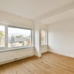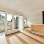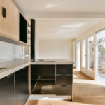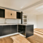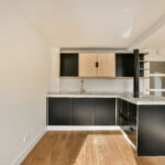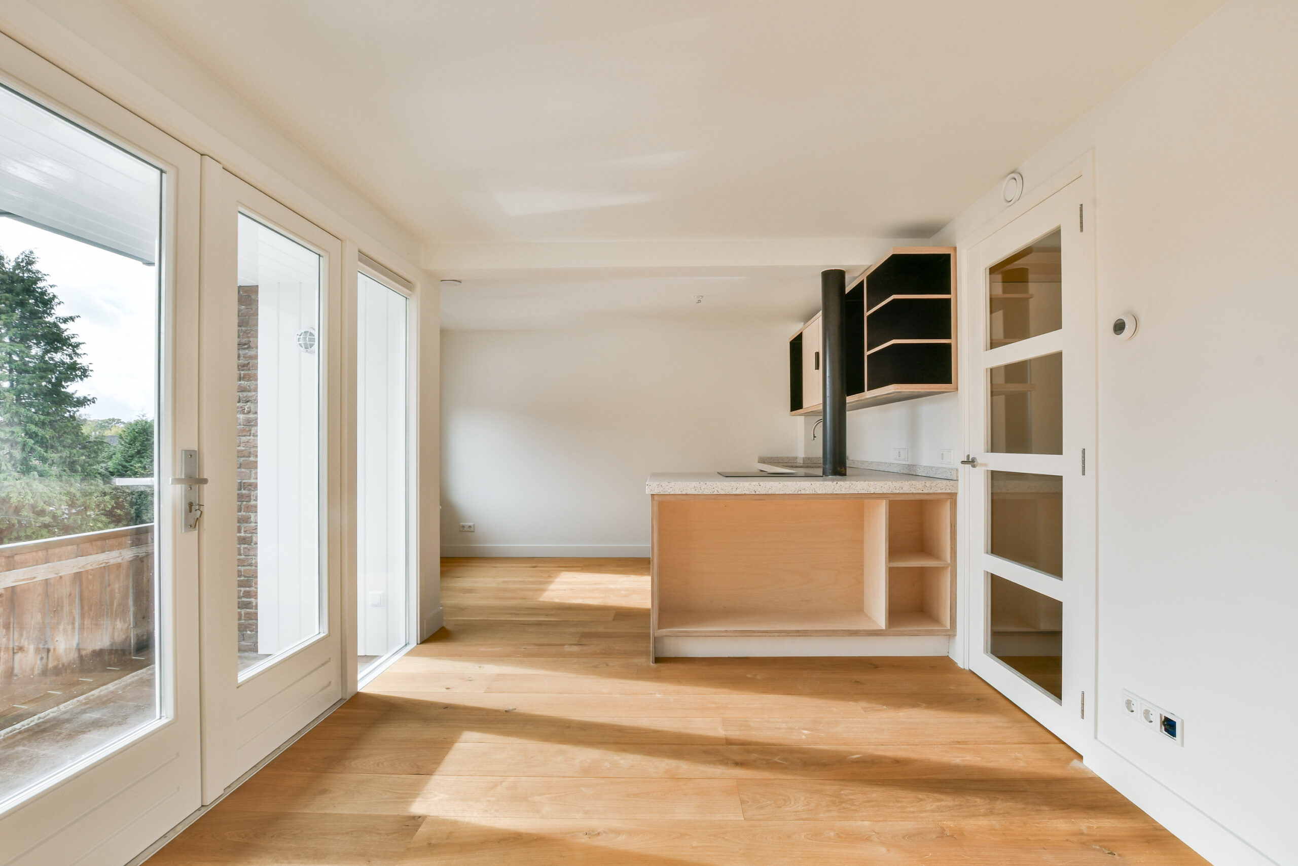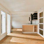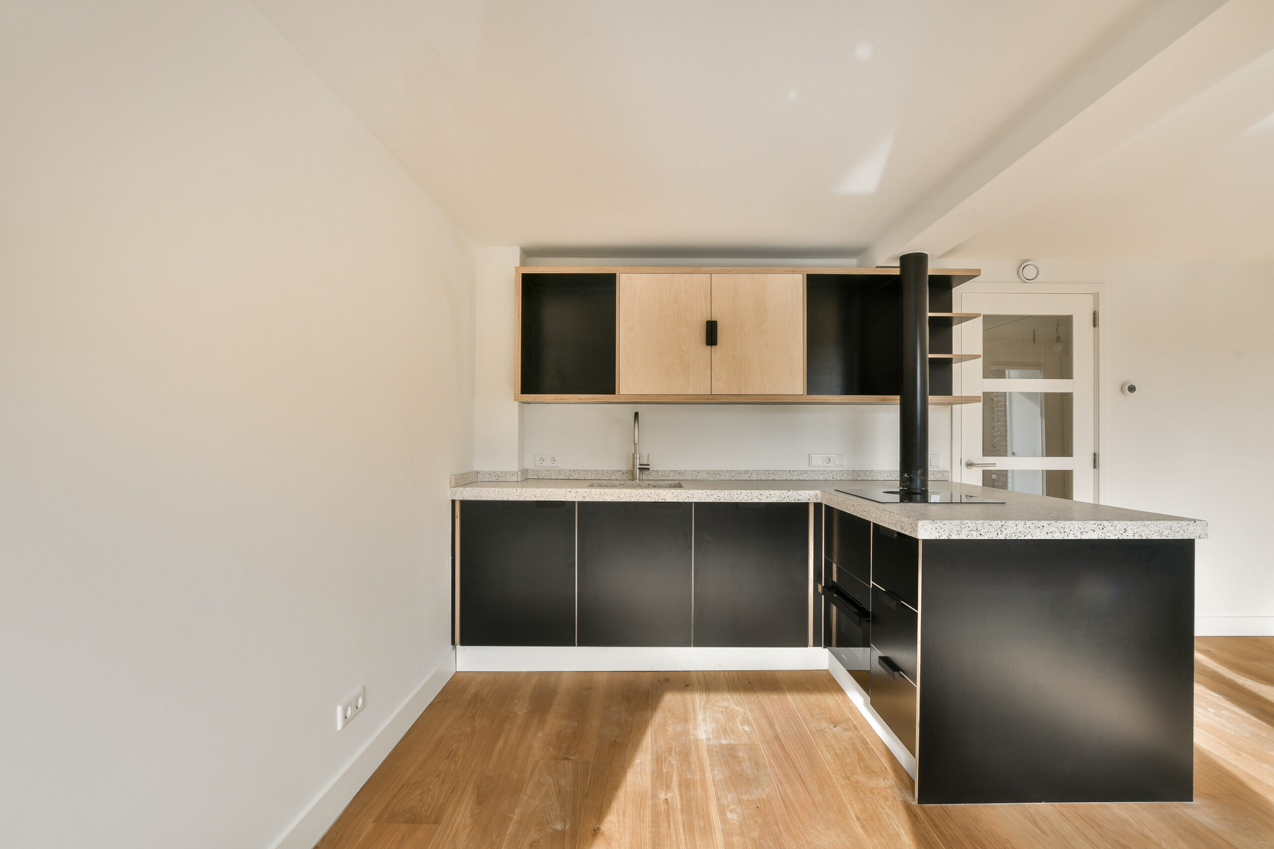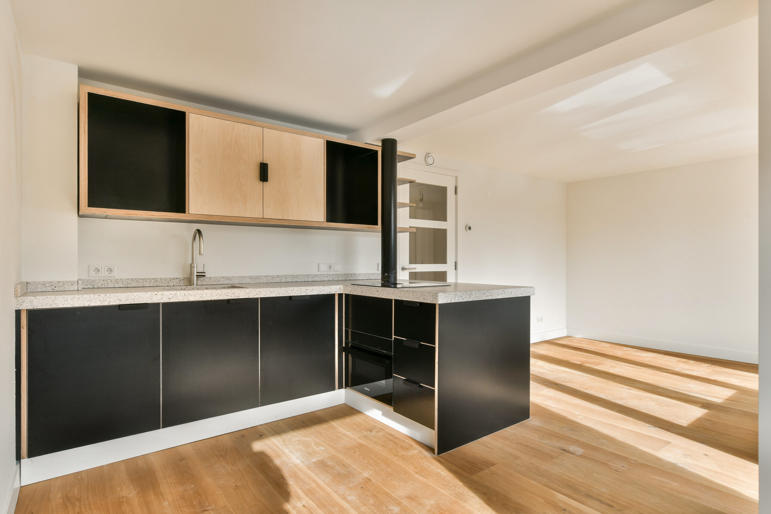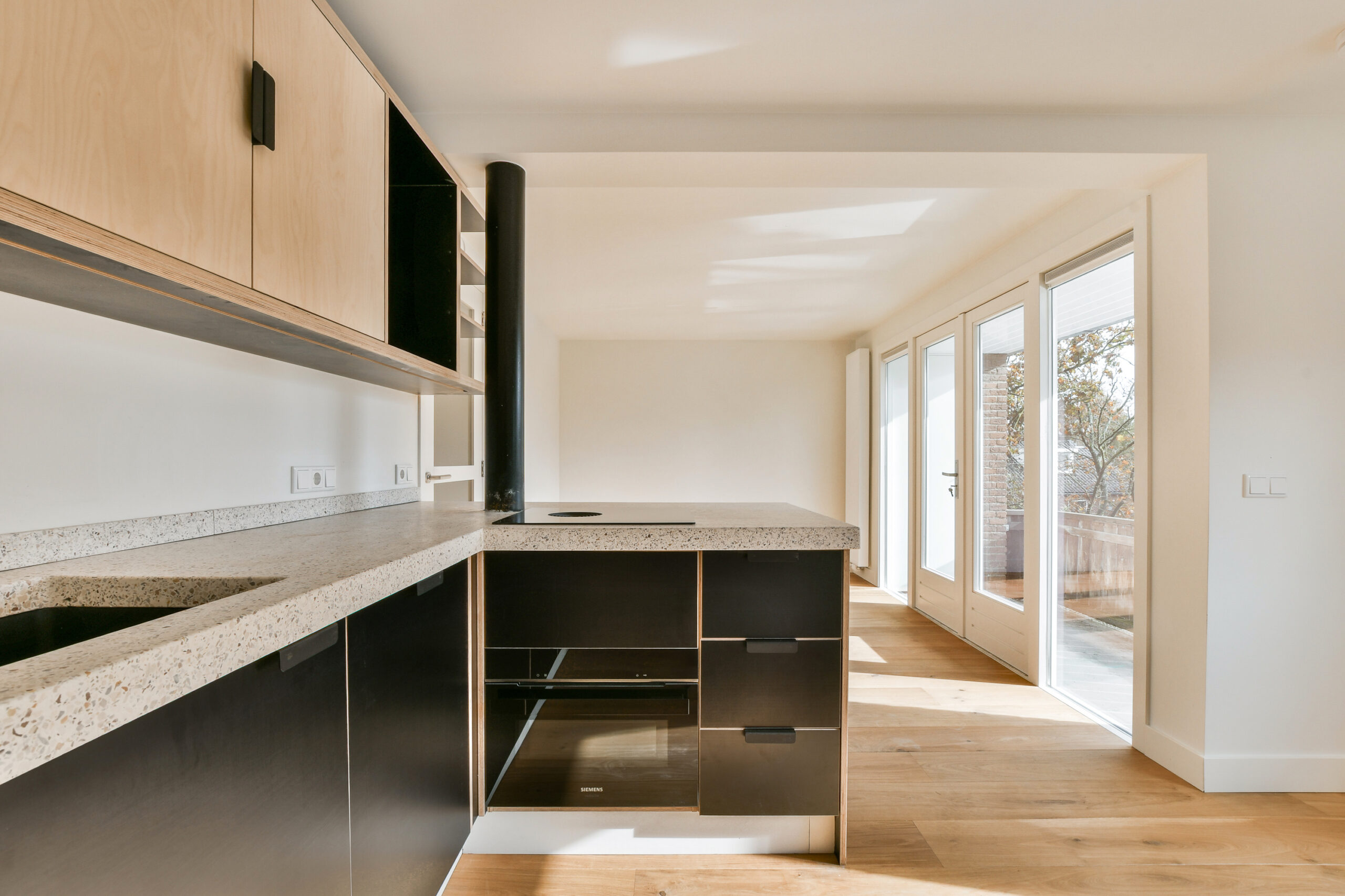 De lichte woonkamer heeft grote raampartijen en openslaande deuren naar het balkon. De moderne open keuken is uitgevoerd met een terrazzo granieten aanrechtblad en voorzien van hoogwaardige apparatuur waaronder een Bora inductiekookplaat met geïntegreerde afzuiging, een Quooker, oven en vaatwasser. De combinatie van licht hout, zwarte fronten en terrazzo zorgt voor een moderne en warme uitstraling.
