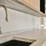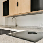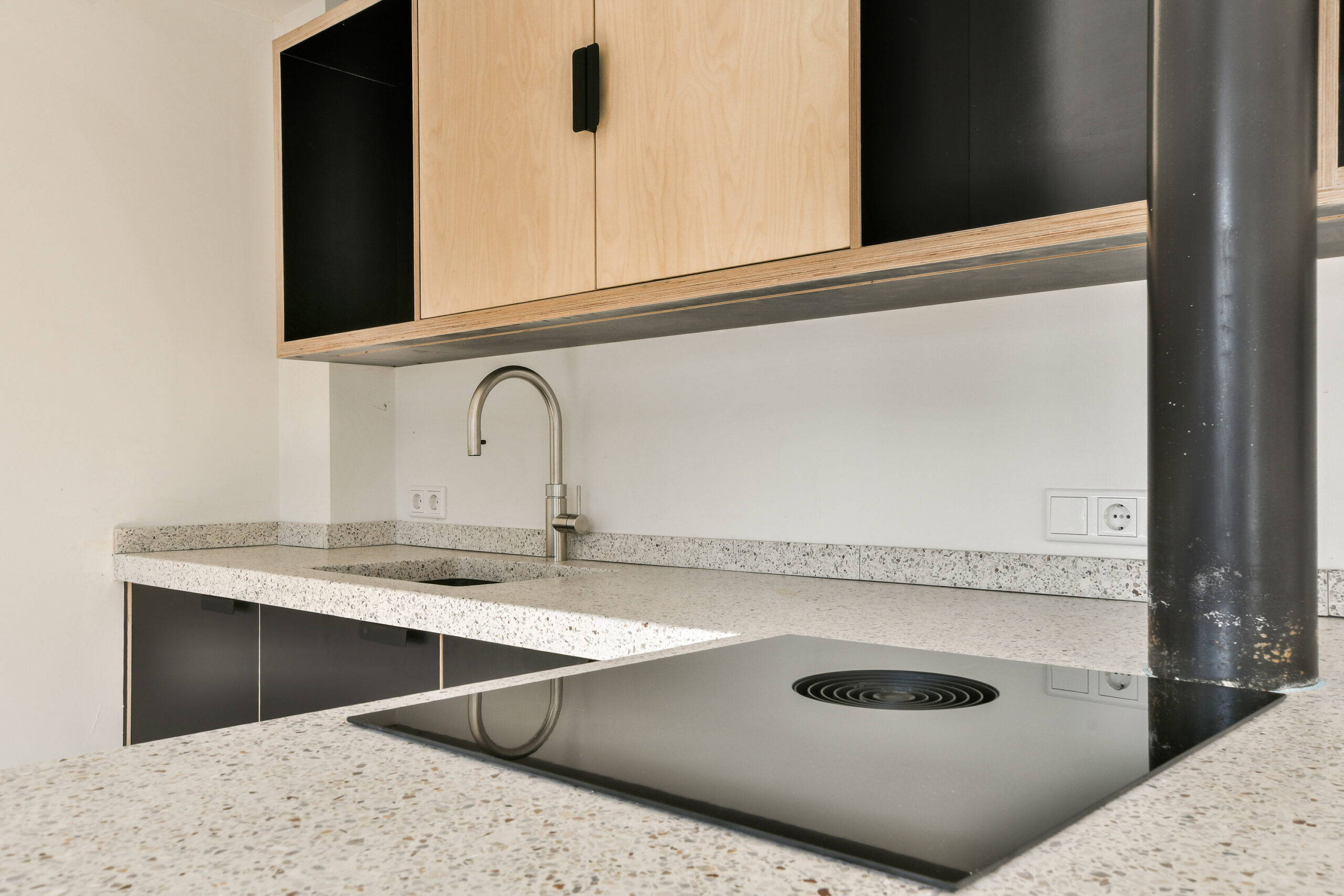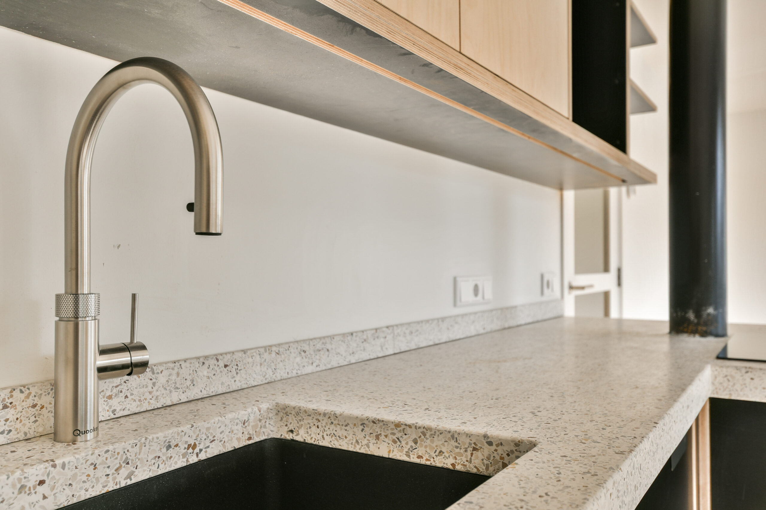 • Granieten terrazzo keukenblad met Quooker en Bora kookplaat