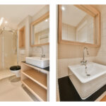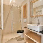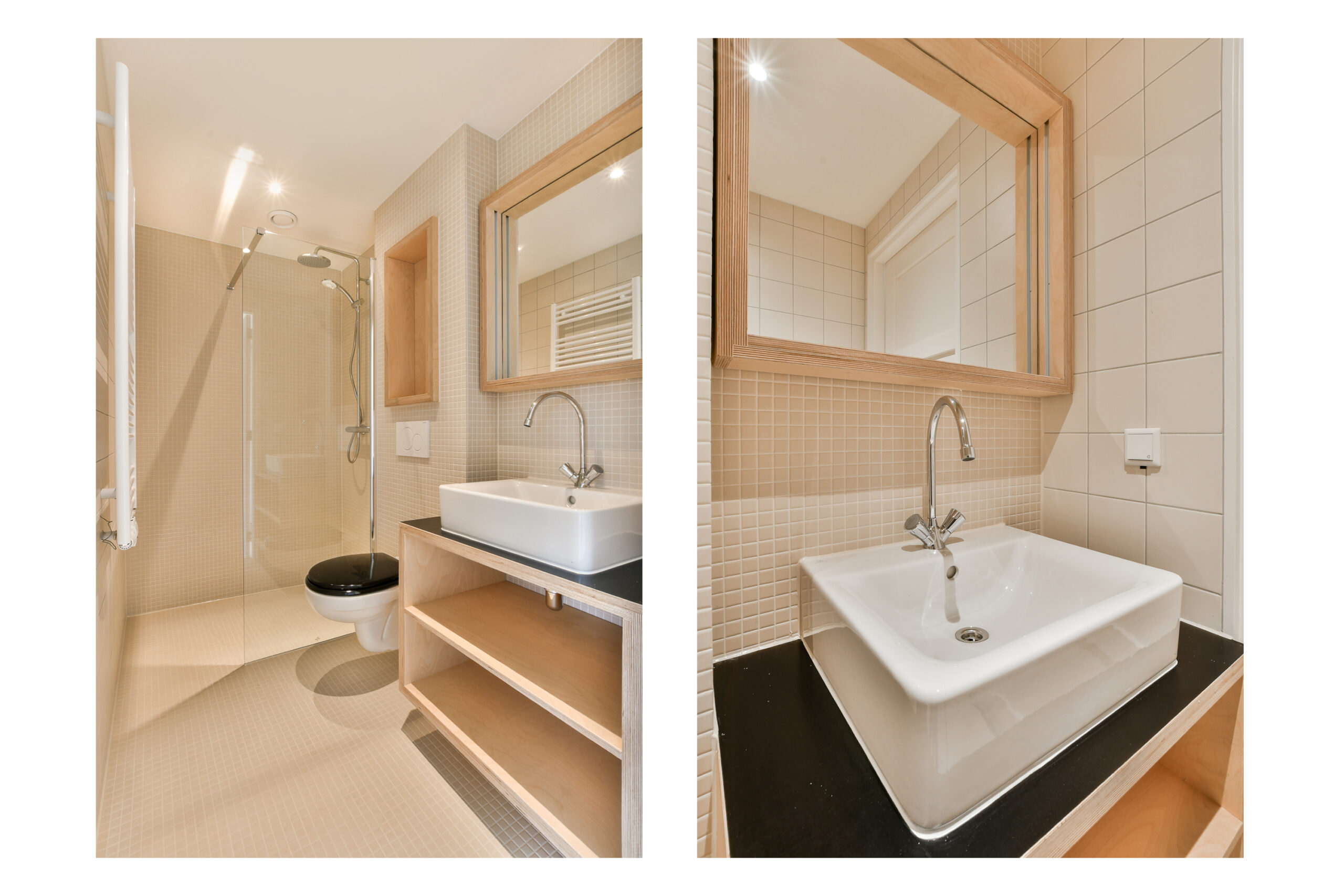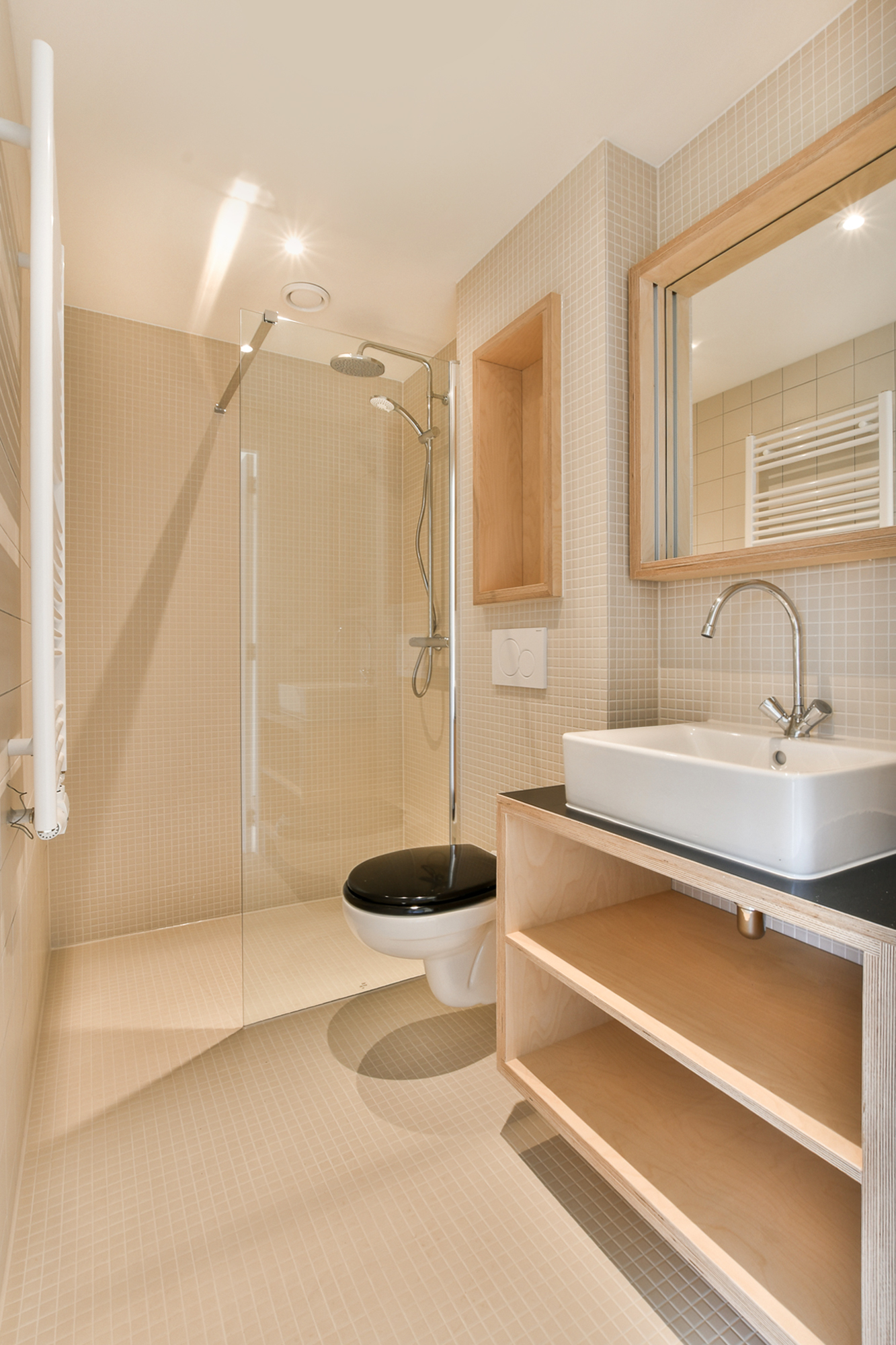 De badkamer is stijlvol en praktisch ingericht met een inloopdouche, wastafelmeubel en toilet. De afwerking in lichte tinten met houtaccenten zorgt voor een rustige en verzorgde sfeer.