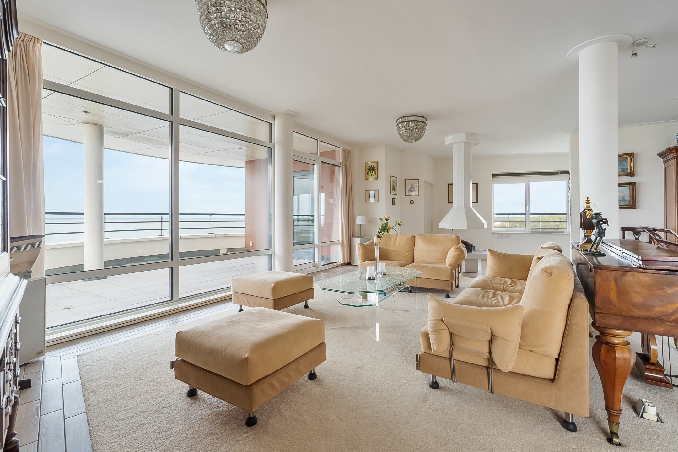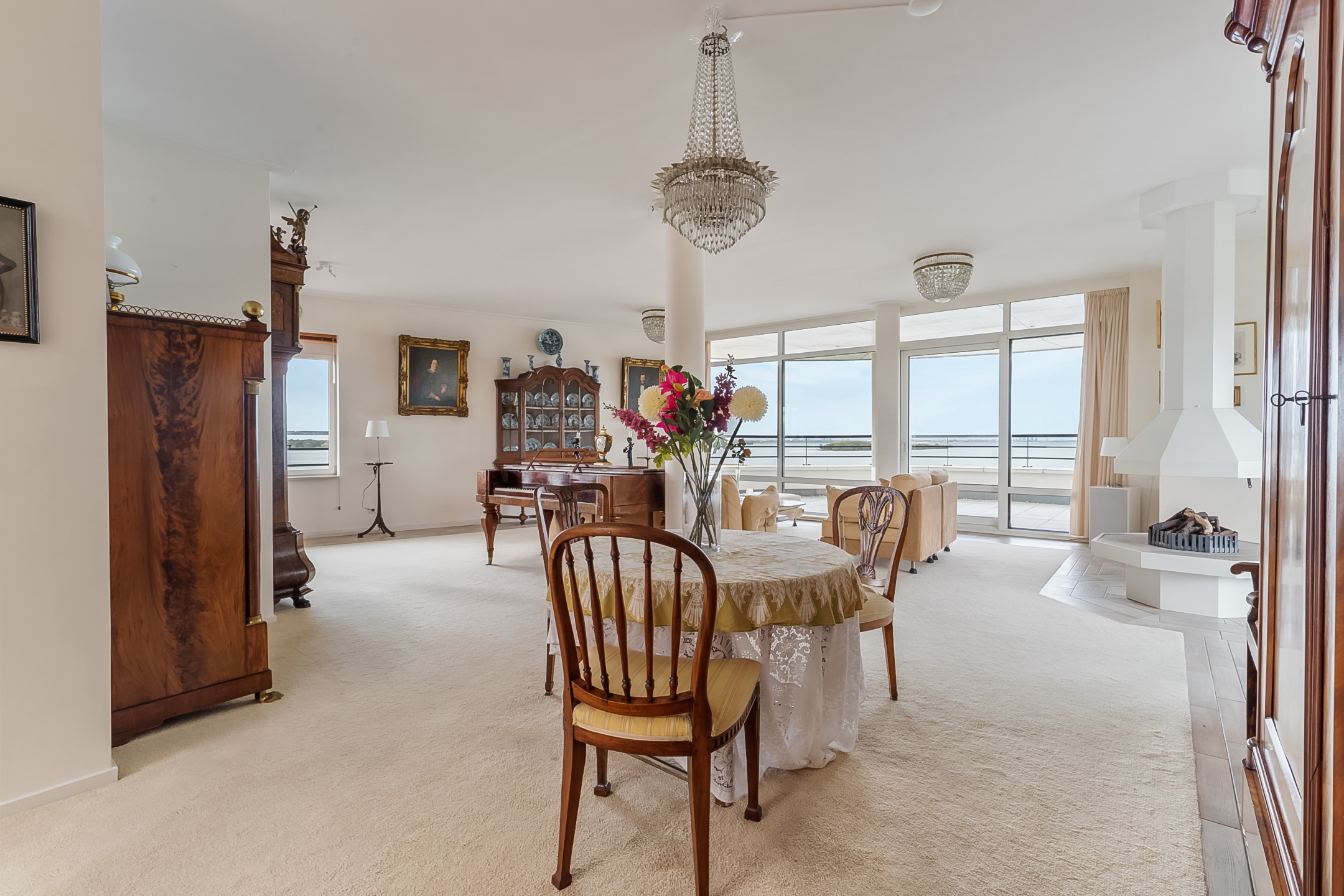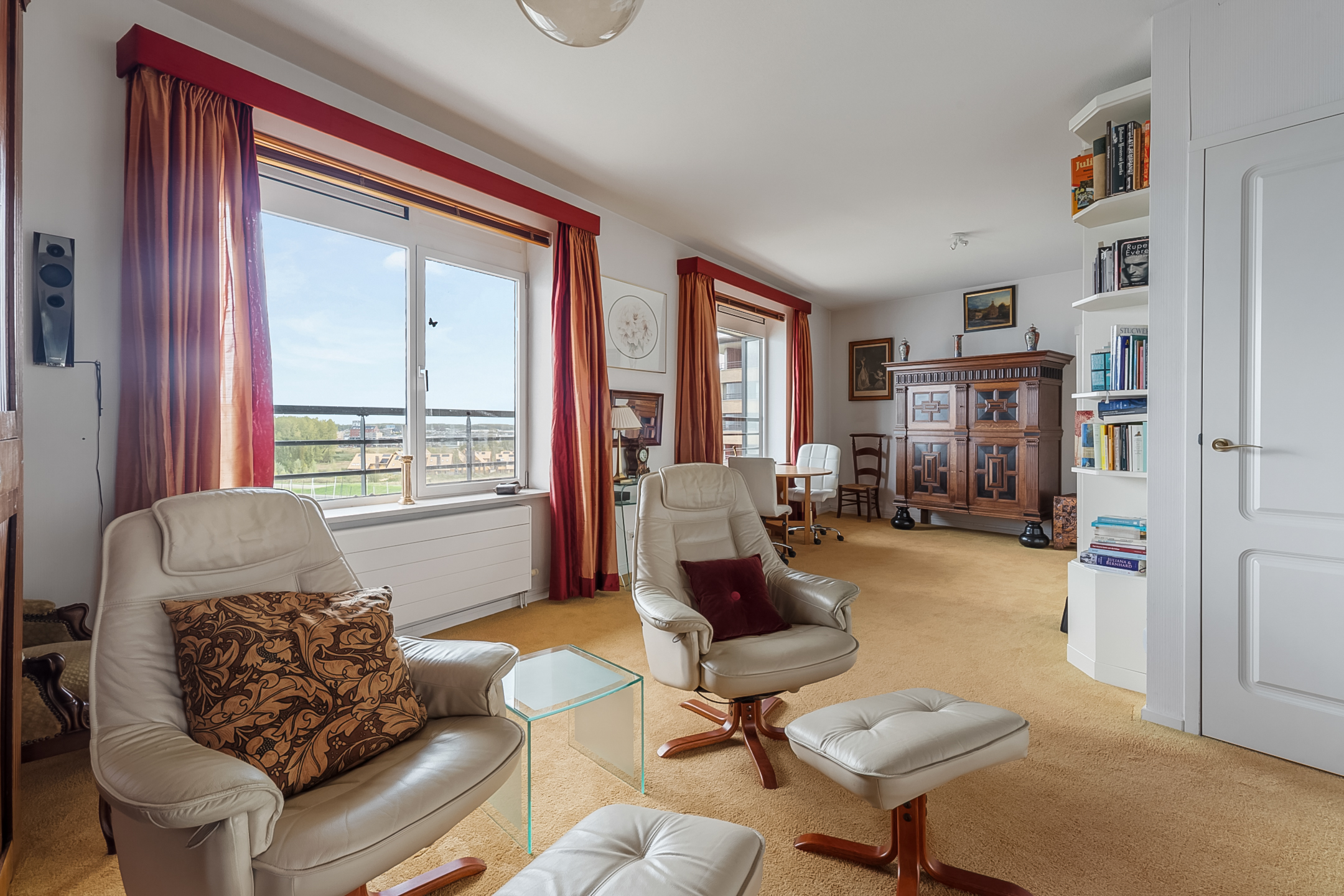 De royale woon- en eetkamer is voornamelijk op het Westen gericht en heeft een groot open terras (ca. 26m²) waar het zeer goed vertoeven is. Dit woongedeelte is bovendien voorzien van een (gas) open haard, een bijkomend voordeel van wonen op de bovenste verdieping!