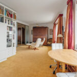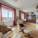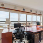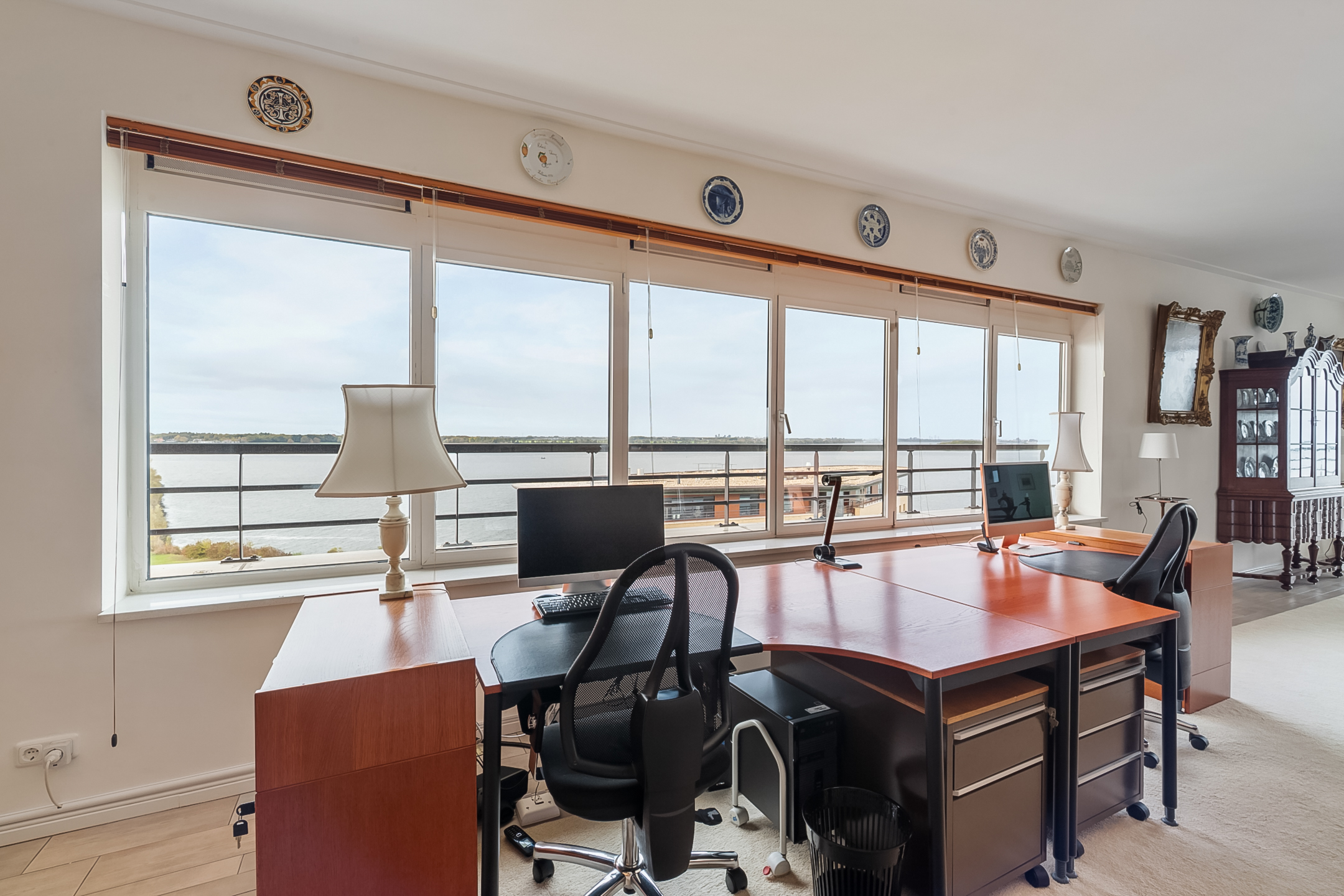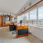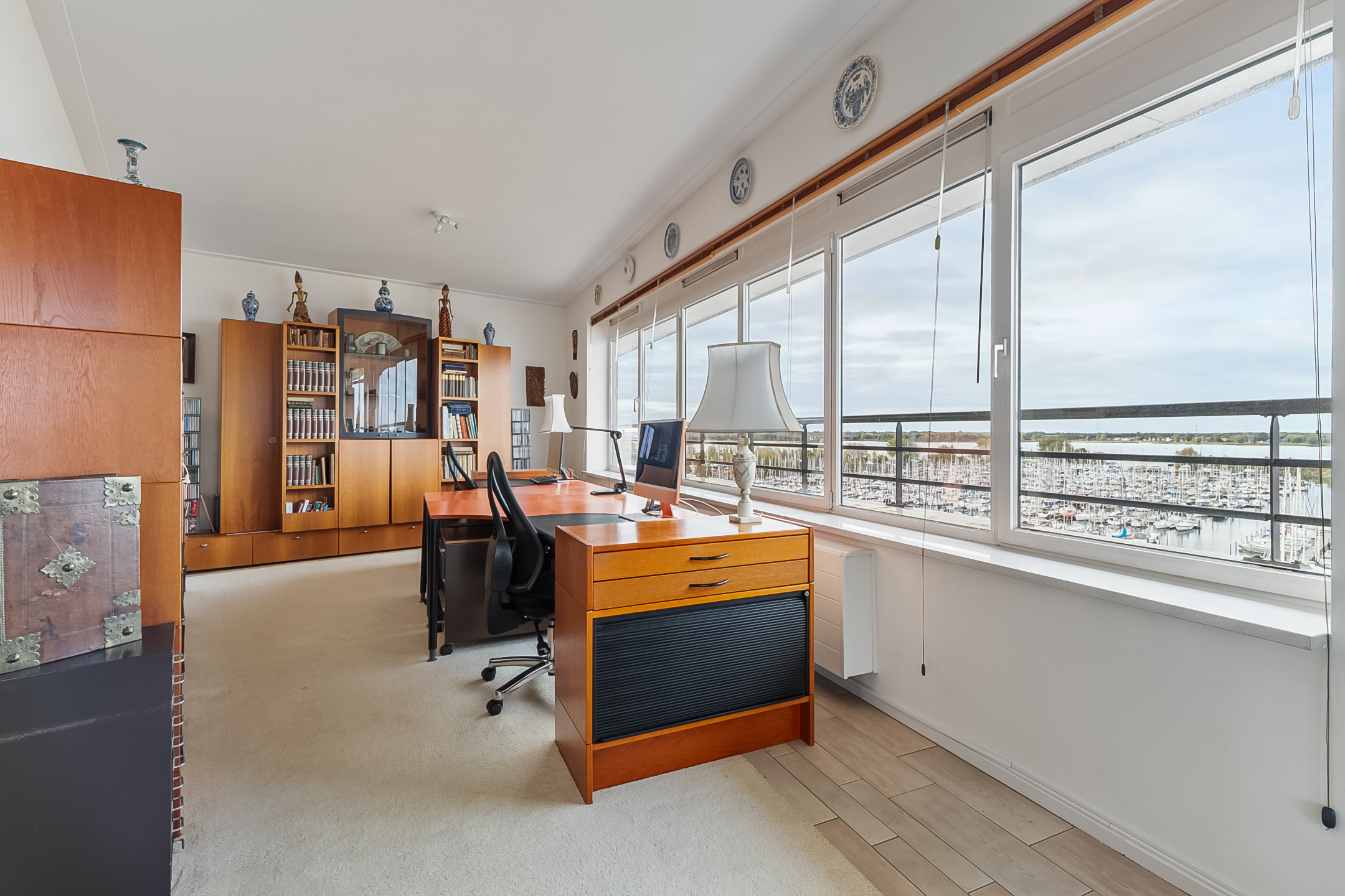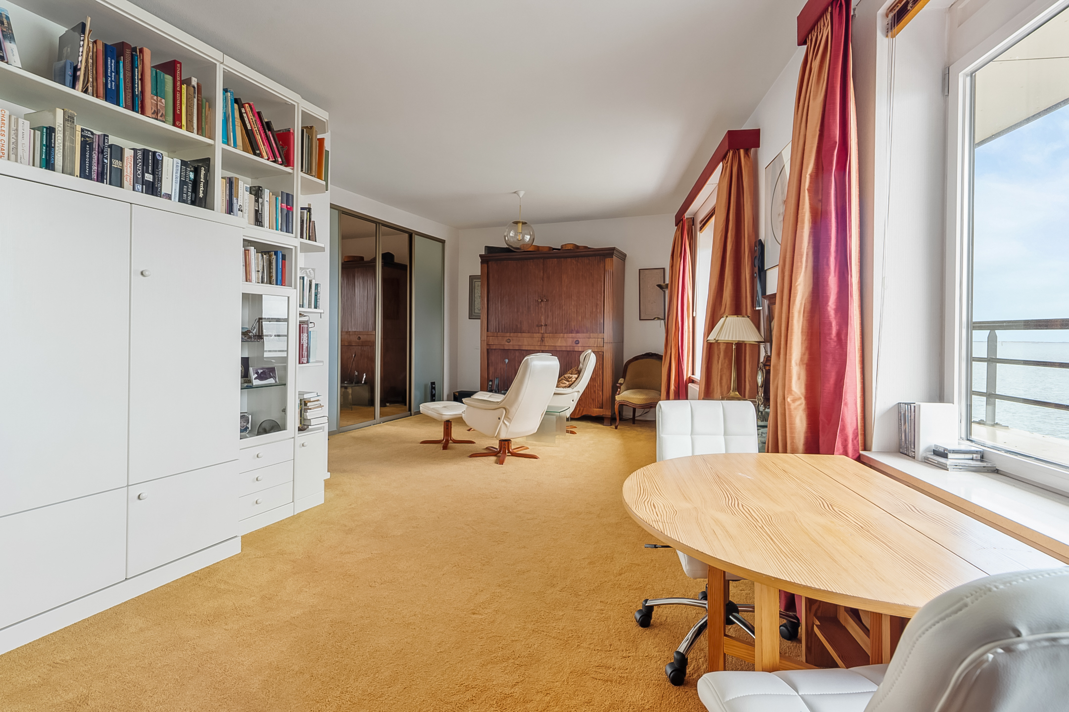 De woonkamer loopt over in een werkkamer met twee riante werkplekken die over de Marina naar het Zuiden blikken.