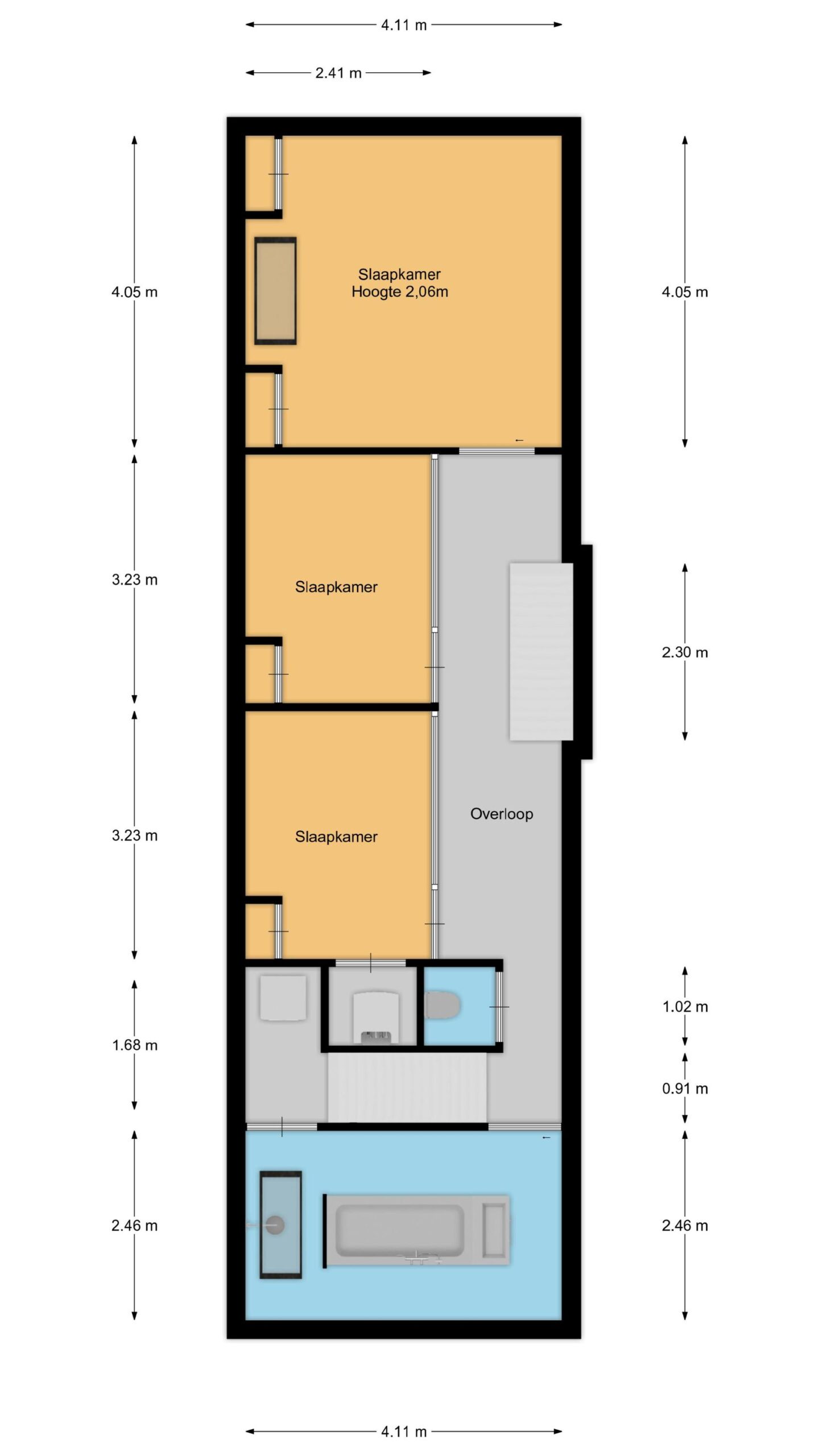 De badkamer is compleet uitgevoerd met ligbad, inloopdouche en wastafelmeubel. Op deze verdieping bevinden zich tevens een washok, technische ruimte en een separaat toilet.